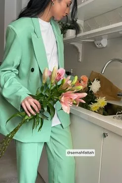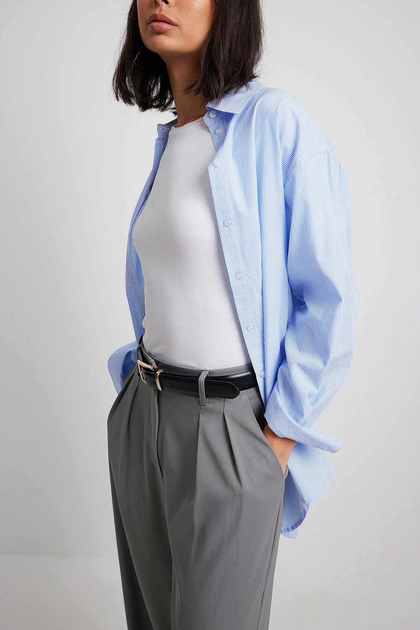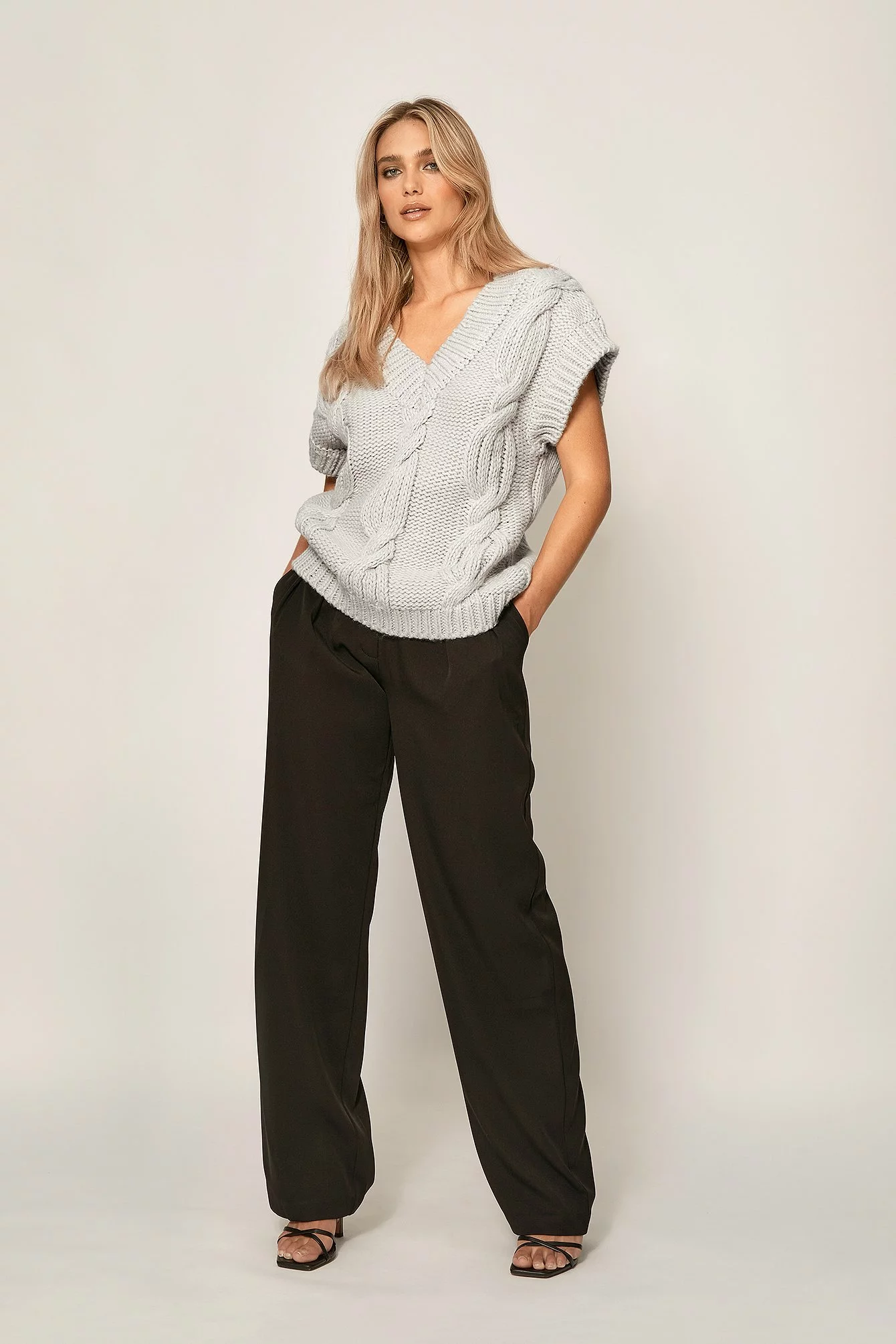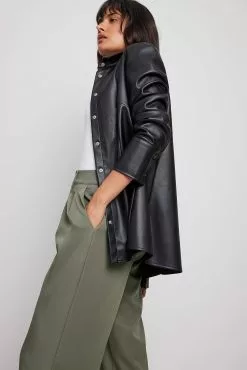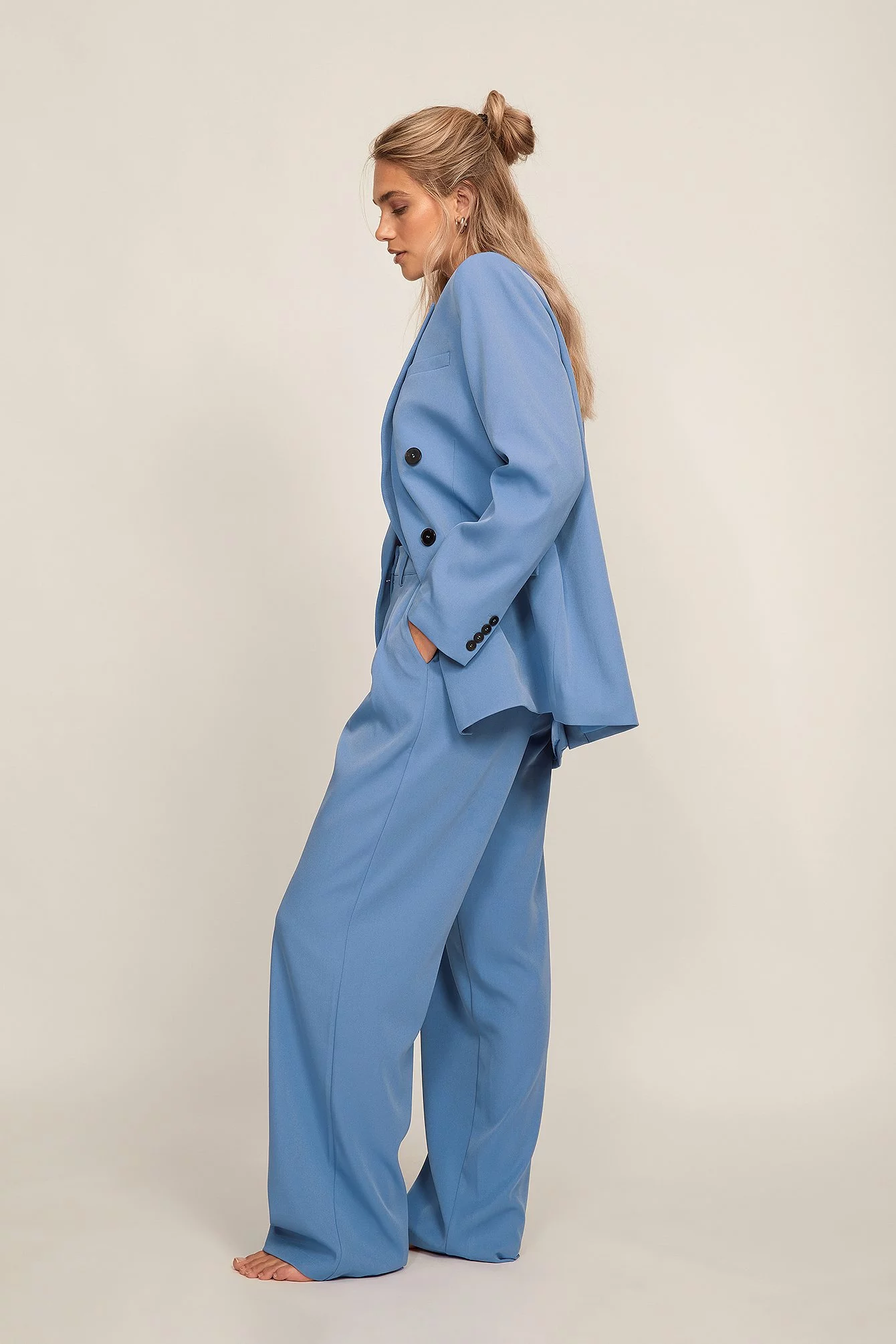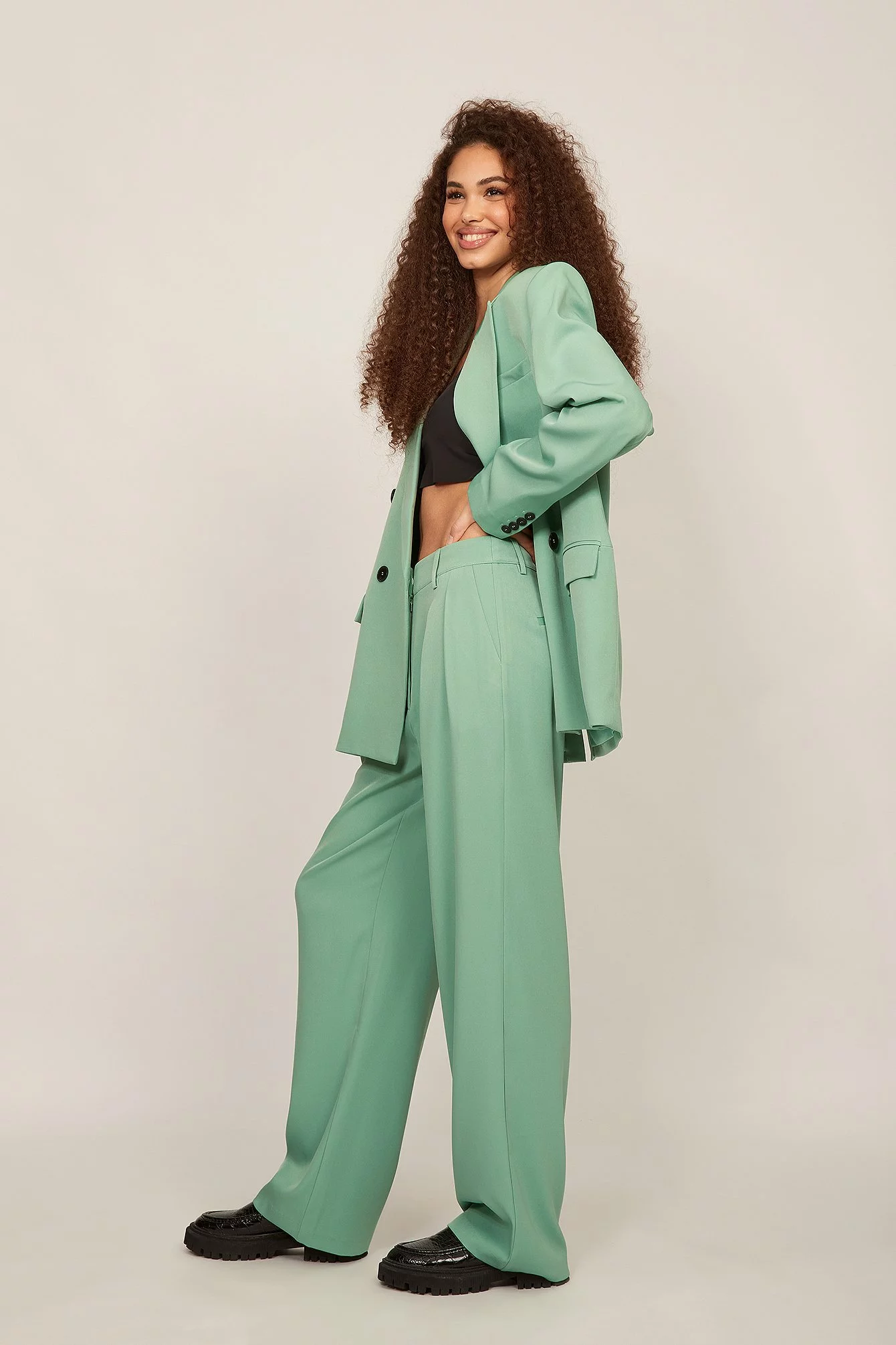 These trousers feature a high waist. They have a zipper, hook and button closure and belt loops. These trousers feature pleats at the waist, side pockets, back mock pockets and wide legs.