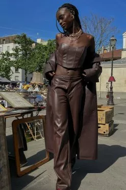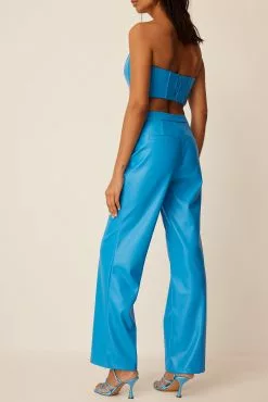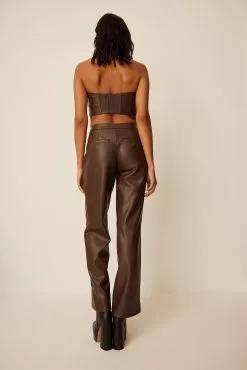 These trousers feature a faux leather, back mock pockets and a zipper and hook closure.