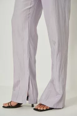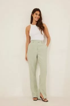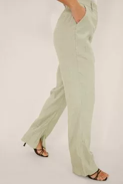 These pants feature a high waist, belt loops, a zipper, hook and button closure, two front pockets, two back mock pockets, side slits, a structured design and a flowy fit.
