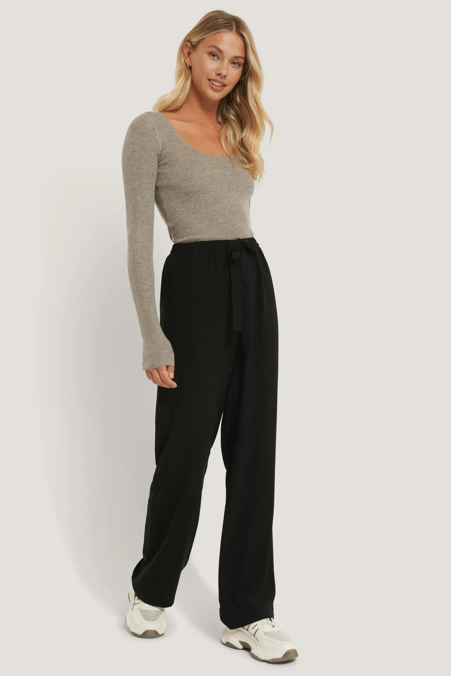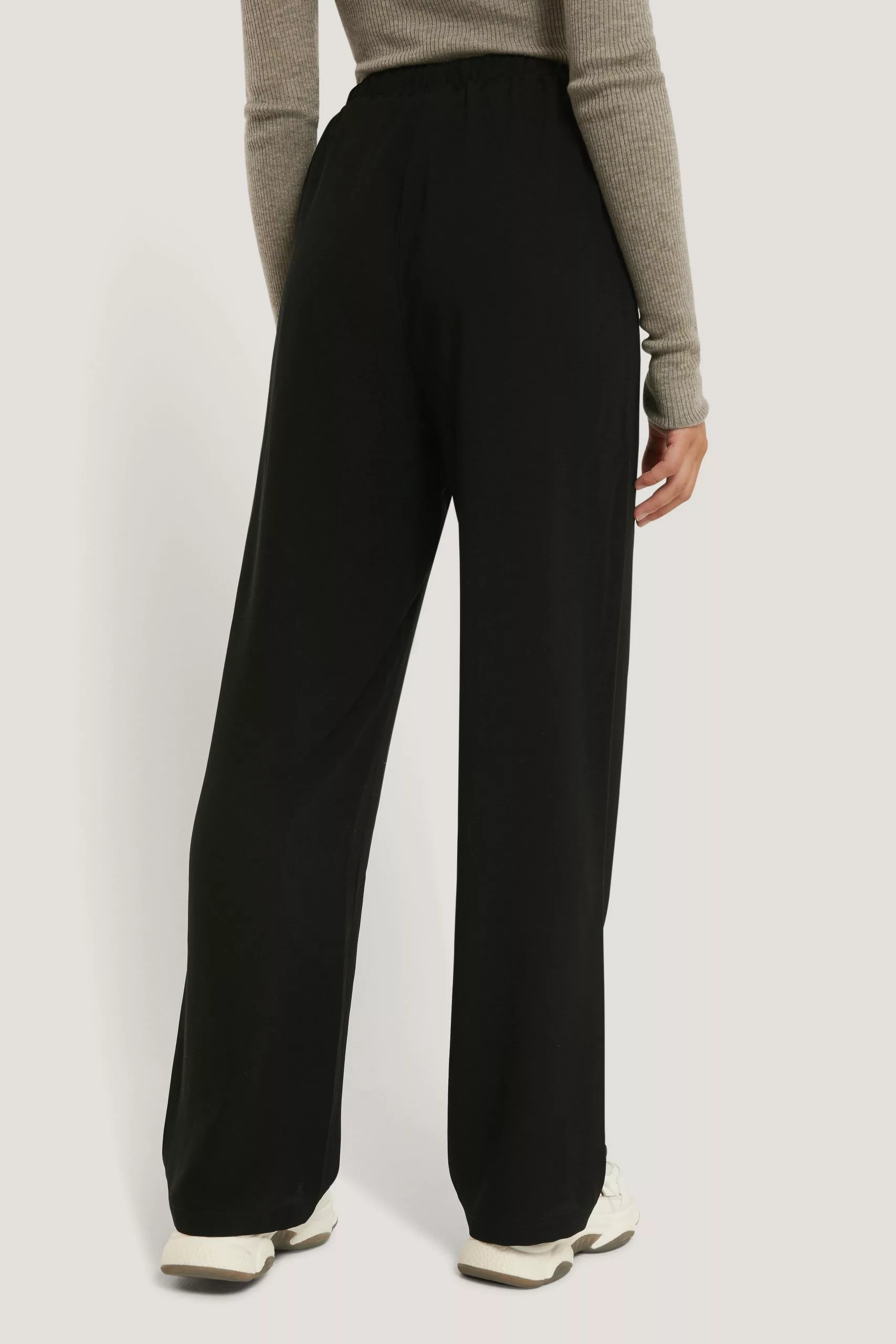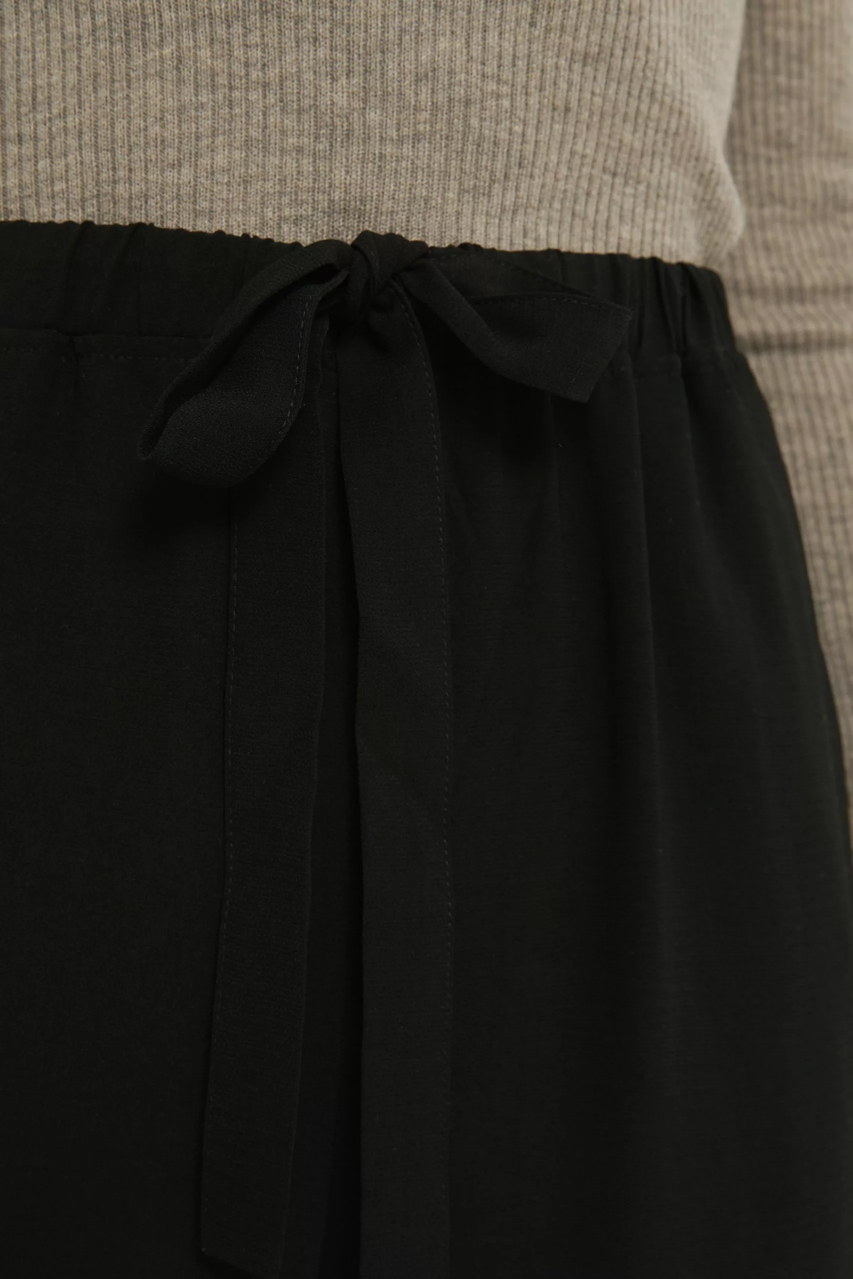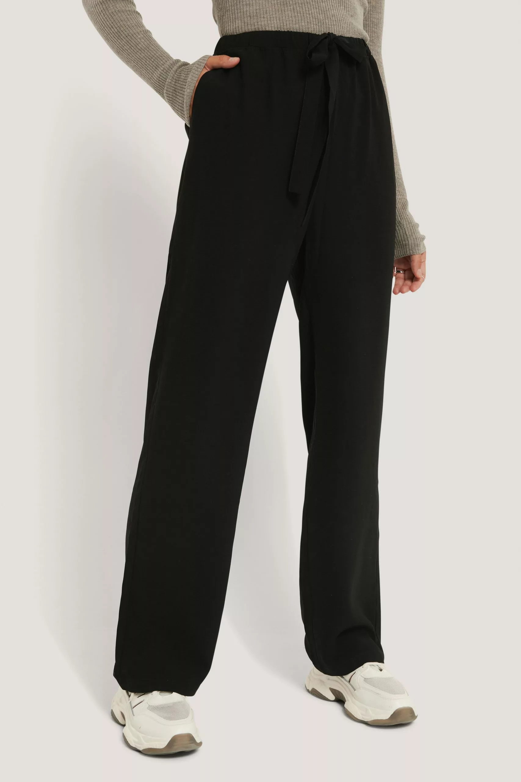These pants feature an elastic waistband with a self-tie band, two side pockets and a wide leg.