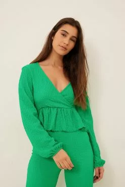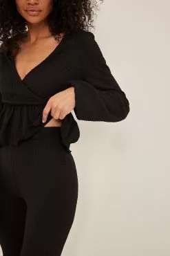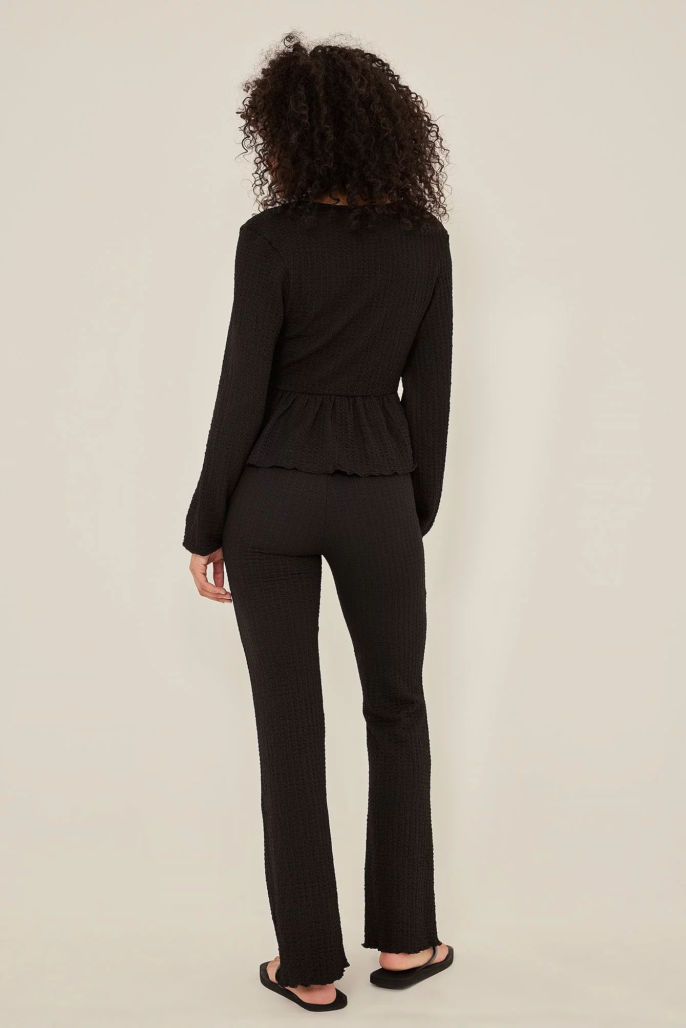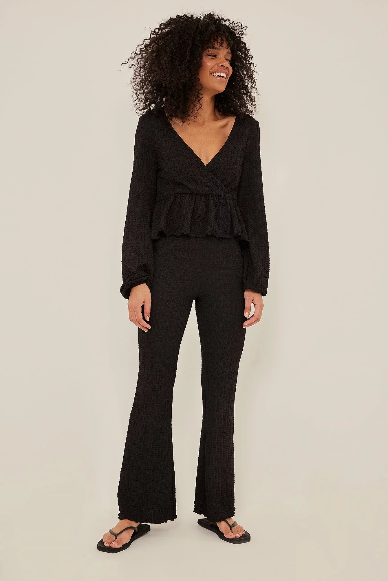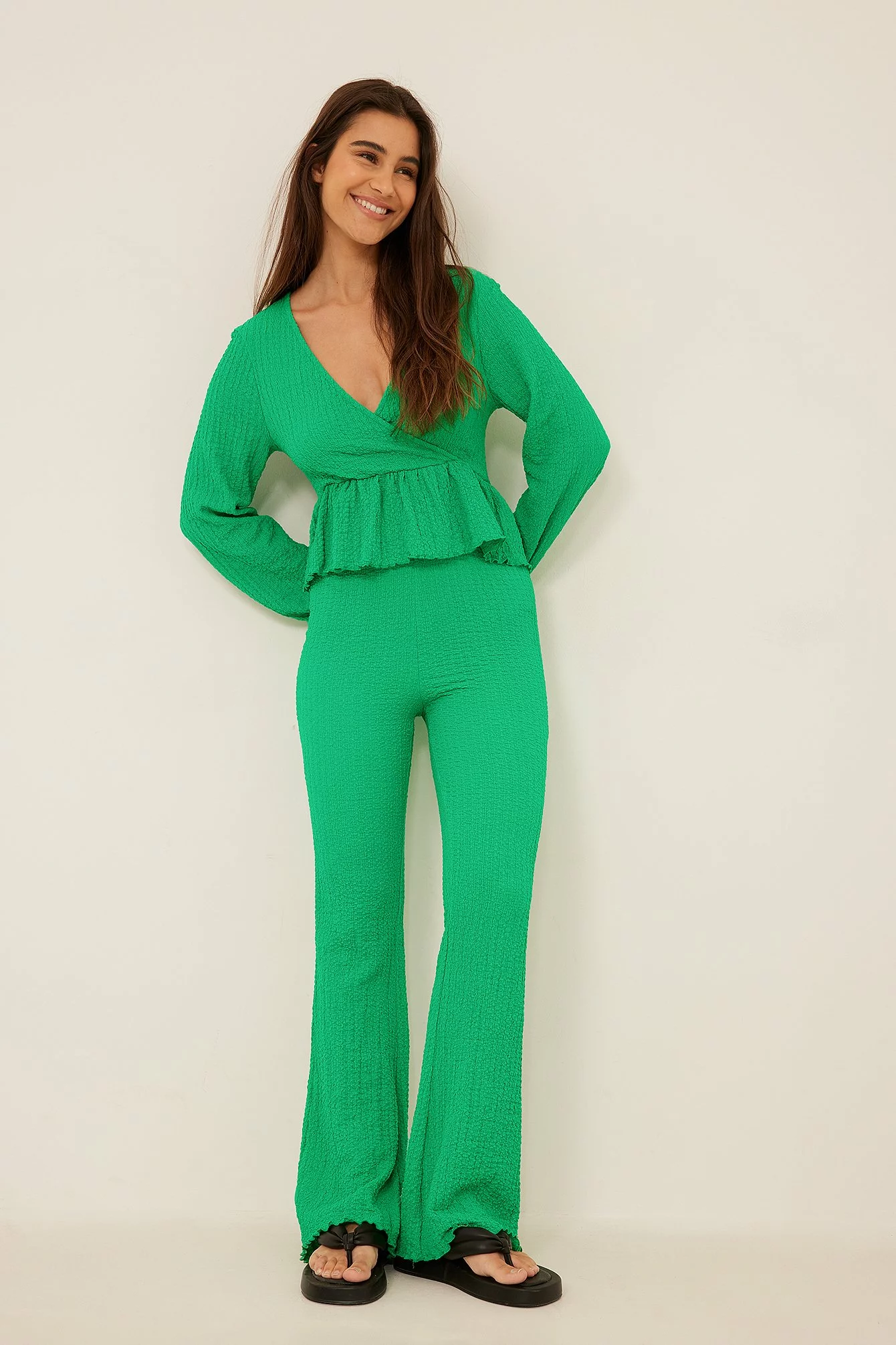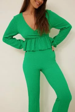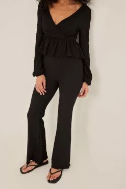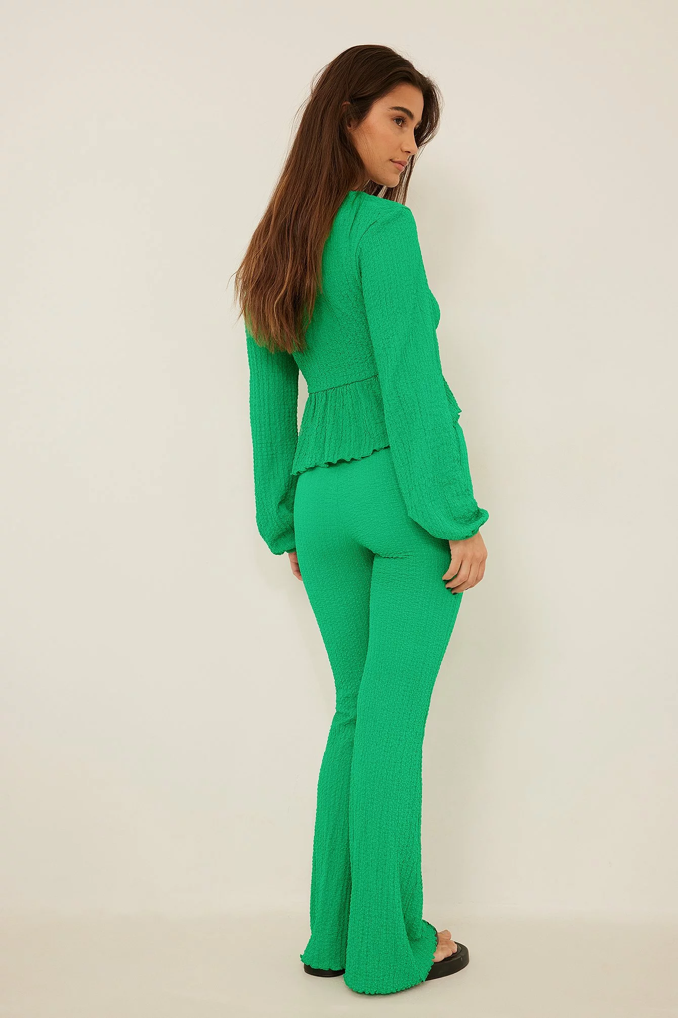These trousers feature a high waist with an elasticized waistband, a crepe design and flared legs.