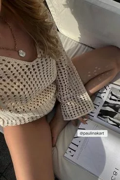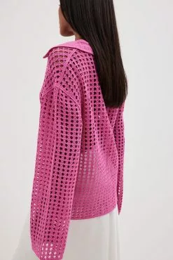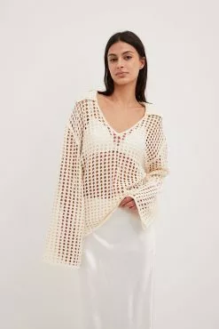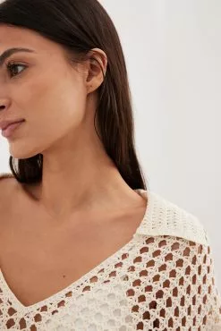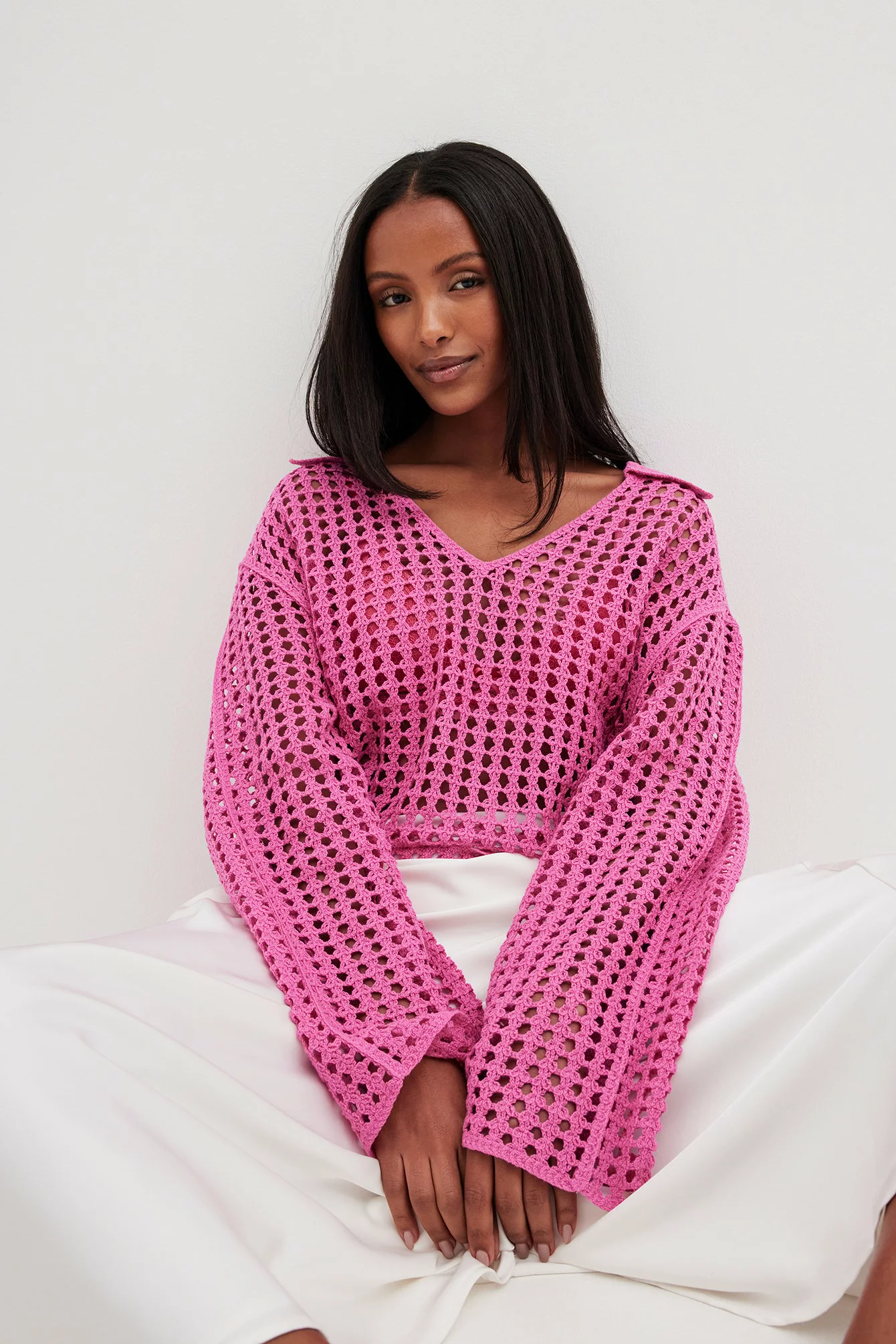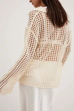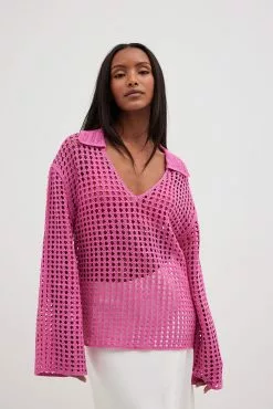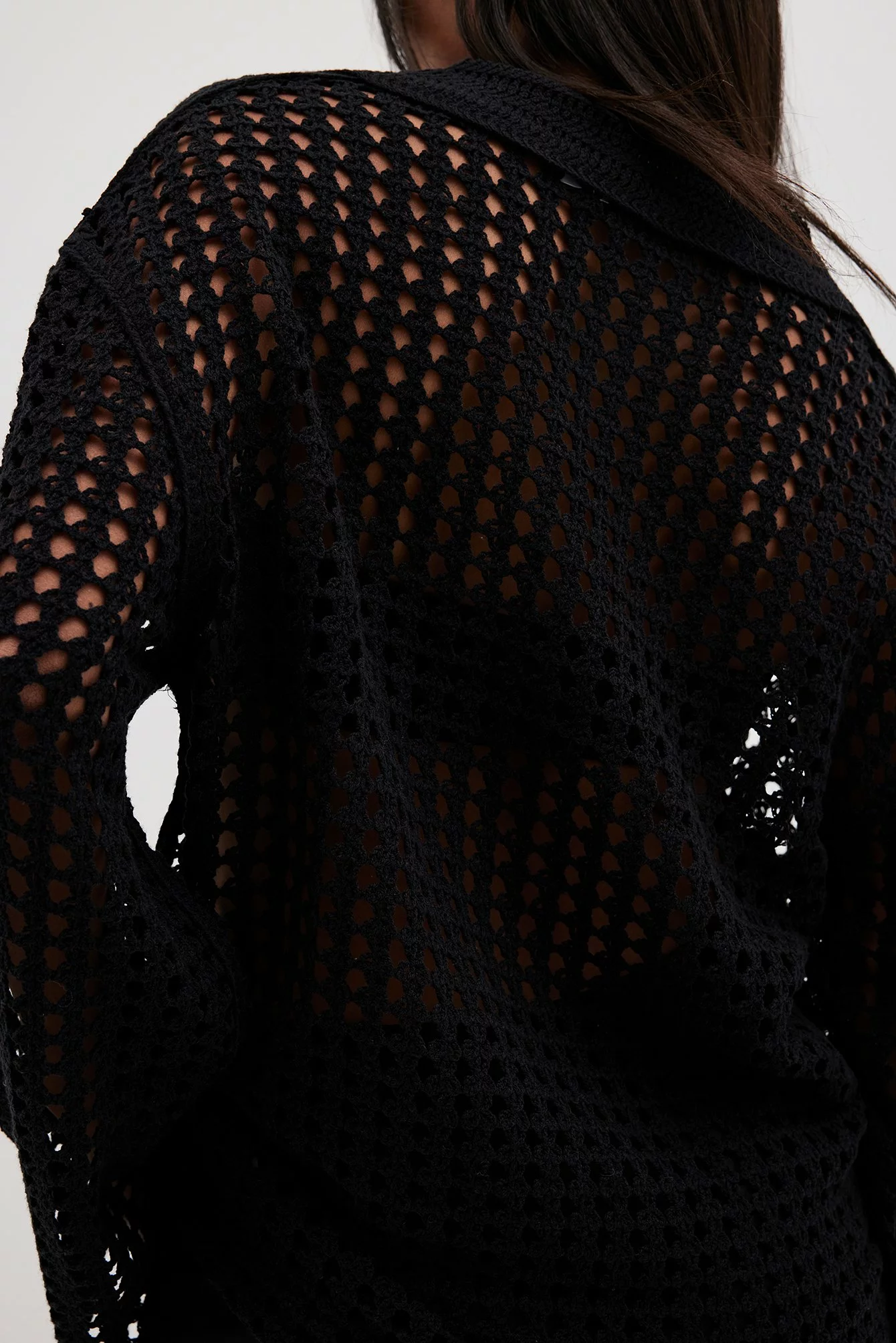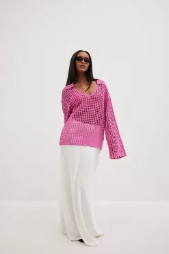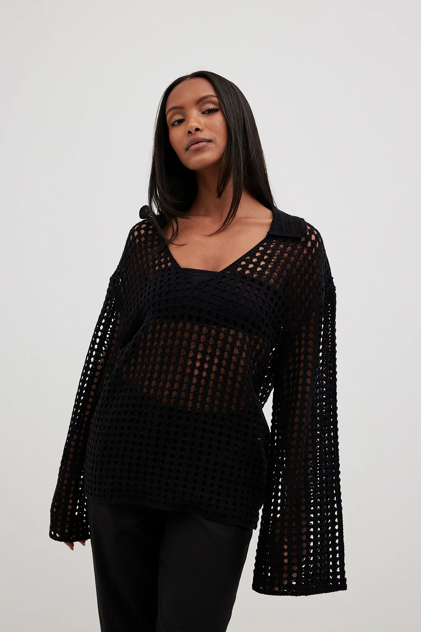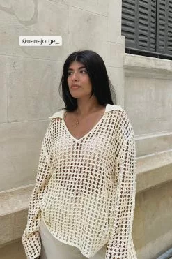 This sweater features a knitted crochet design and an oversized fit. It has a classic collar and wide long sleeves.