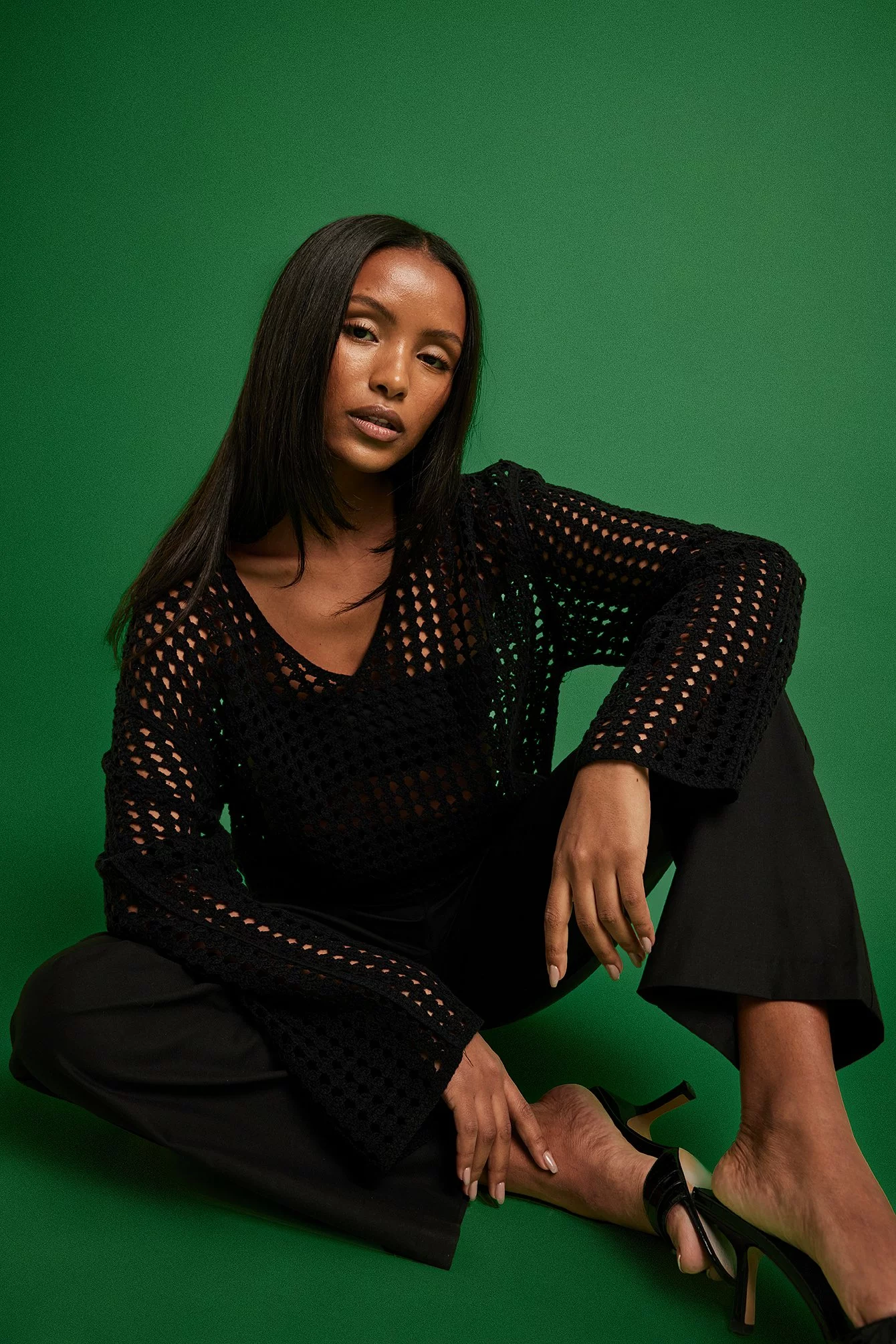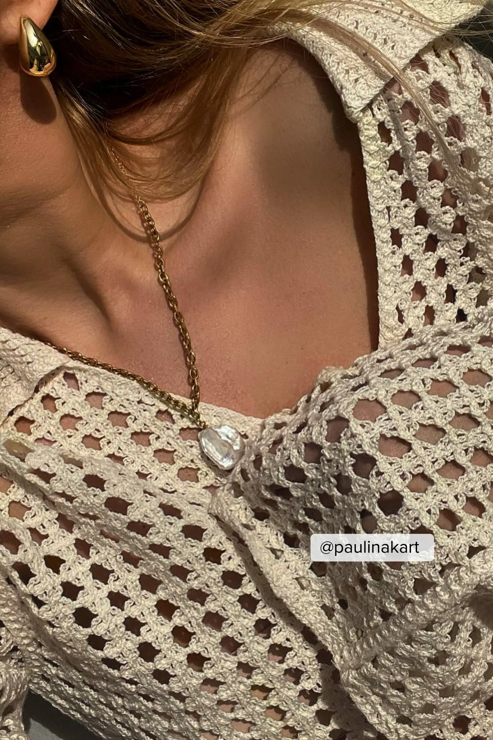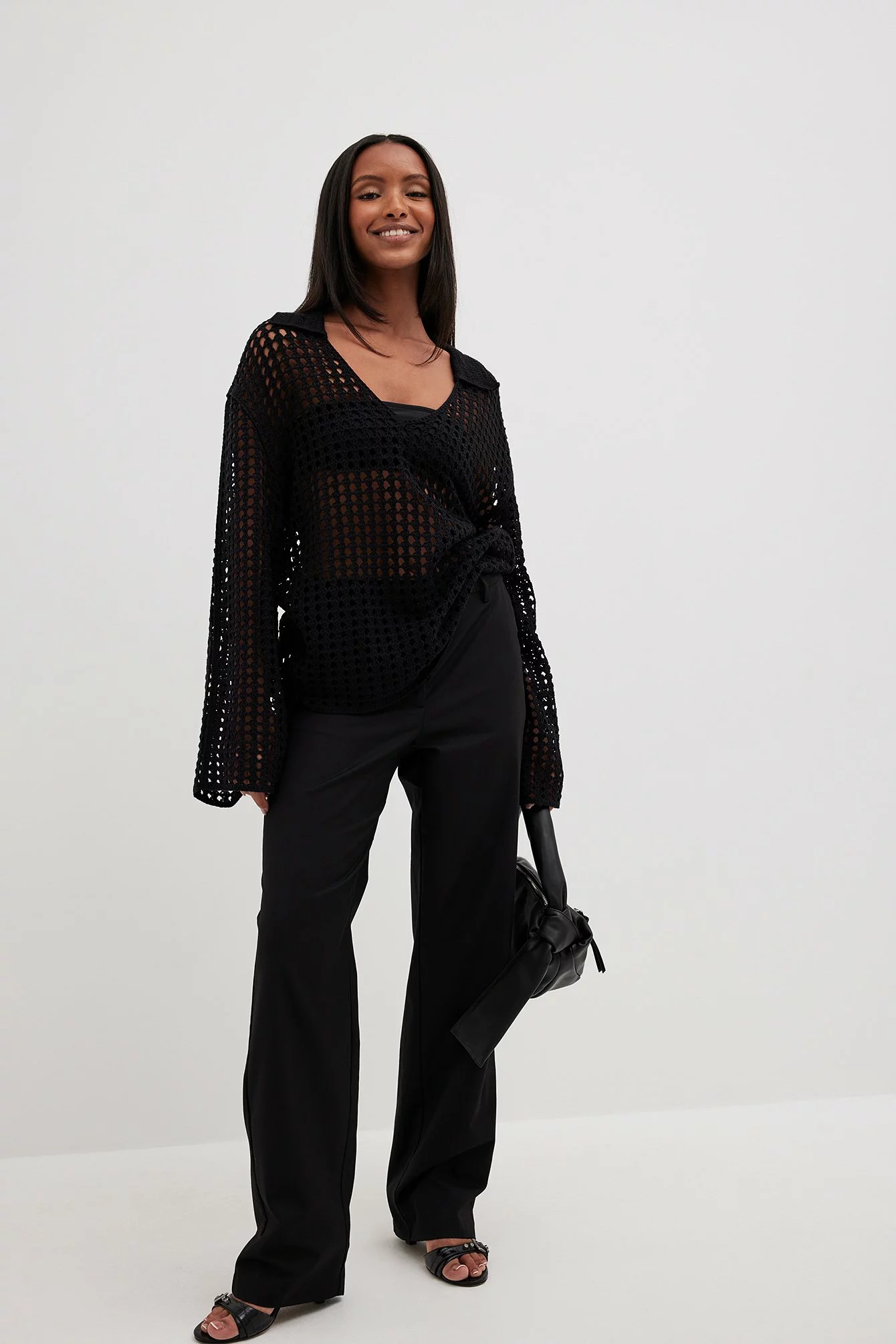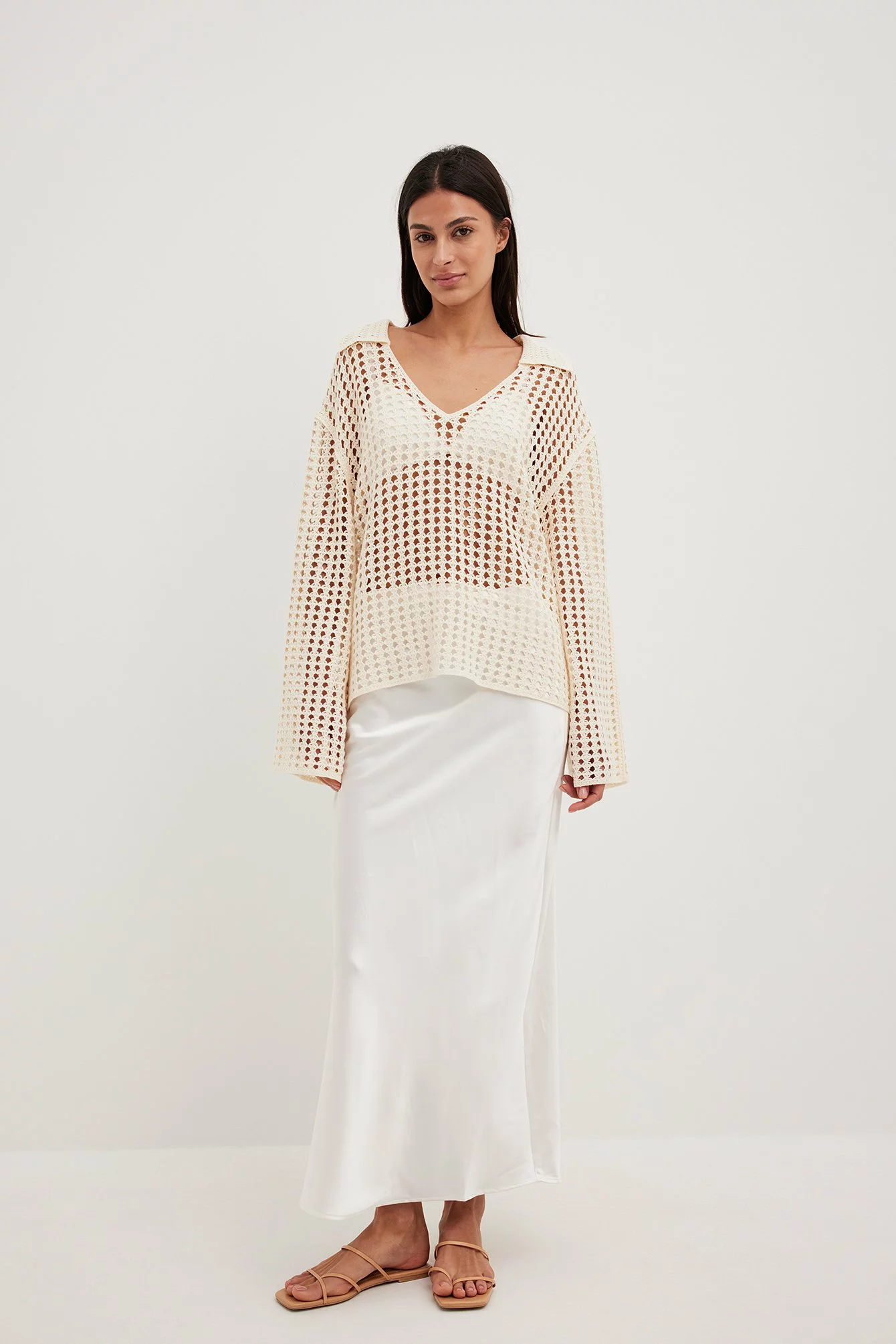 This sweater features a knitted crochet design and an oversized fit. It has a classic collar and wide long sleeves.