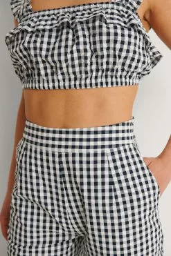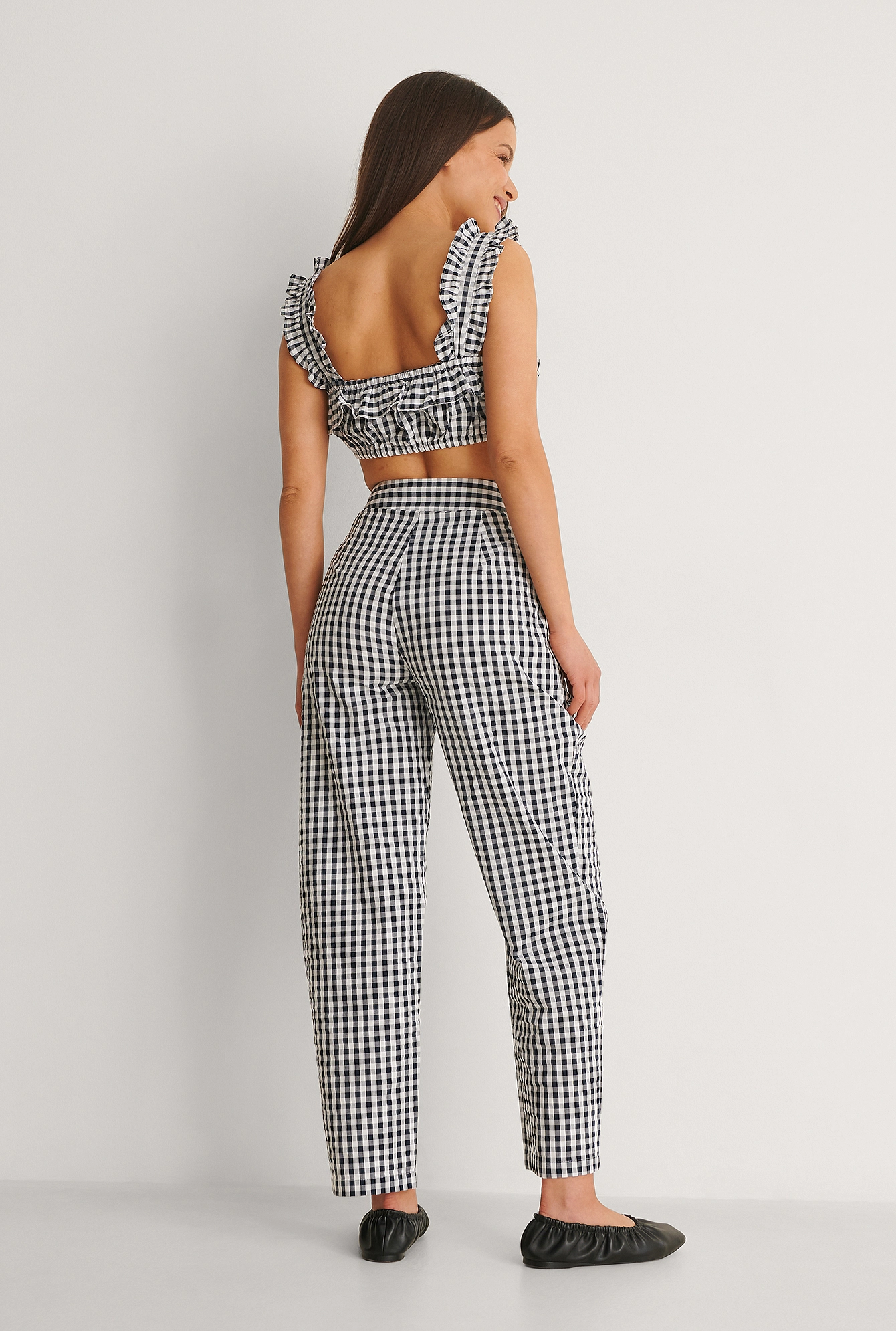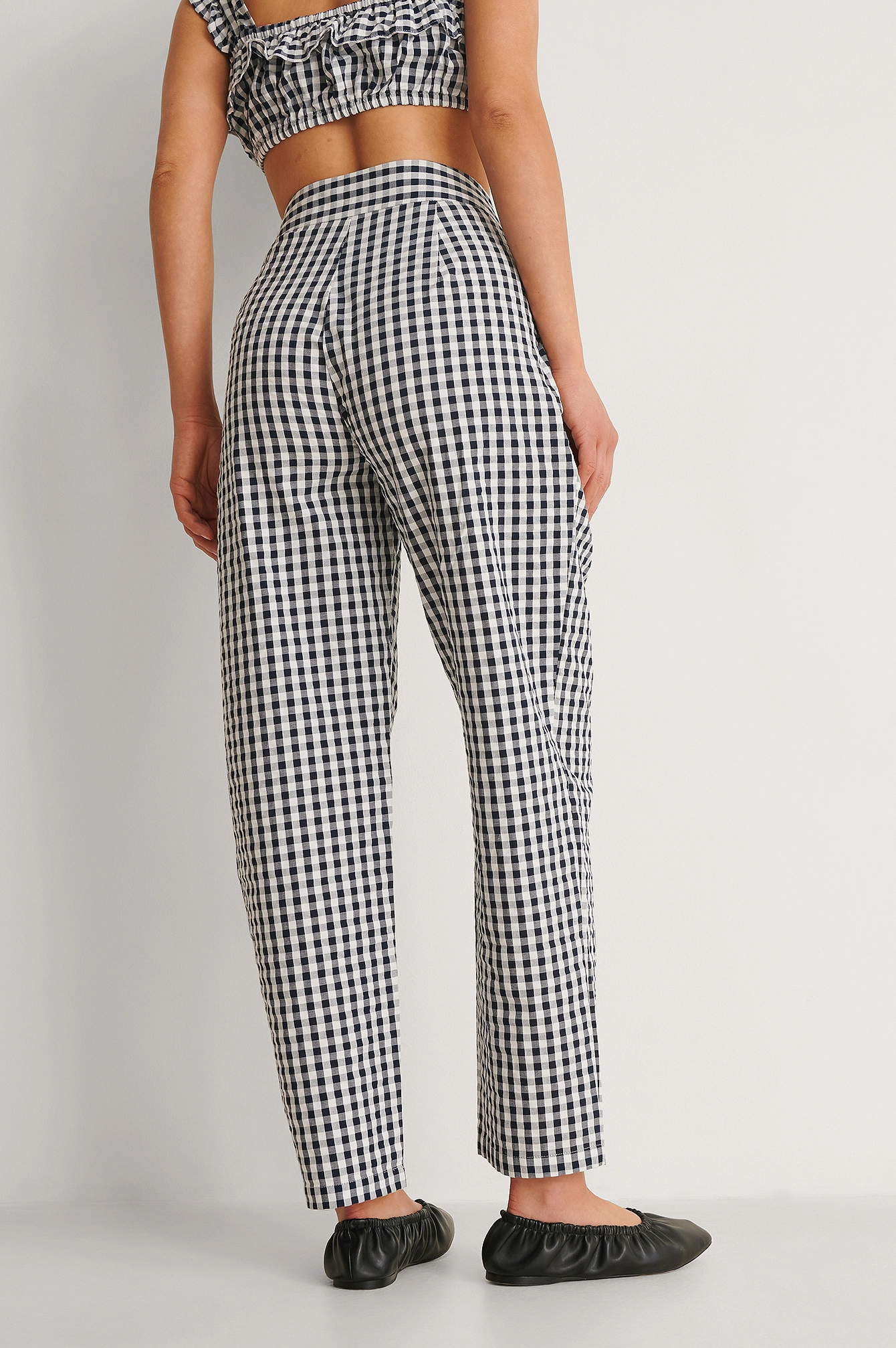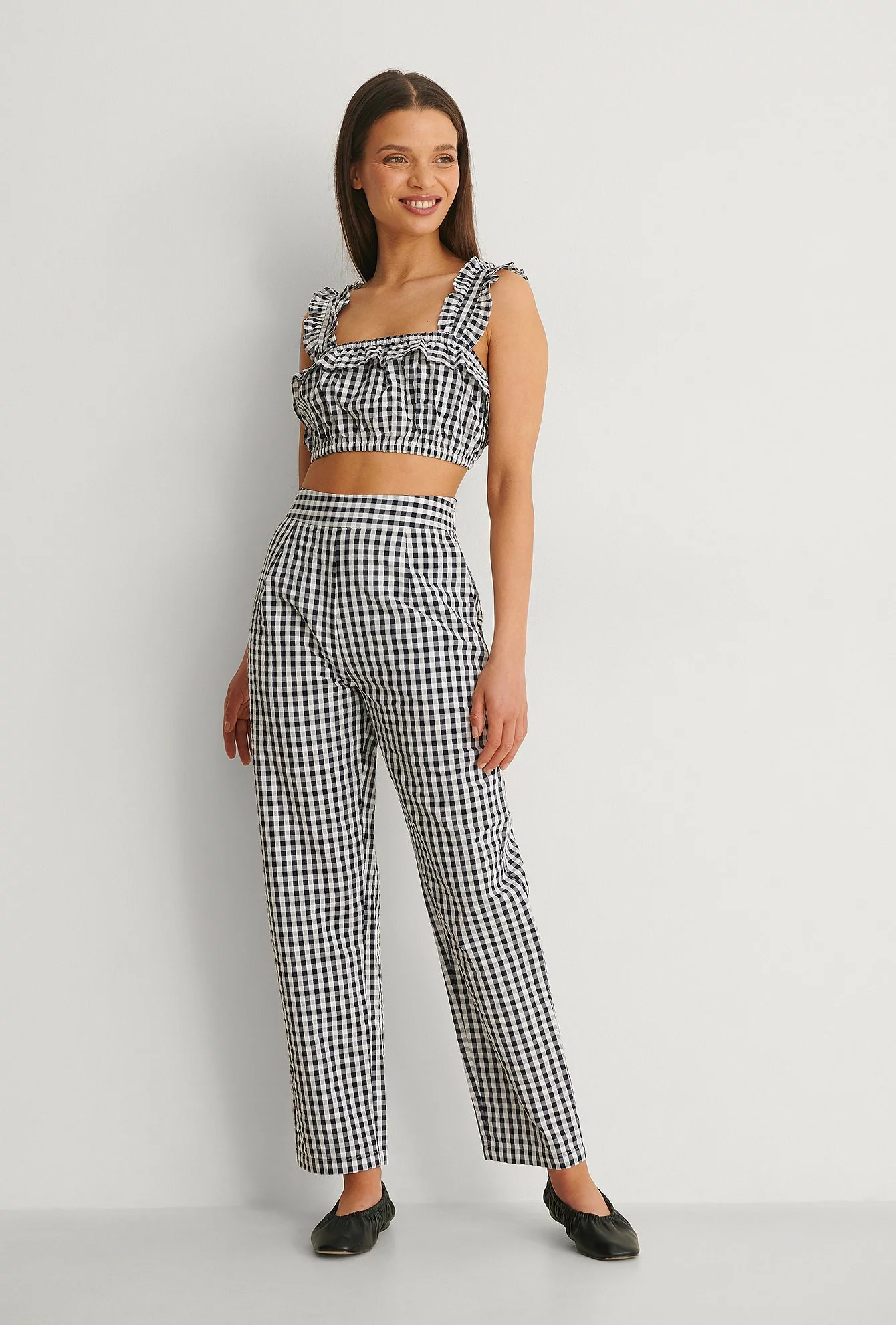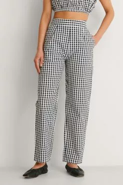 These pants feature a high waist with a side zipper closure. They have 2 side slanting pockets and a straight leg.