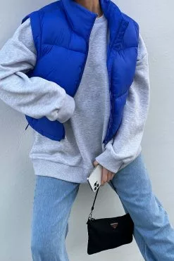 This vest is padded and features a high neck, a sleeveless design, a zipper closure down the front and two zipper pockets.