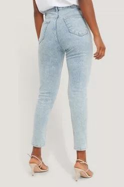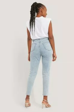 These jeans feature a high waist, a zipper and button closure, a five-pocket design, ripped knee details, a slim fit and slight cropped length.