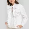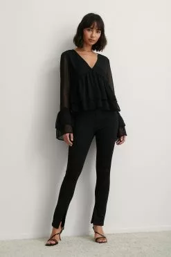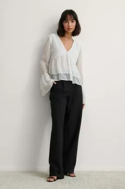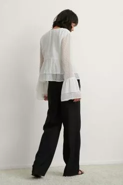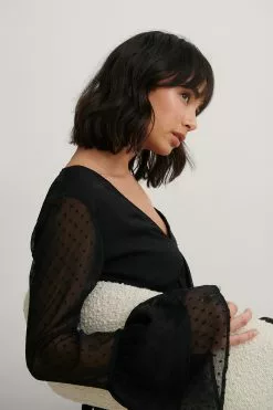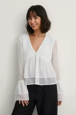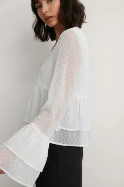 This blouse features a v-neck design, seethrough long sleeves with wide flounced details on the cuffs, a flounced detail around the waist, a square, dotted pattern all over and a lining.