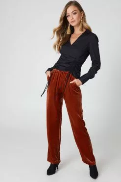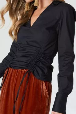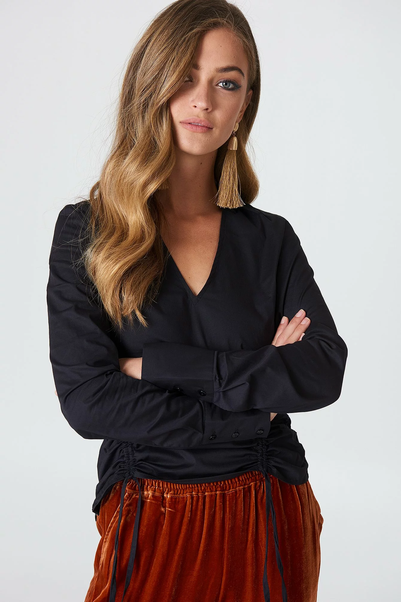 The Drawstring Asymmetric Shirt by NA-KD features a collared neckline, a rounded bottom hem, ruched drawstring closures, a v-neckline, and three button closures at each cuff.