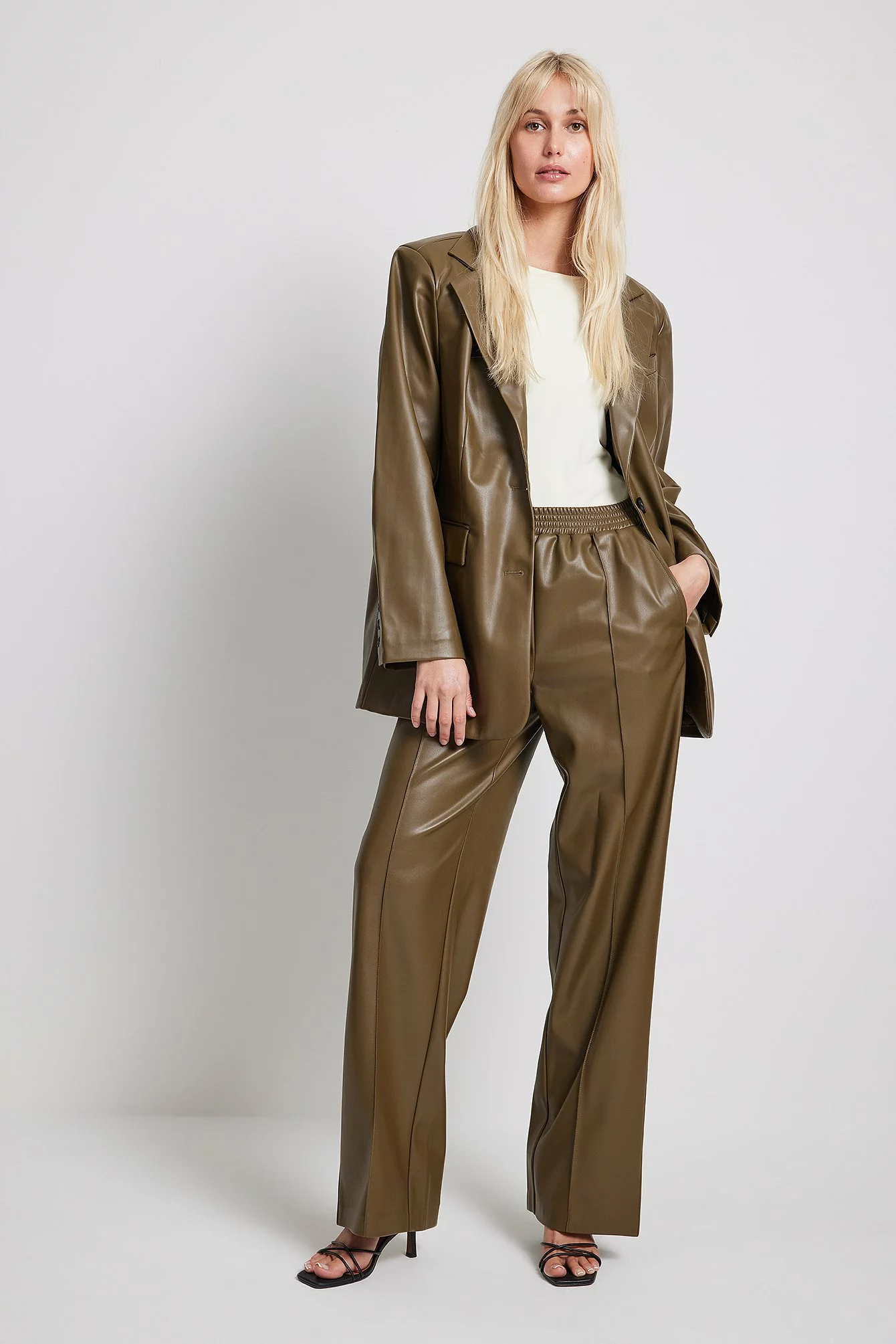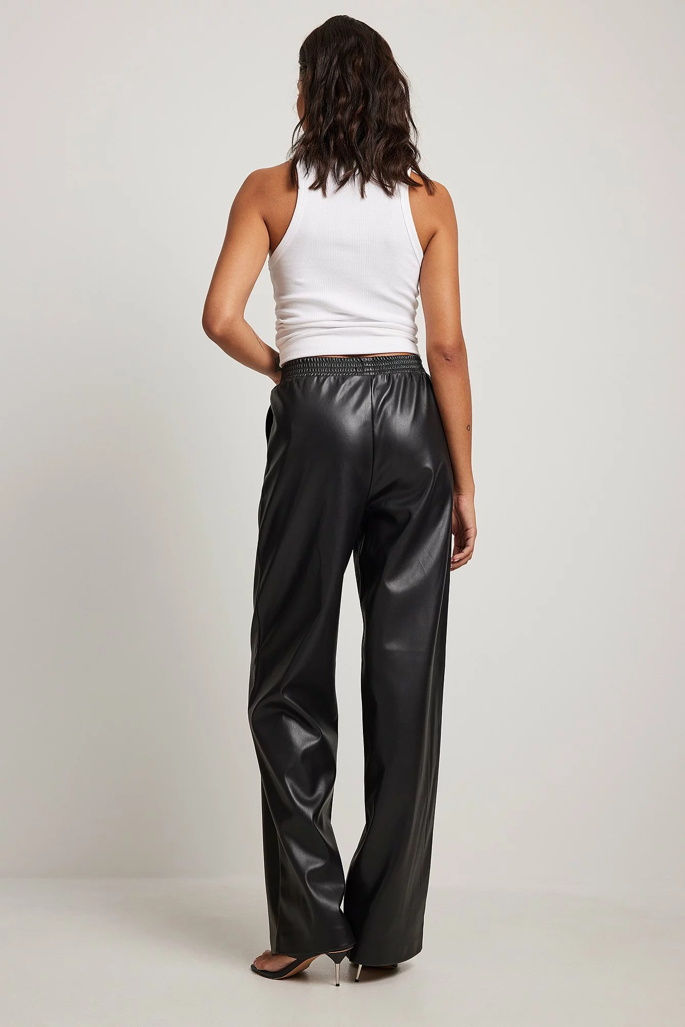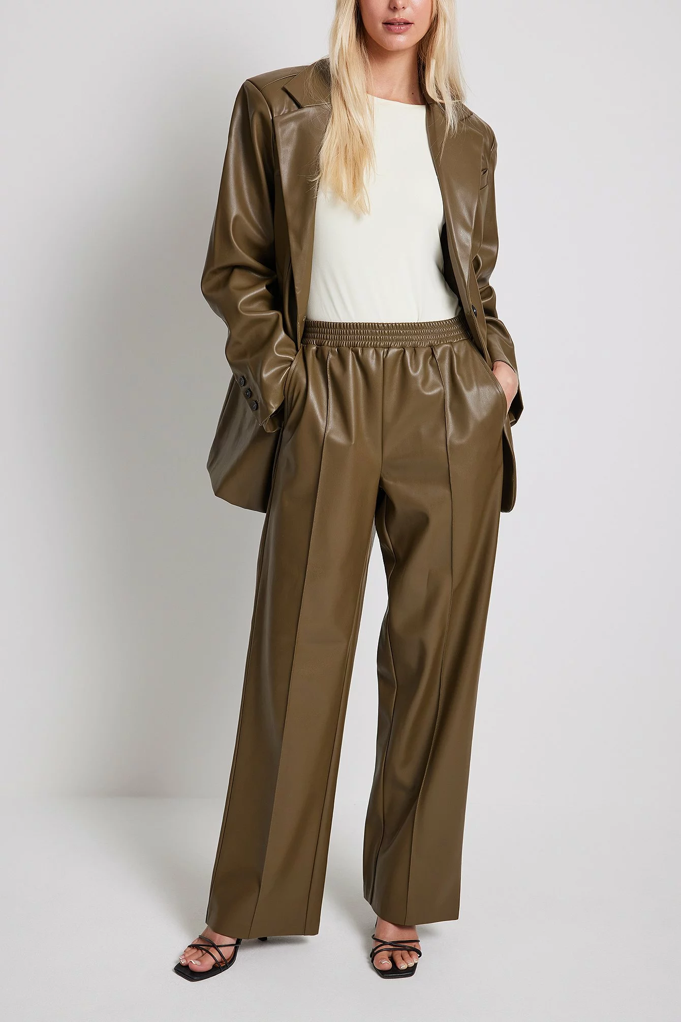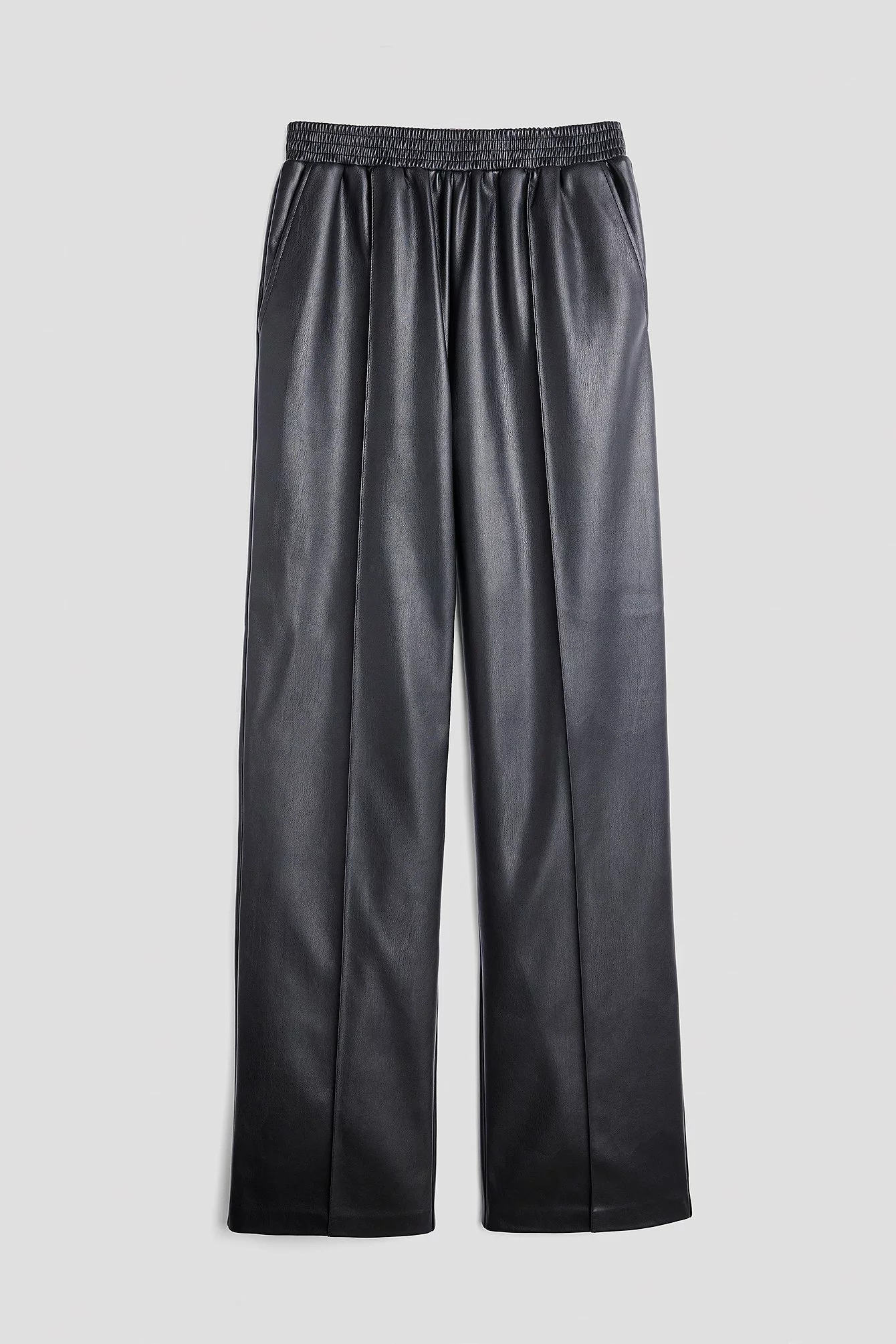 These trousers feature an elastic waistband. They have 2 pockets on the front and straight legs with a pleat detail along each leg. These trousers feature a slightly stretchy faux leather material in PU. Inseam length in size 36: 83 cm / 32.67 in.