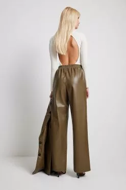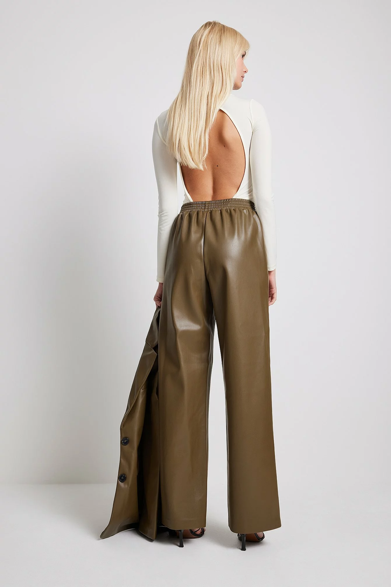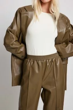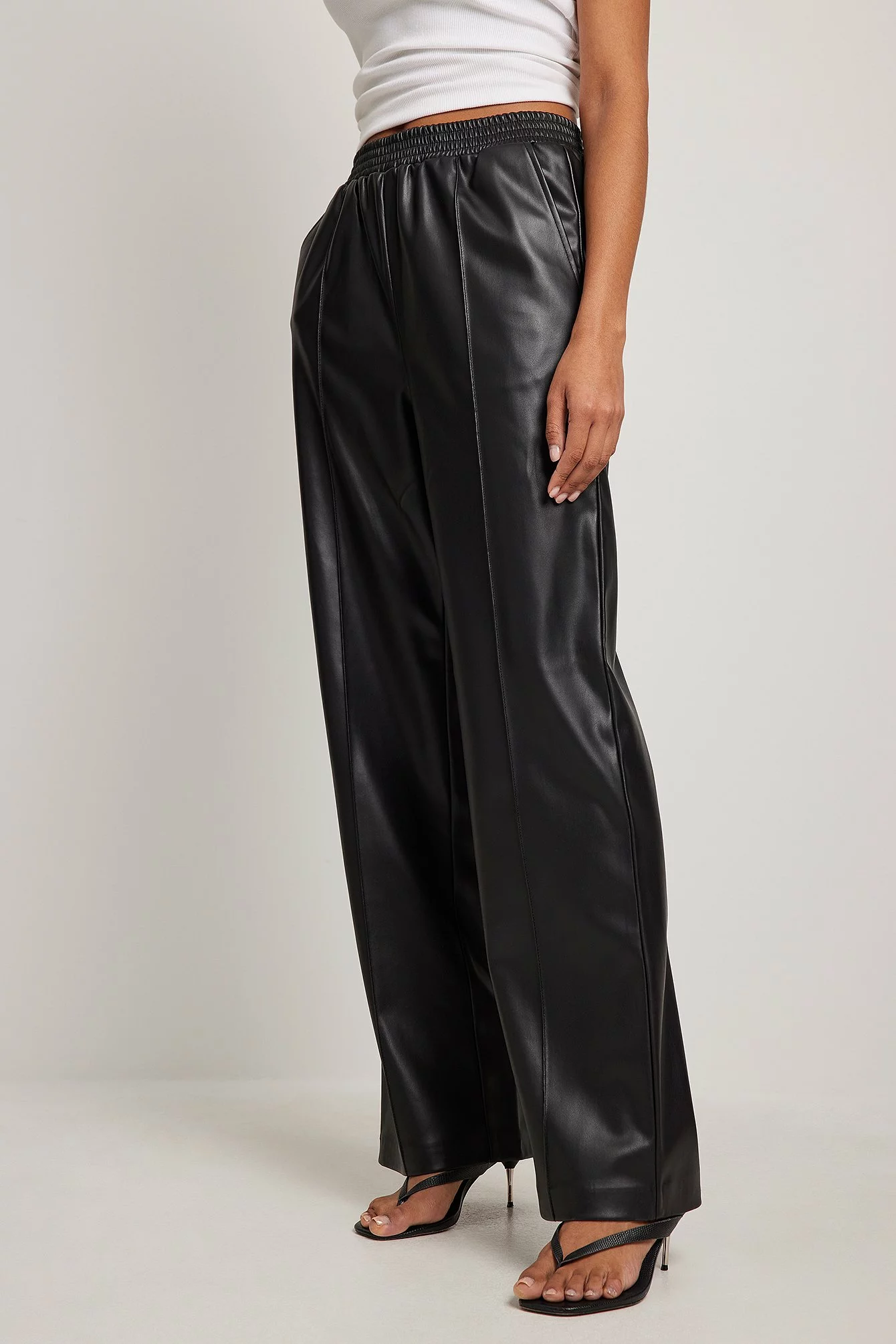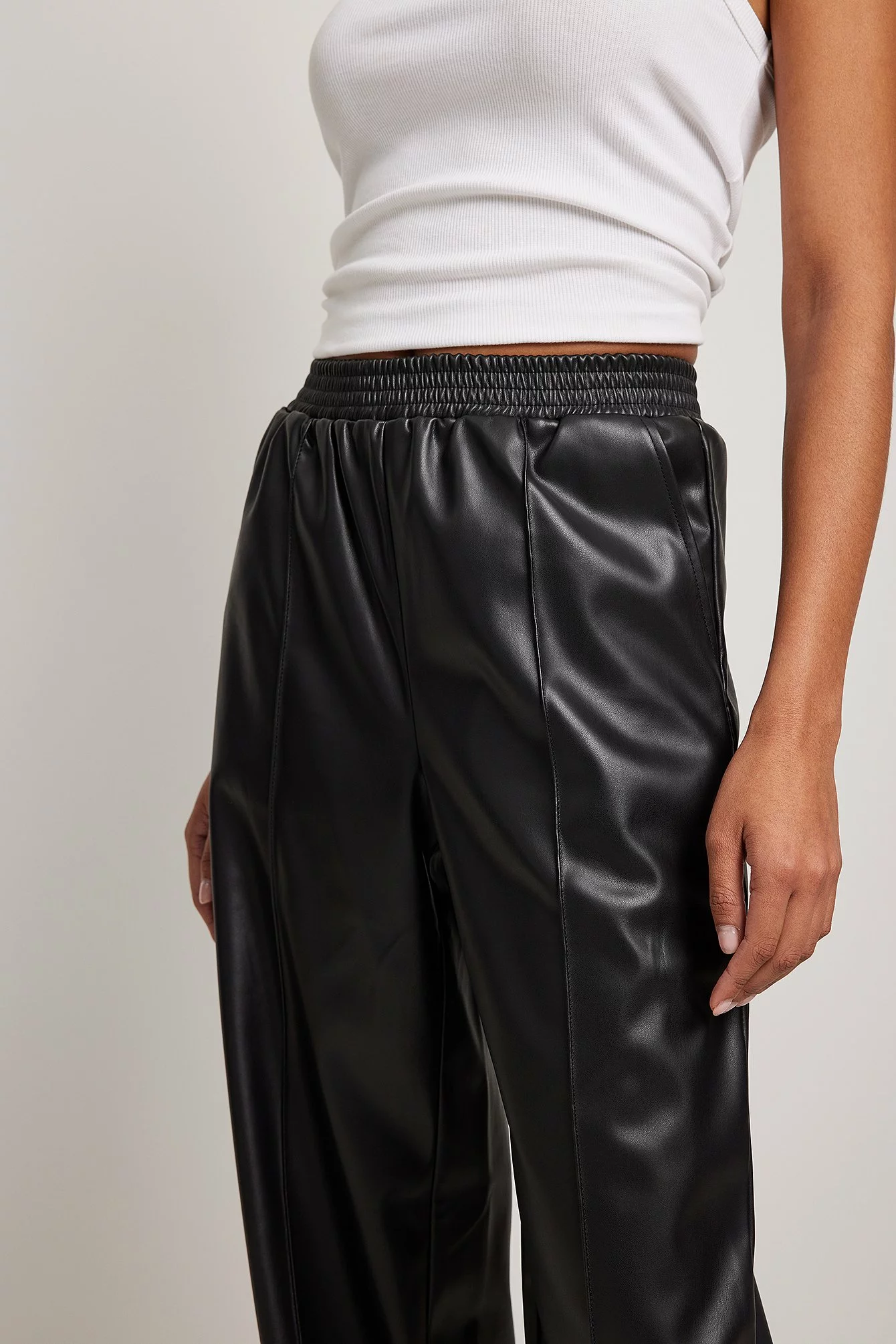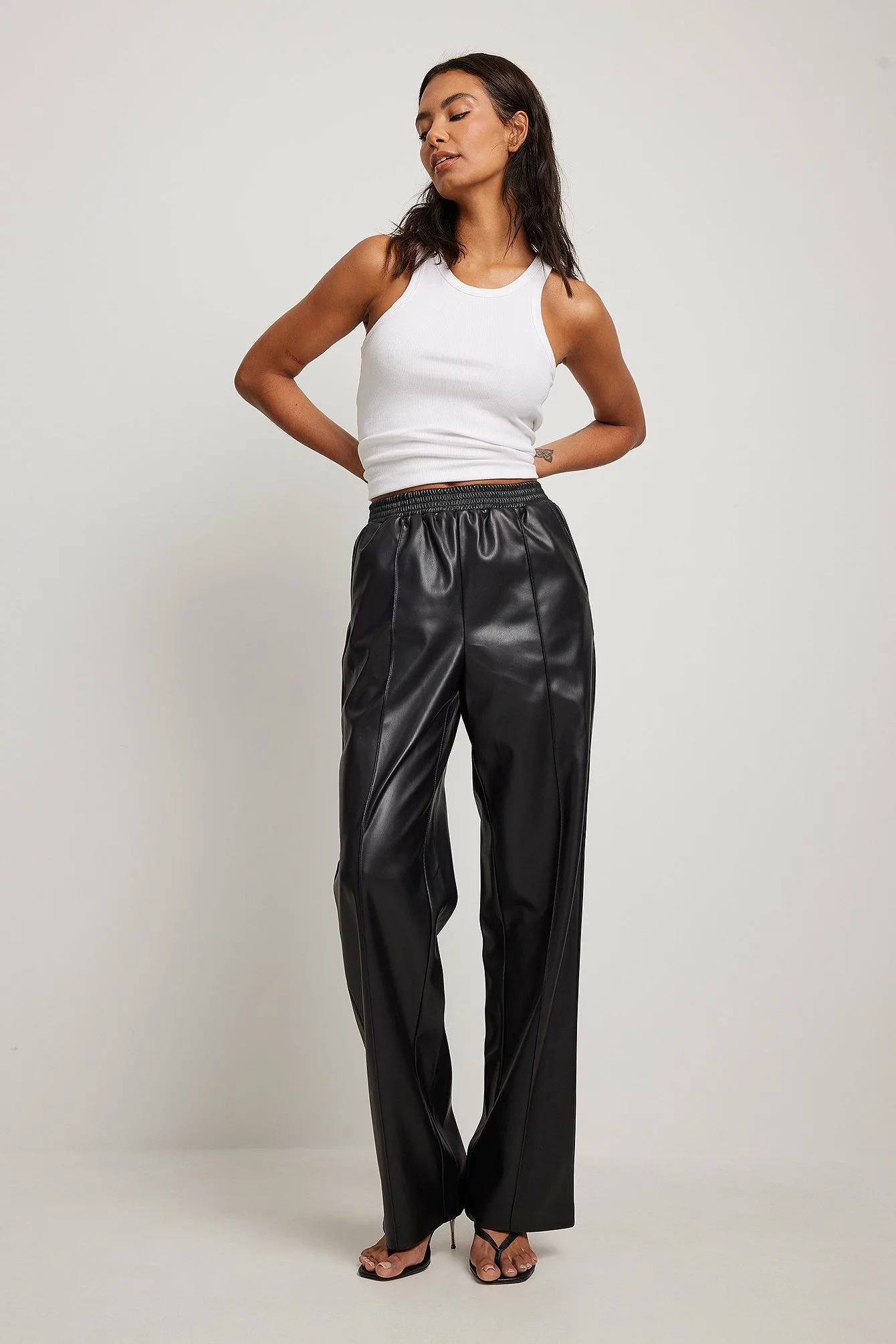 These trousers feature an elastic waistband. They have 2 pockets on the front and straight legs with a pleat detail along each leg. These trousers feature a slightly stretchy faux leather material in PU. Inseam length in size 36: 83 cm / 32.67 in.