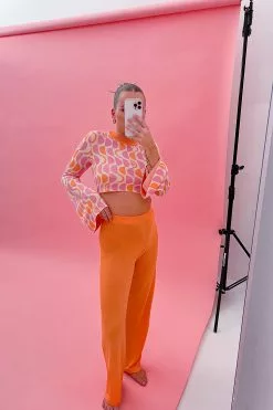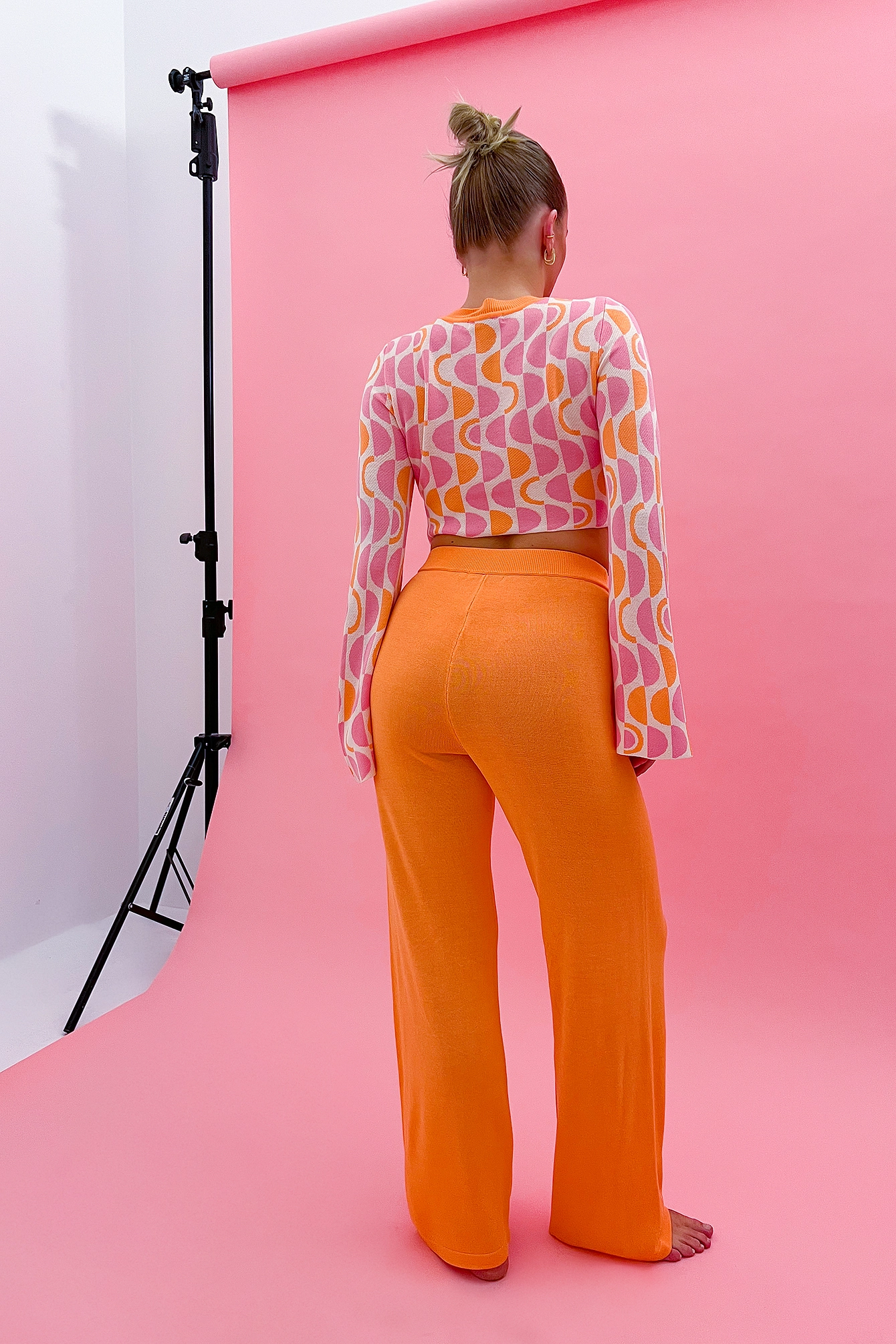 These pants are knitted and feature a high waist with an elasticized waist and wide legs.
