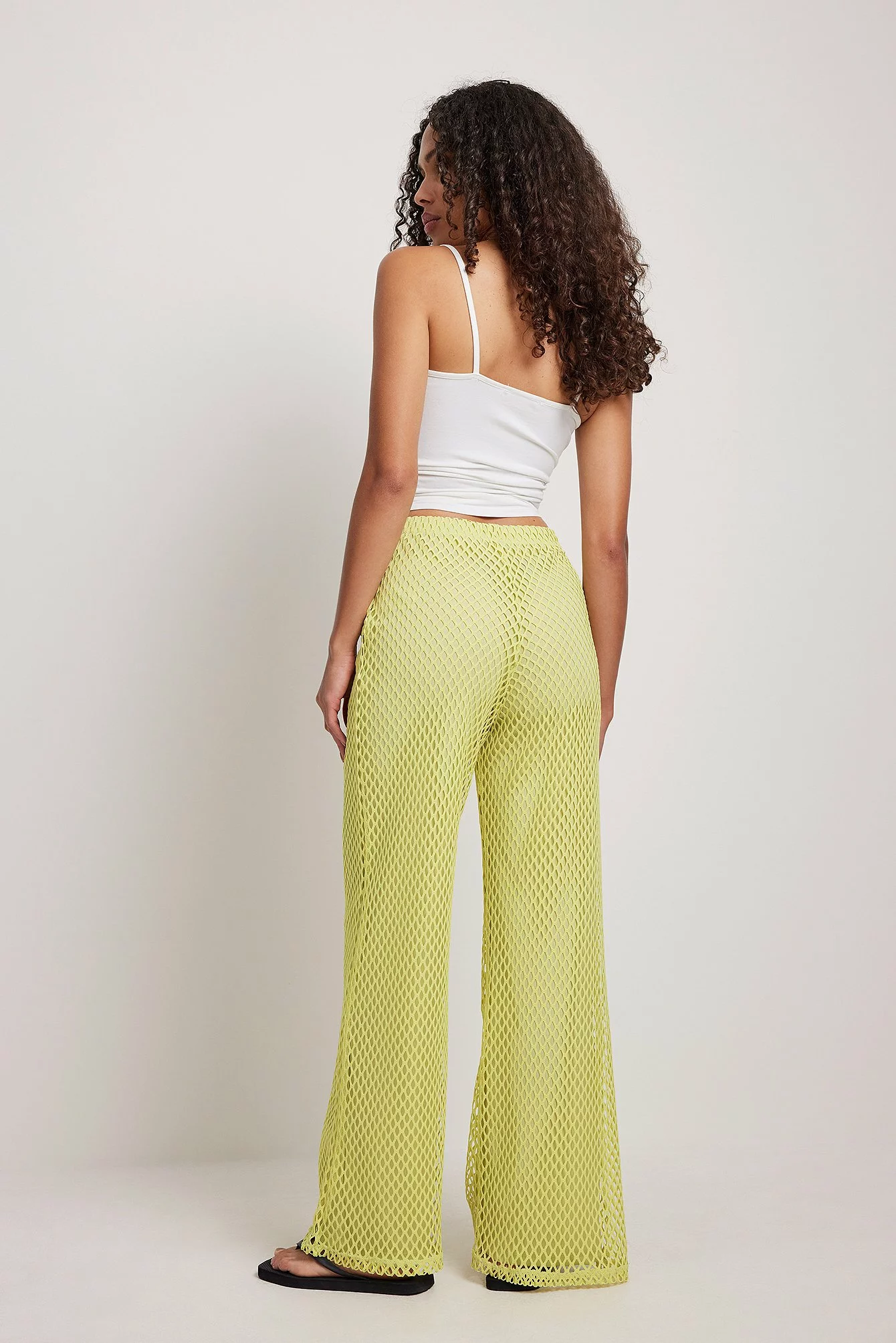 These trousers feature an elastic waistband and straight legs with double layers with a fishnet design and a slightly shorter lining underneath.