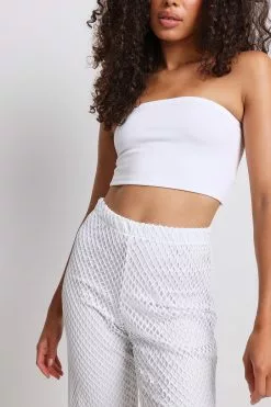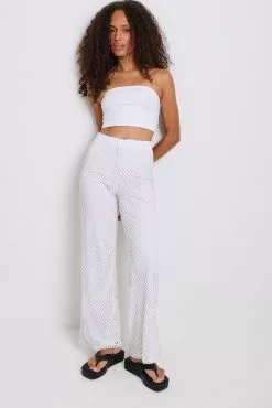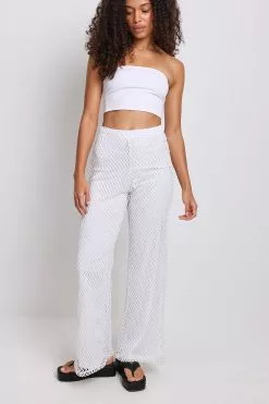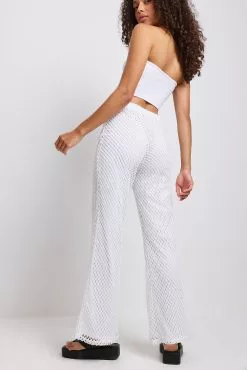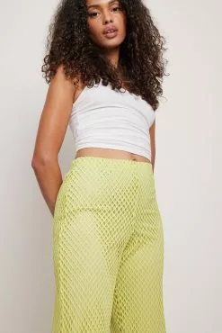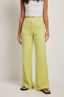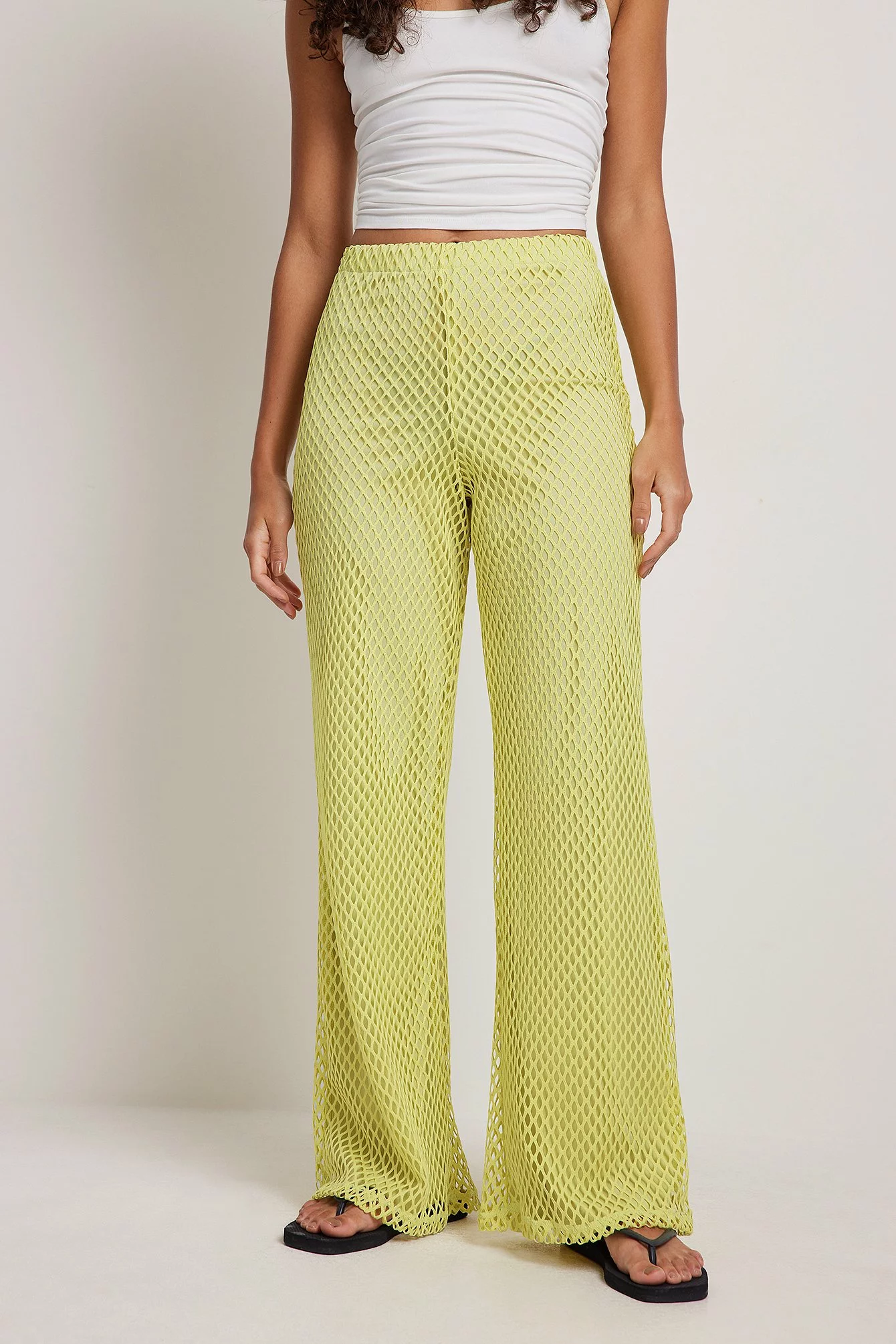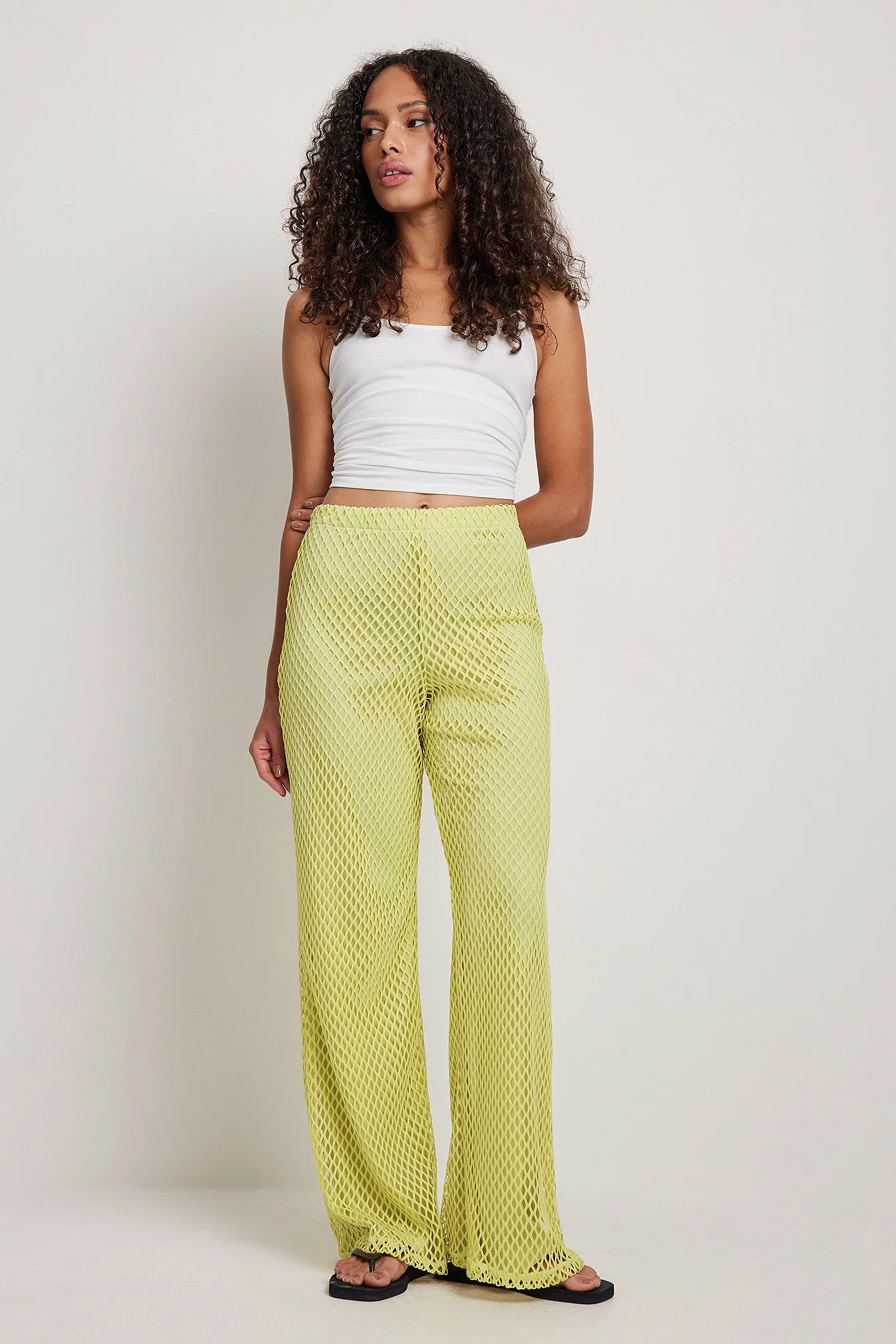 These trousers feature an elastic waistband and straight legs with double layers with a fishnet design and a slightly shorter lining underneath.