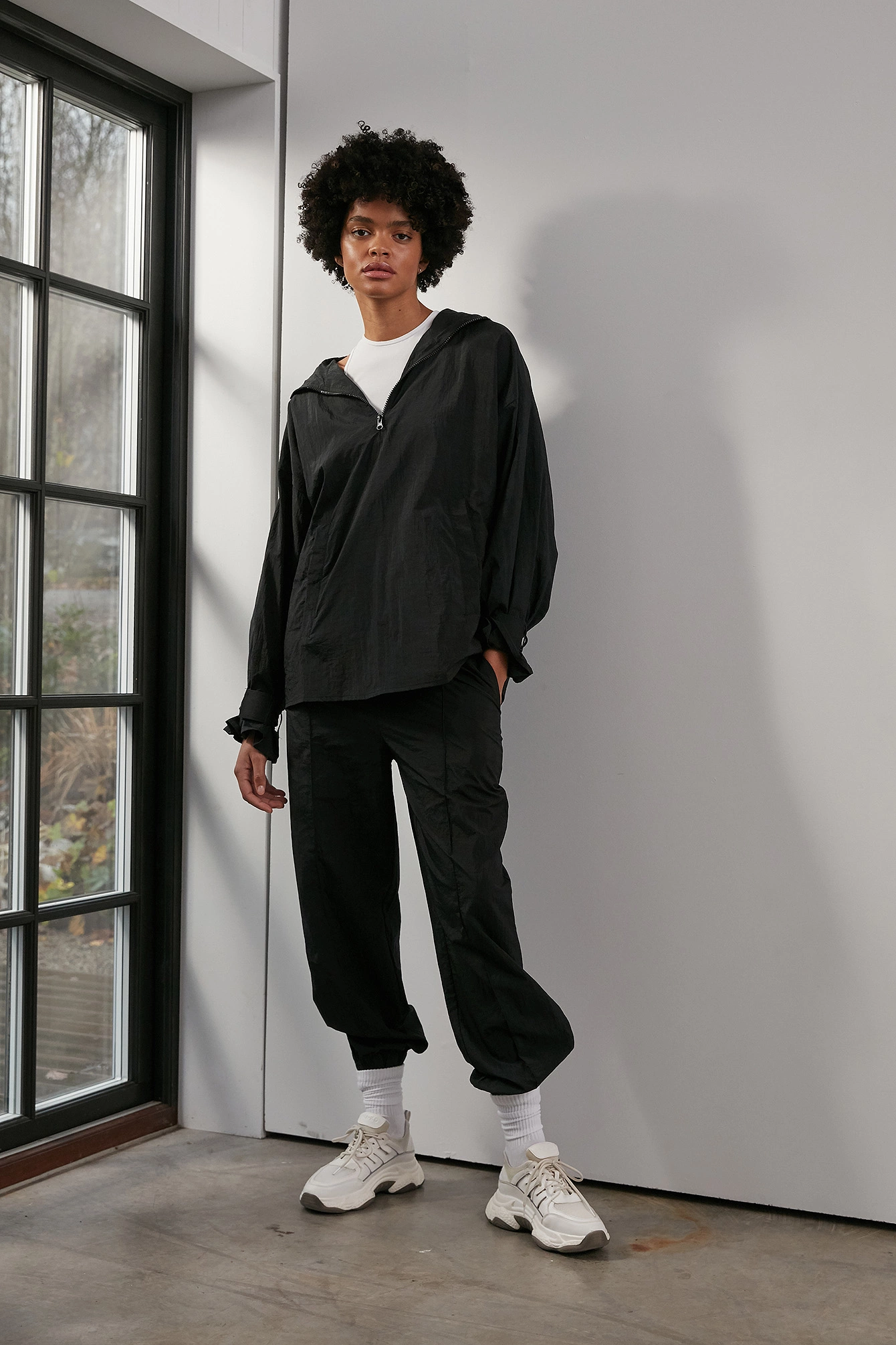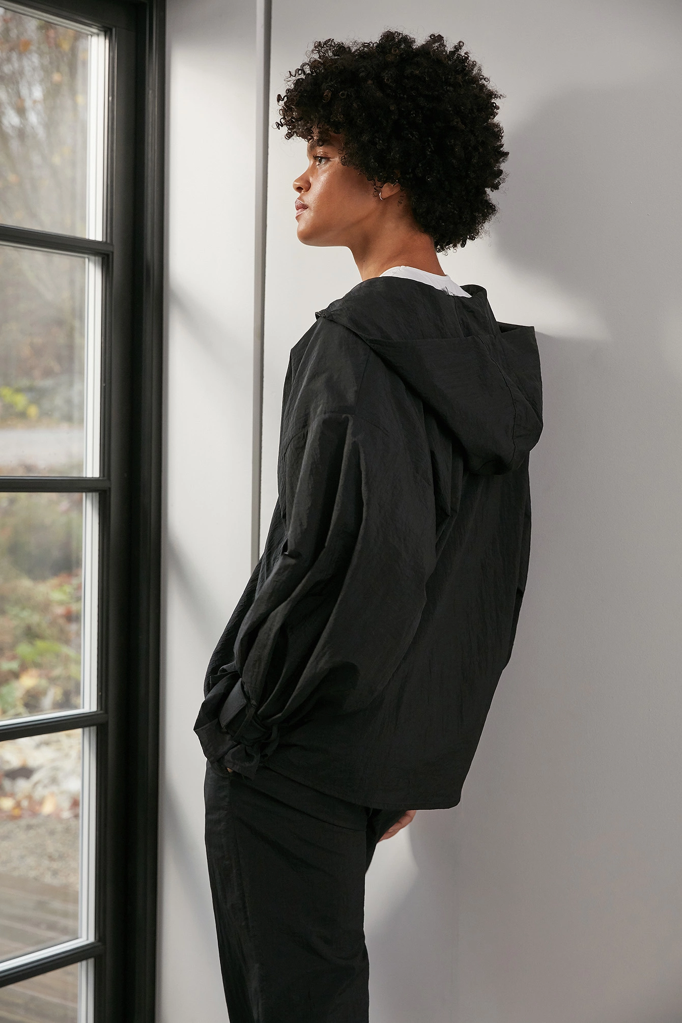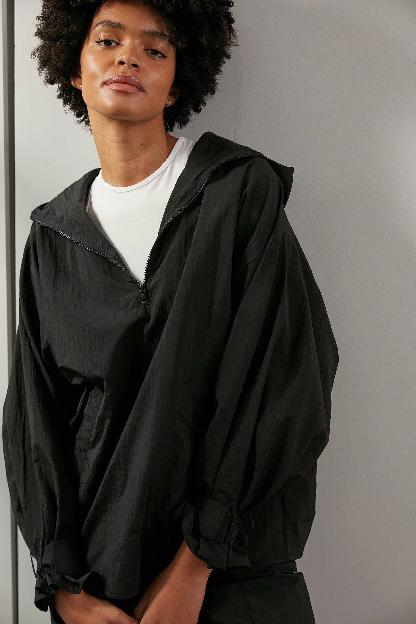 This jacket features a hood, a half-up zipper, dropped shoulders, long sleeves with belt loops and a removable velcro strap at the cuffs, two pockets with one snap button closure on the front and an oversized fit.