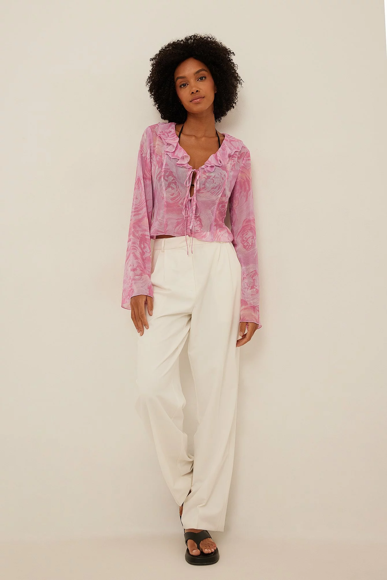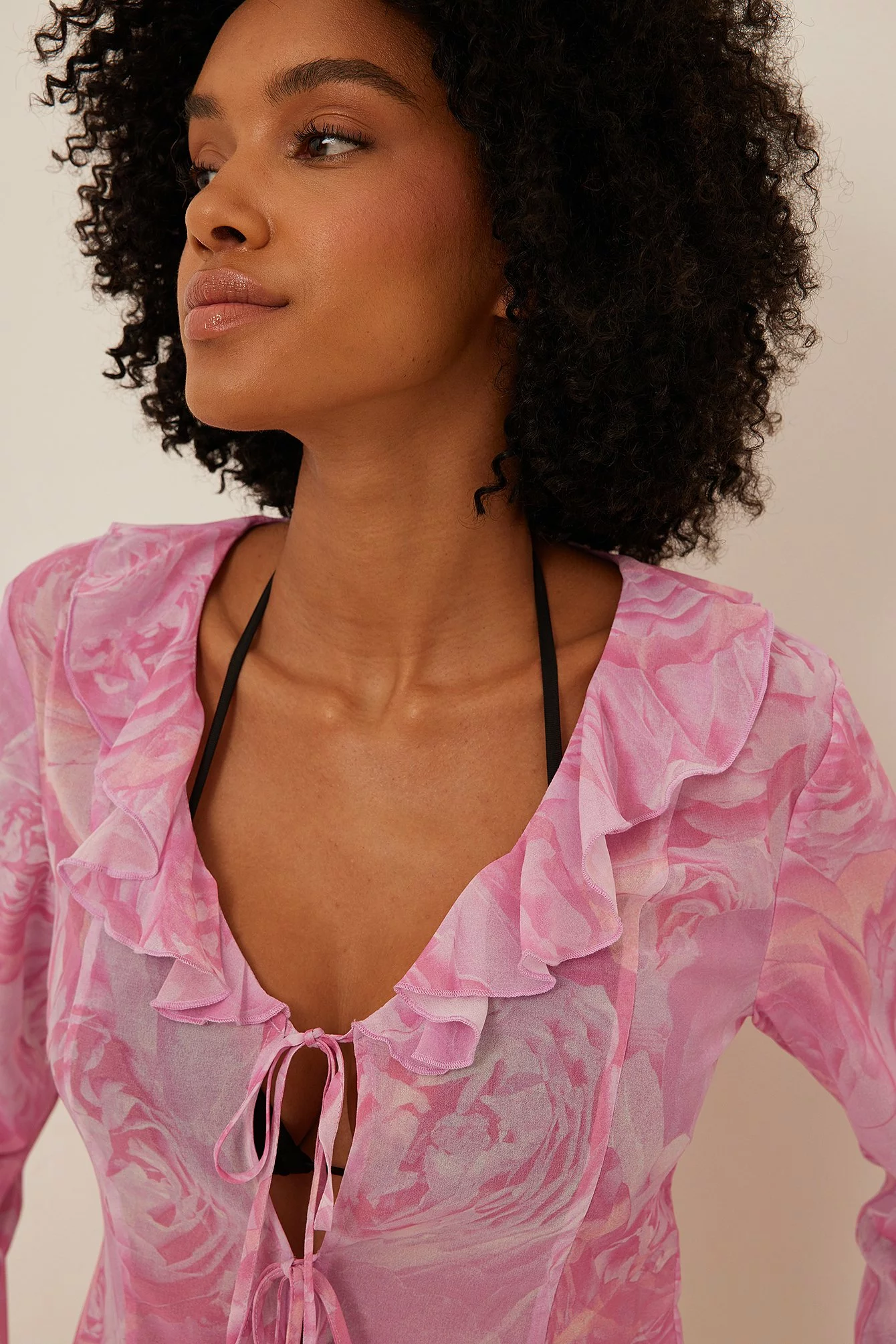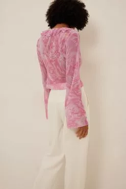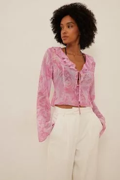 This blouse is seethrough and made of chiffon and features a self tie detail and a frill neckline.