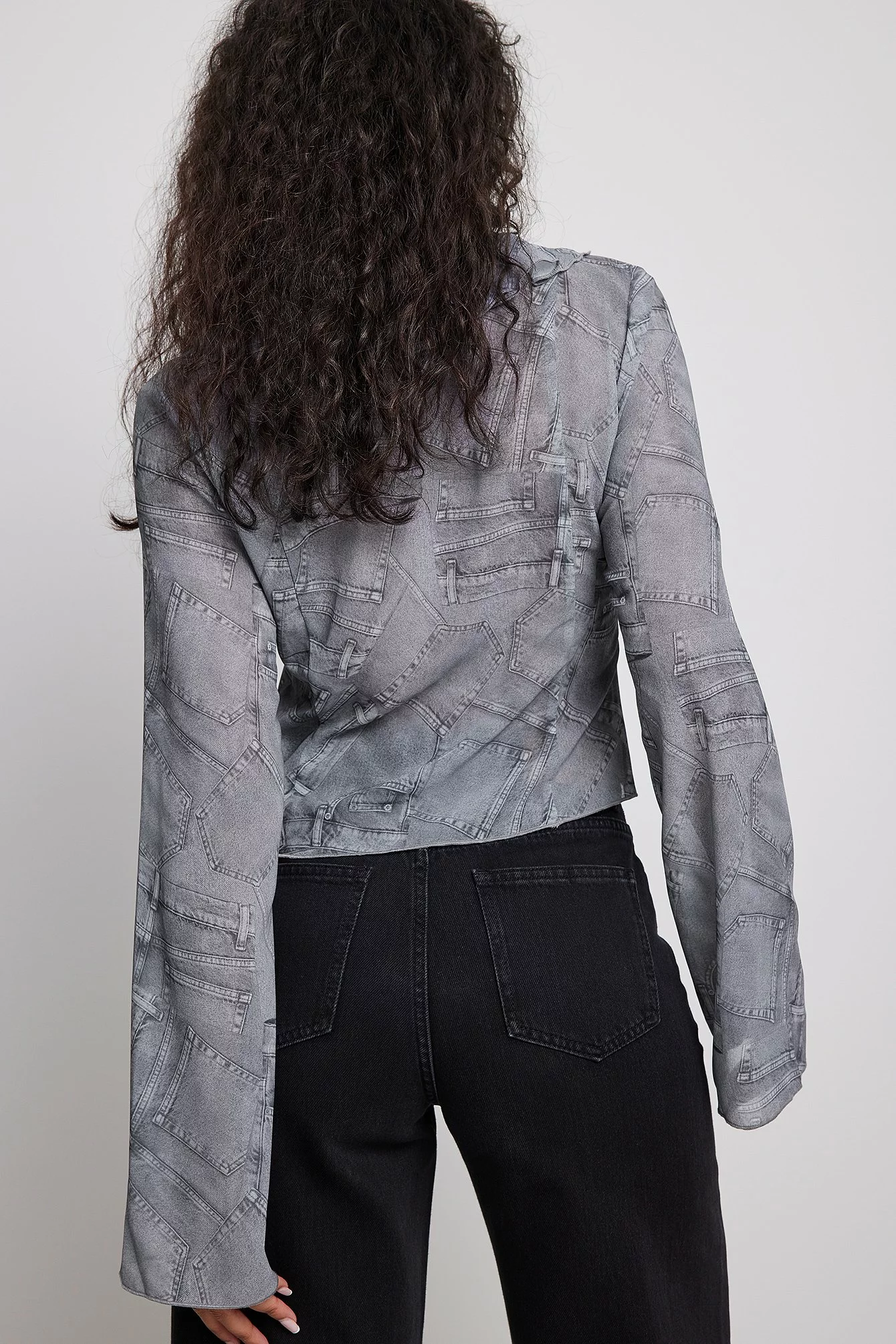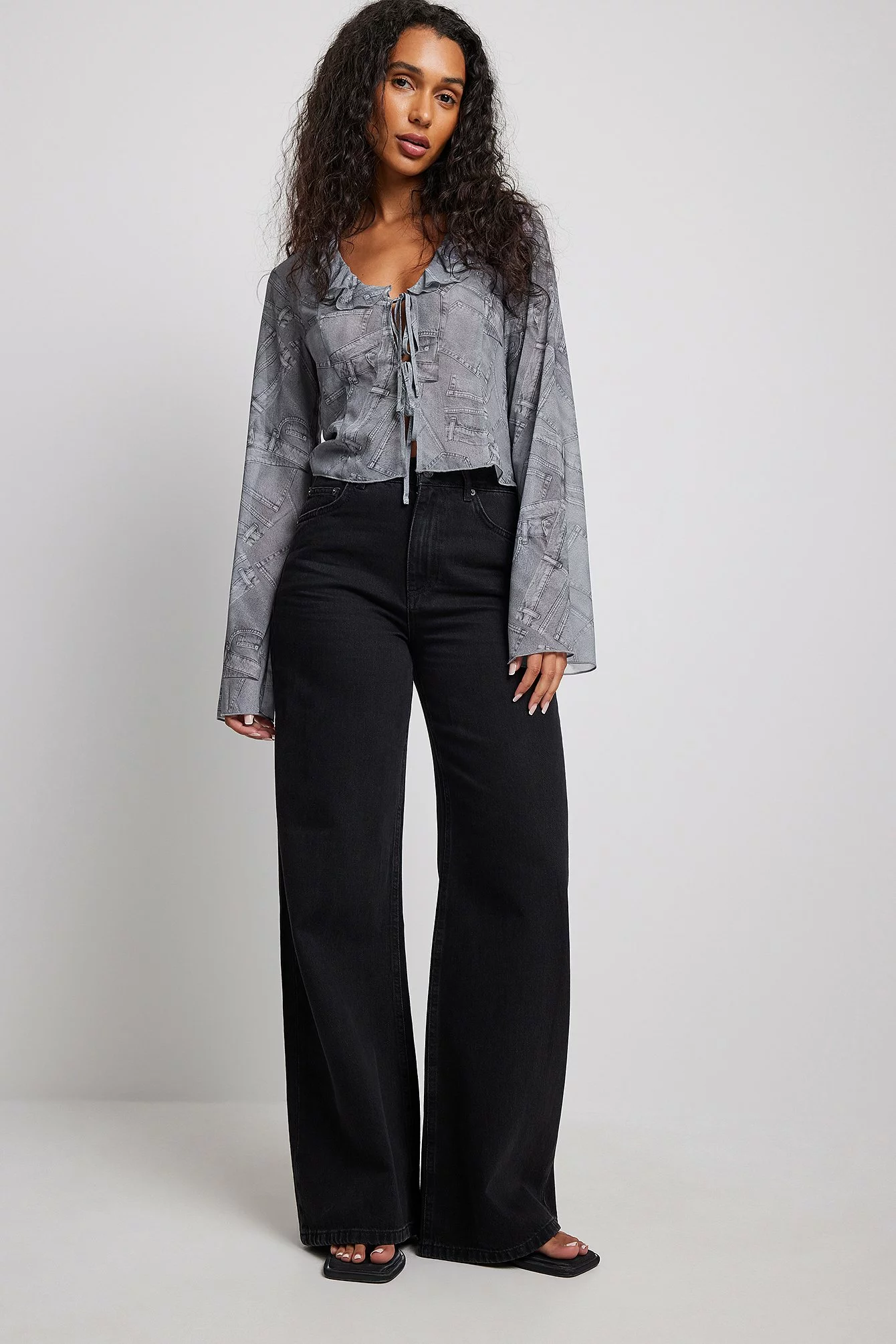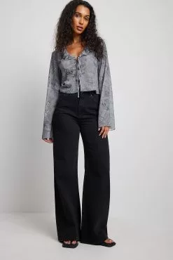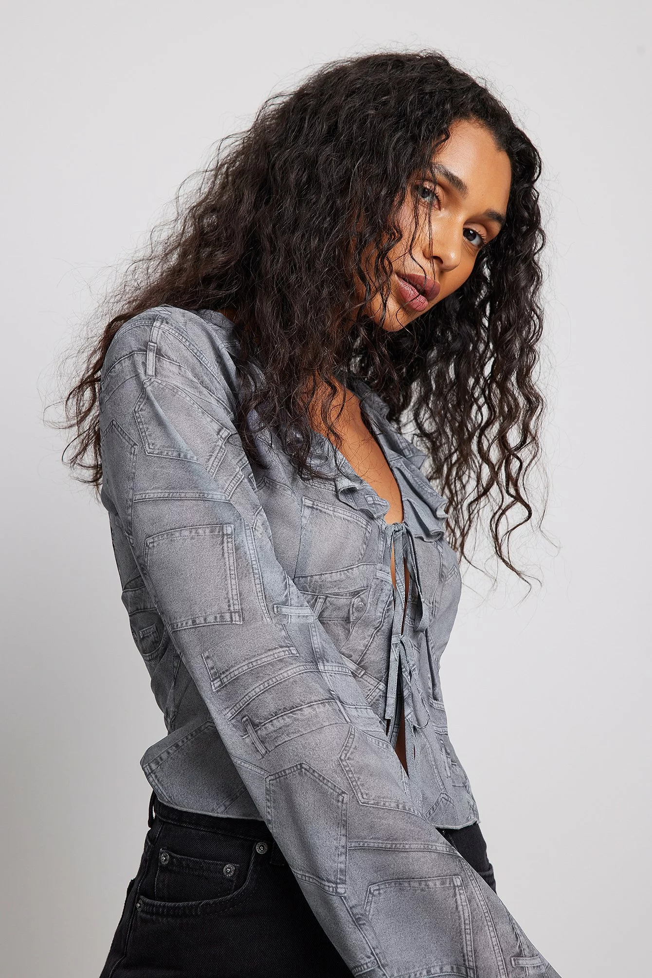 This blouse is seethrough and made of chiffon and features a self tie detail and a frill neckline.