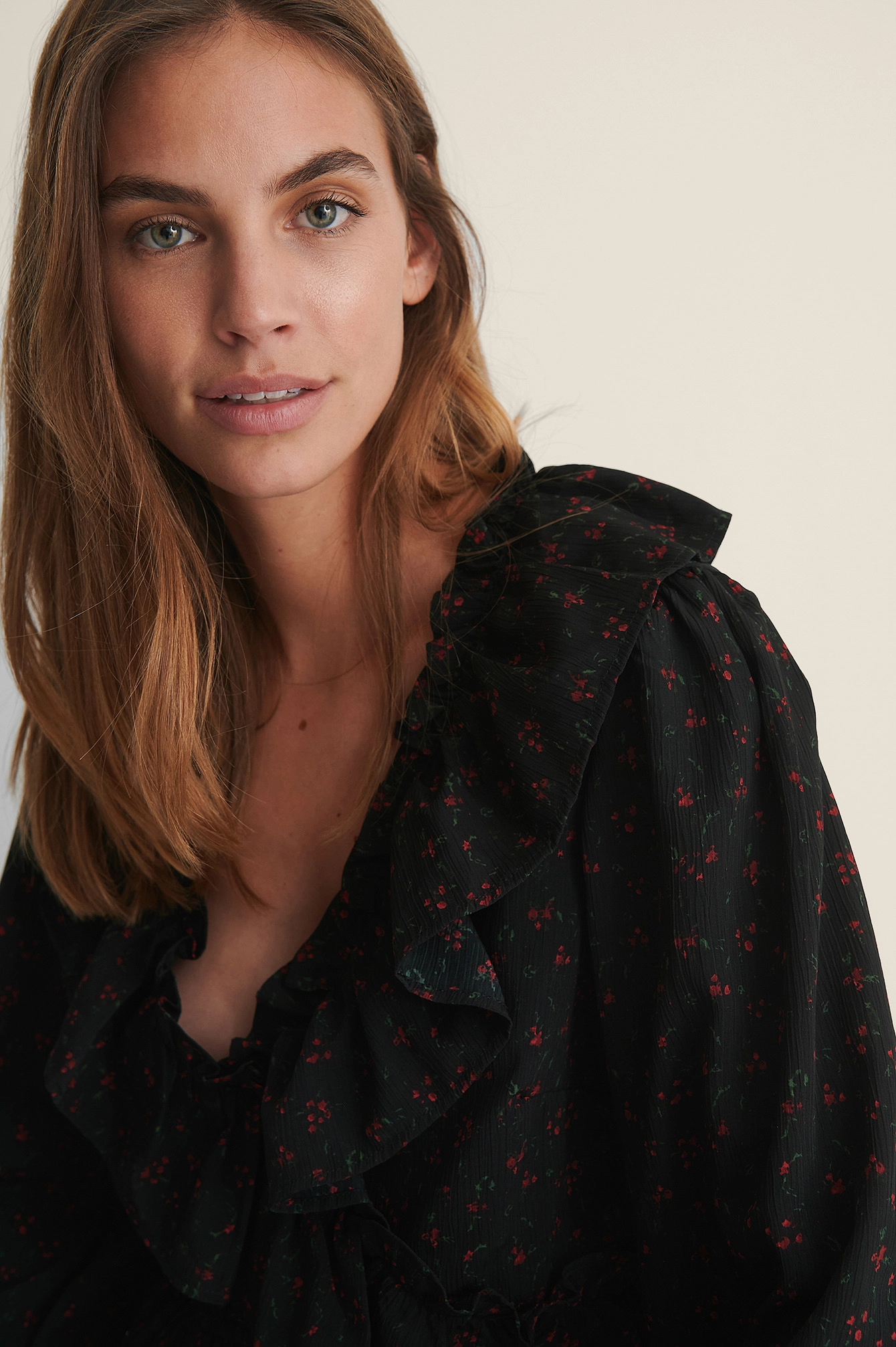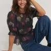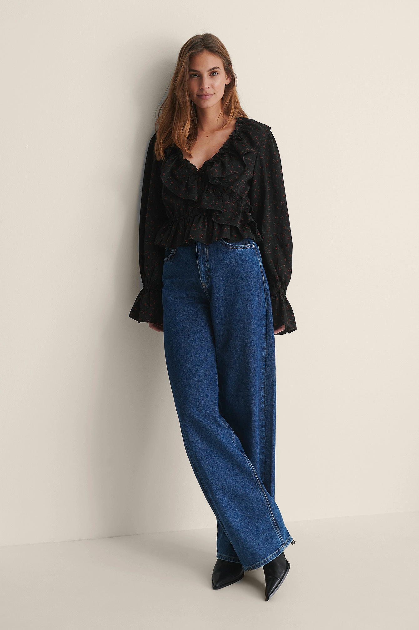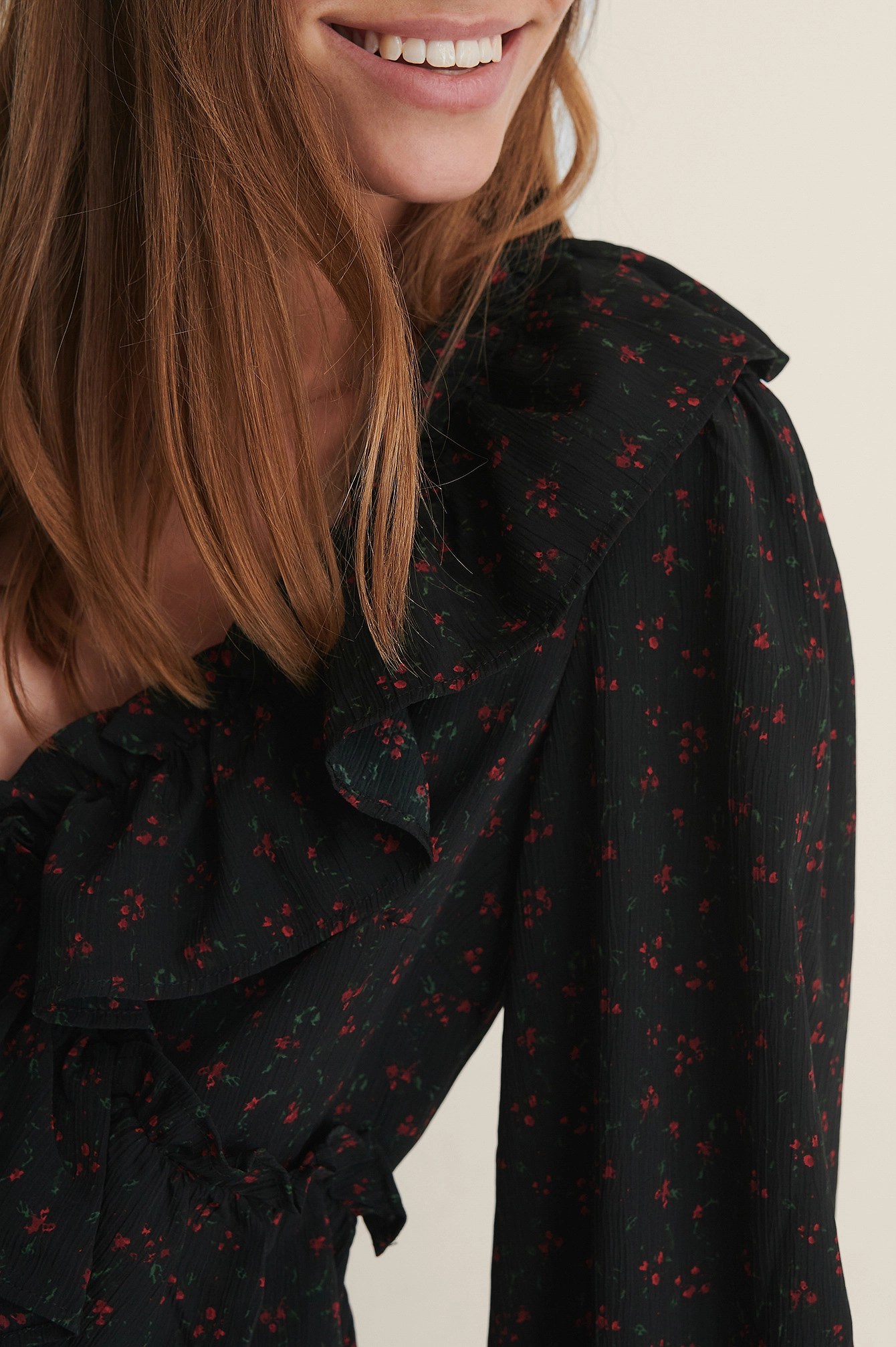 This blouse features a frilled design with a v neckline, long sleeves with gathered details and a flowy fit.