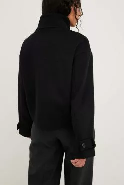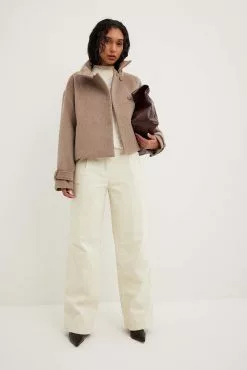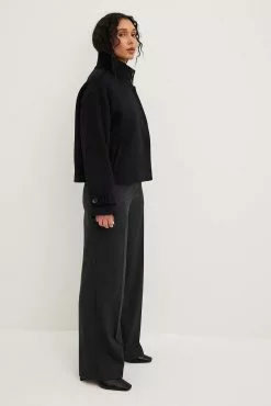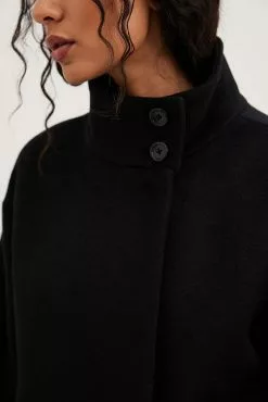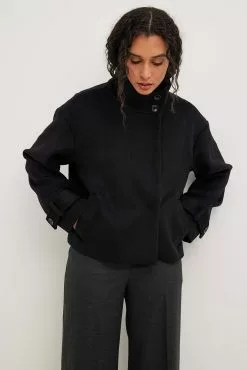 This coat is fully lined and features a short fit. It has a high neck with two button closures and hidden snap button closures along the front. This coat features long sleeves with a belted detail and slant pockets on the side.