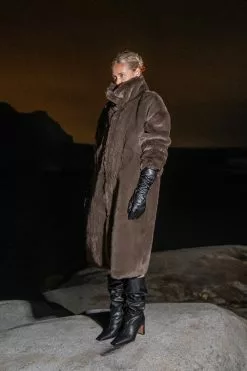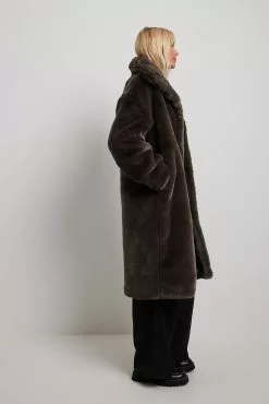 This coat is warm and made of faux fur and features a high neckline with snap button closures, snap button closures down the front, a fabric lining and a straight fit.