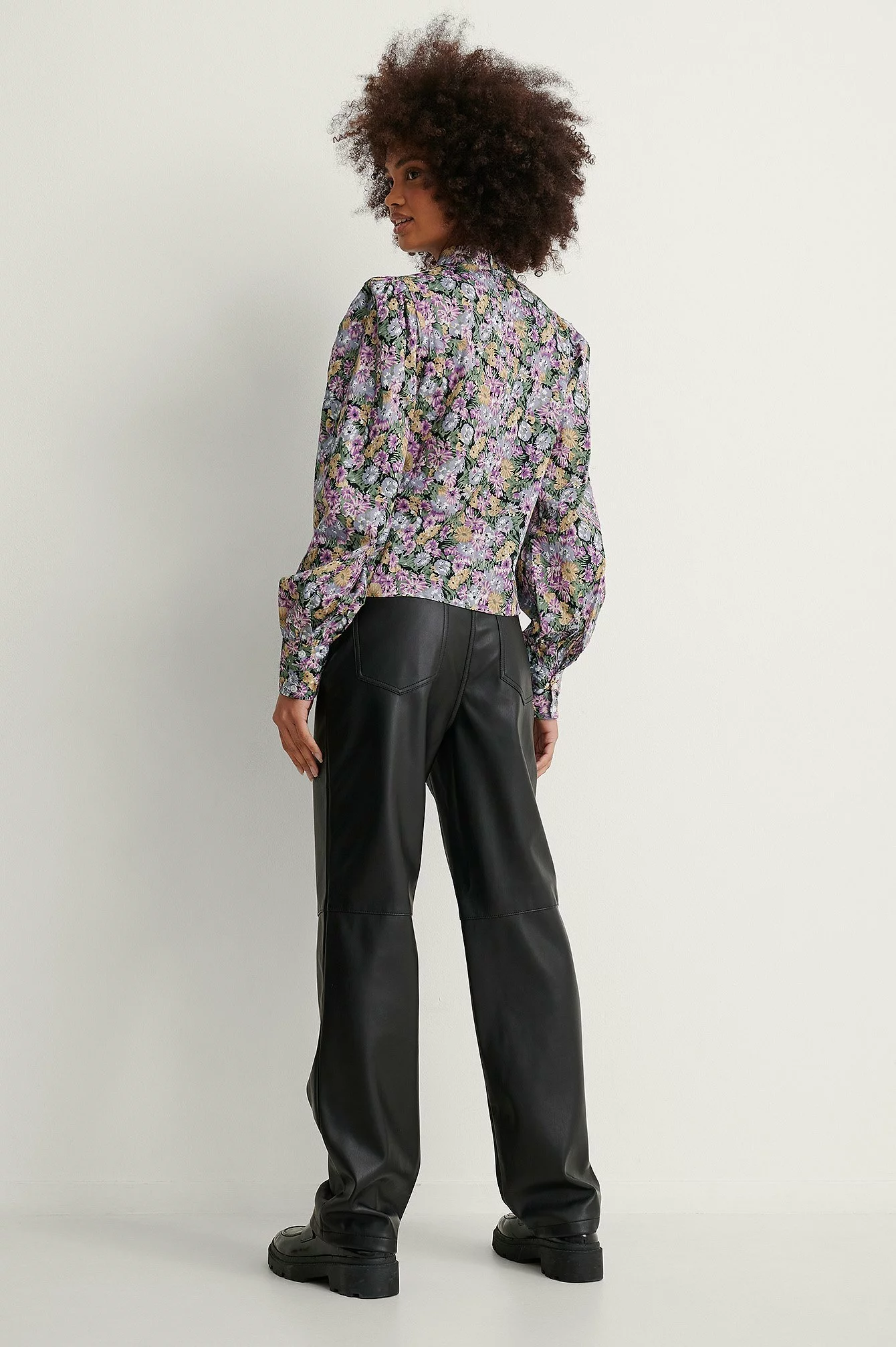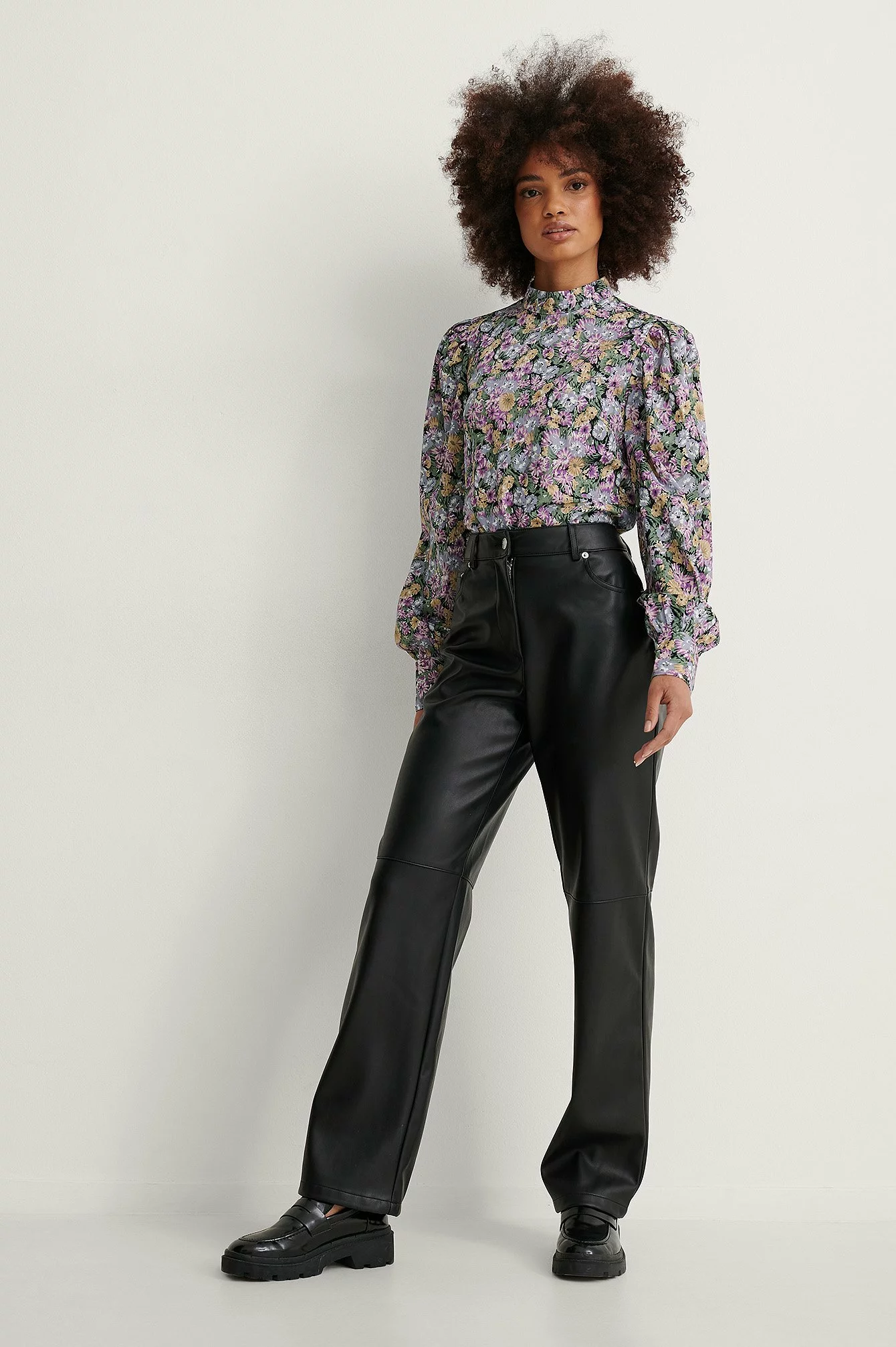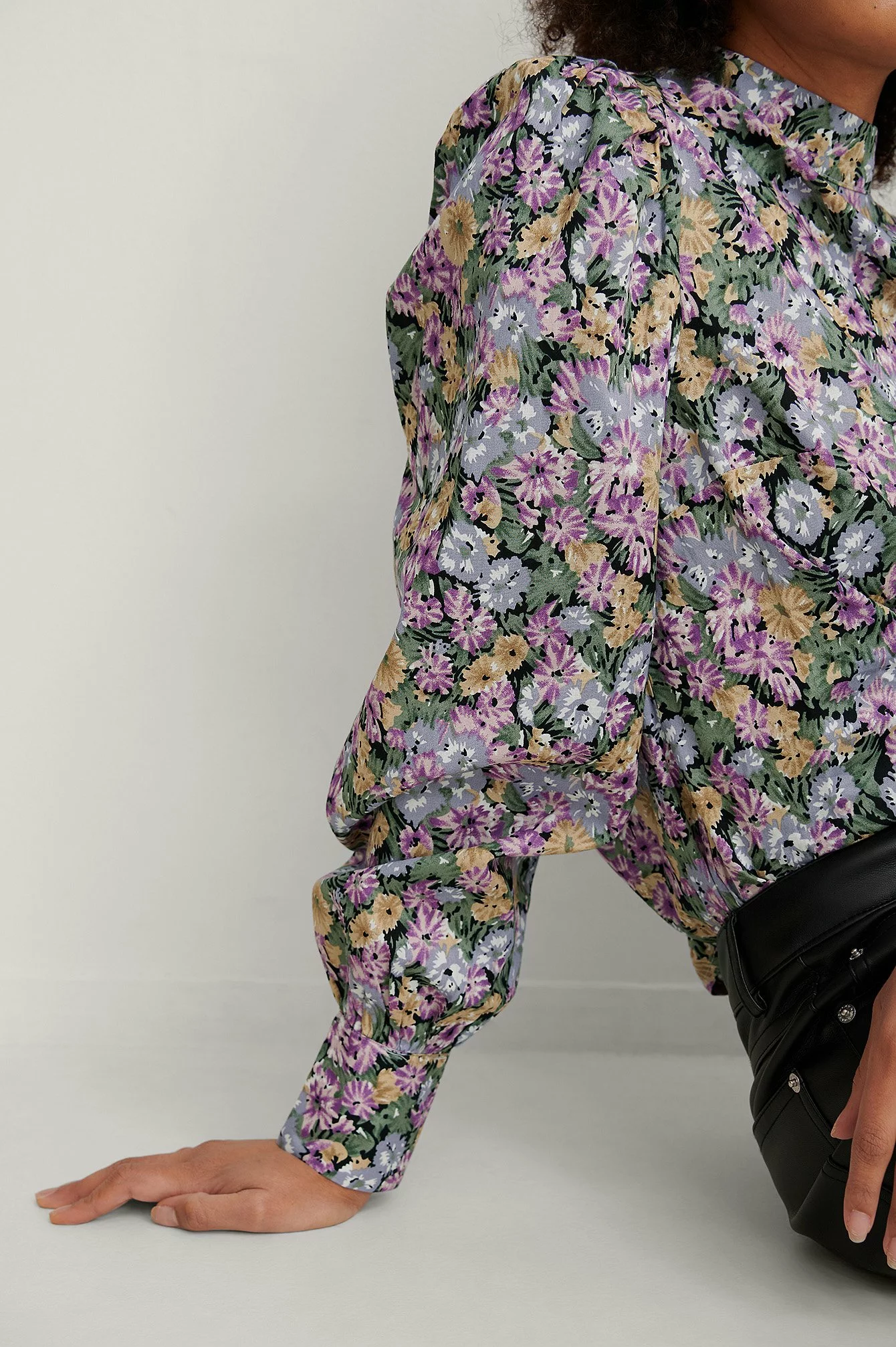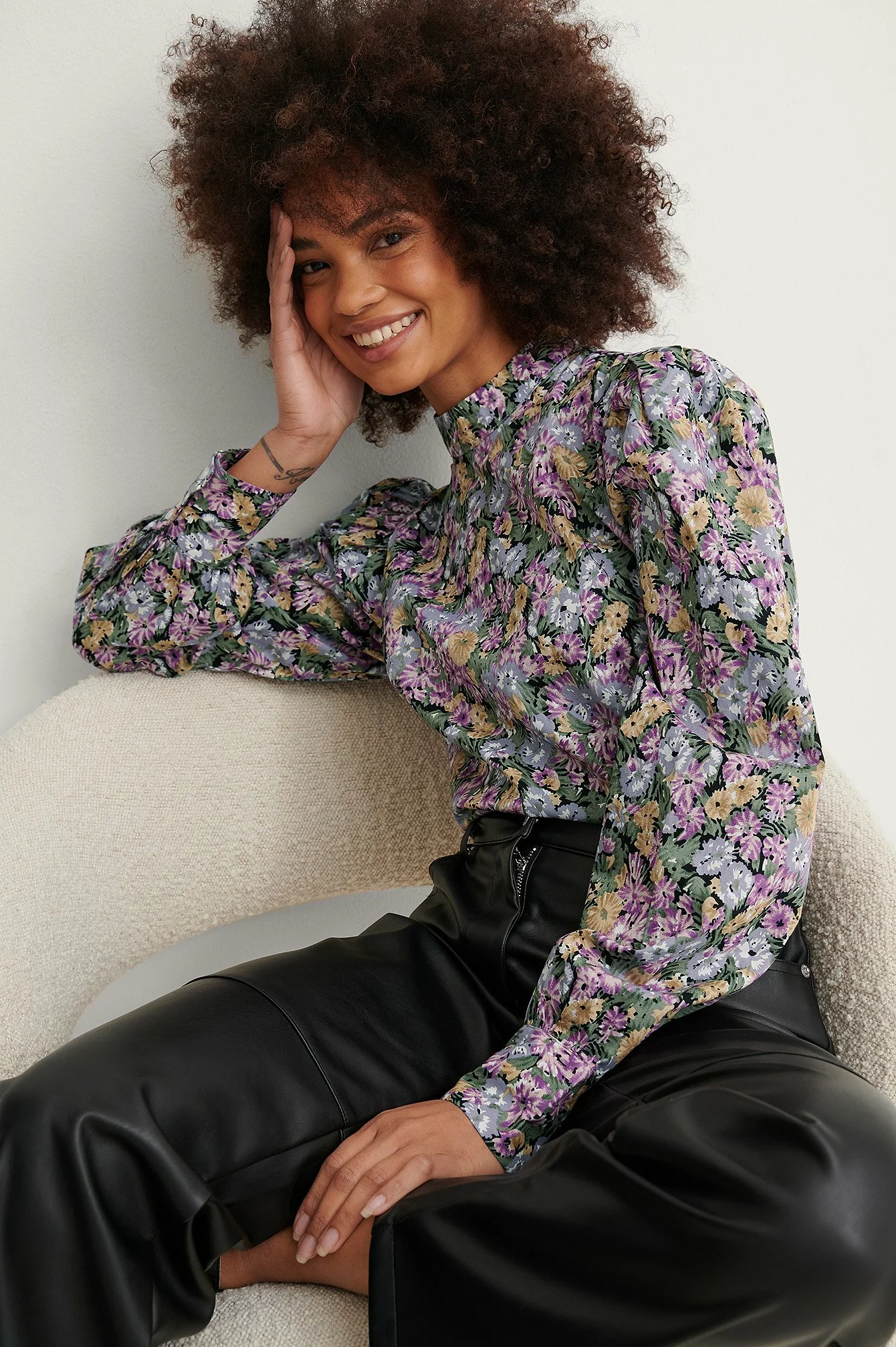 This top features a high neck with a concealed zipper closure at the back, puff sleeves with four button cuffs, a relaxed fit and a normal length.
