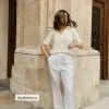 These suit pants feature a high rise waist, belt loops, a zipper, hook and button closure, two side pockets, two mock pockets at the back and cropped length.