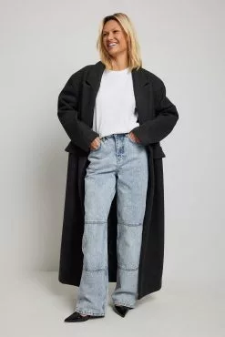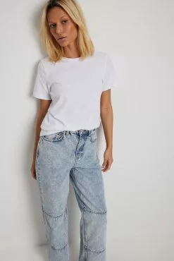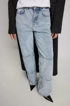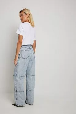 These jeans feature a high waist. They have a loose fit and contrast color seams along each leg.