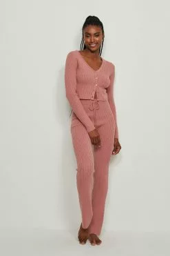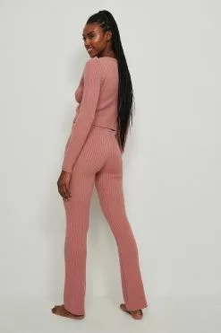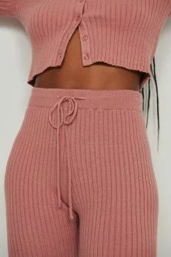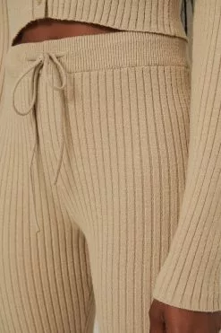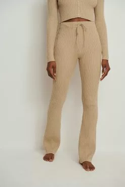 These pants feature a high waist with a self-tie drawstring, a rib design, straight legs and a comfy fit.