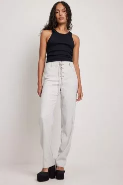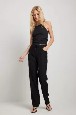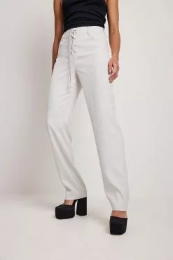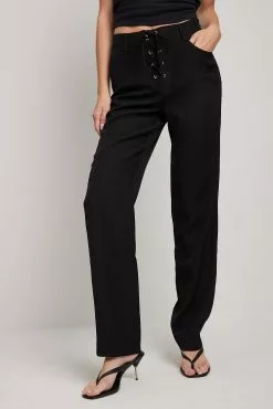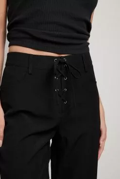 These suit pants feature a lace up design at the front. They have a side zipper closure and a skinny leg. Inseam length in size 36: 81 cm / 31.88 in.