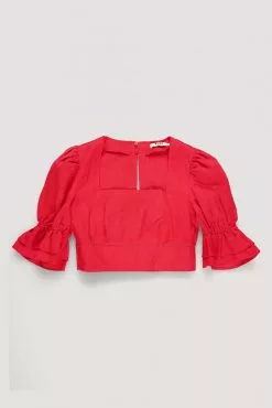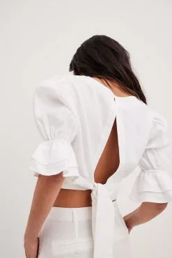 This top features a square neckline. It has short sleeves with flowy details and 2 button closures at the back of the neck. This top features an open back with self-tie bands and cropped length.