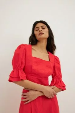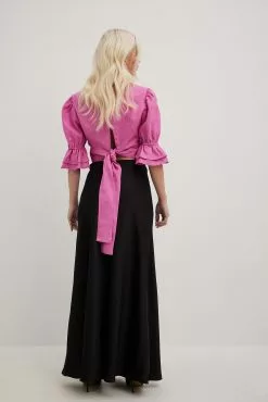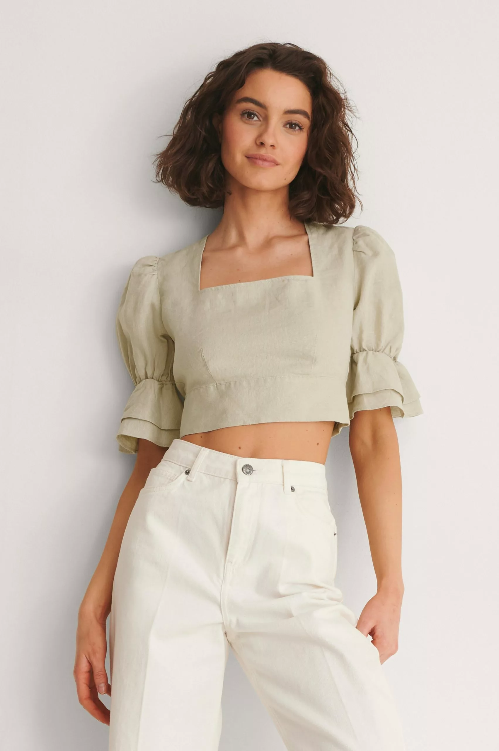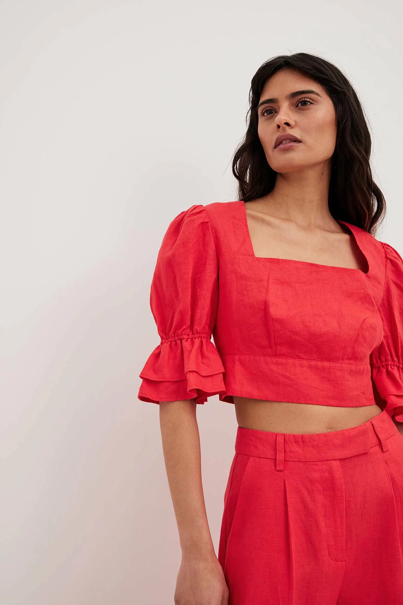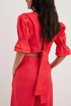 This top features a square neckline. It has short sleeves with flowy details and 2 button closures at the back of the neck. This top features an open back with self-tie bands and cropped length.