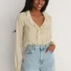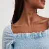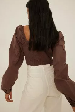This blouse features an elasticized square neckline with a tieknot in front, long sleeves with elastic cuffs, a ruched design in front, a smocked design on the back, cropped length and a material in cotton.