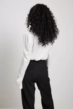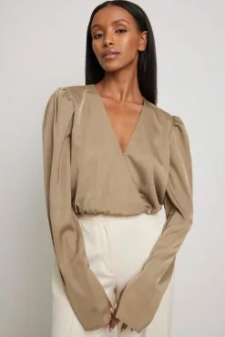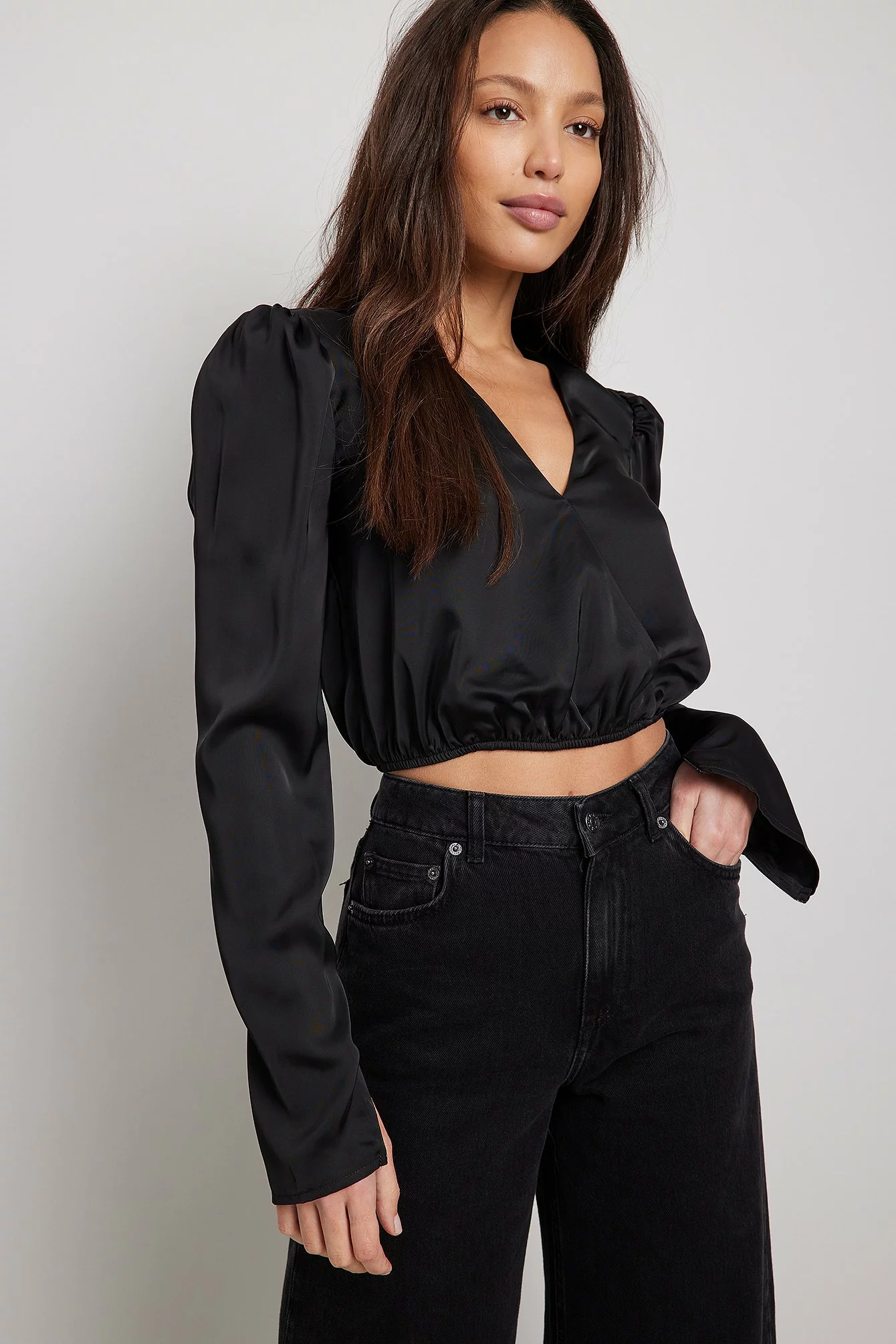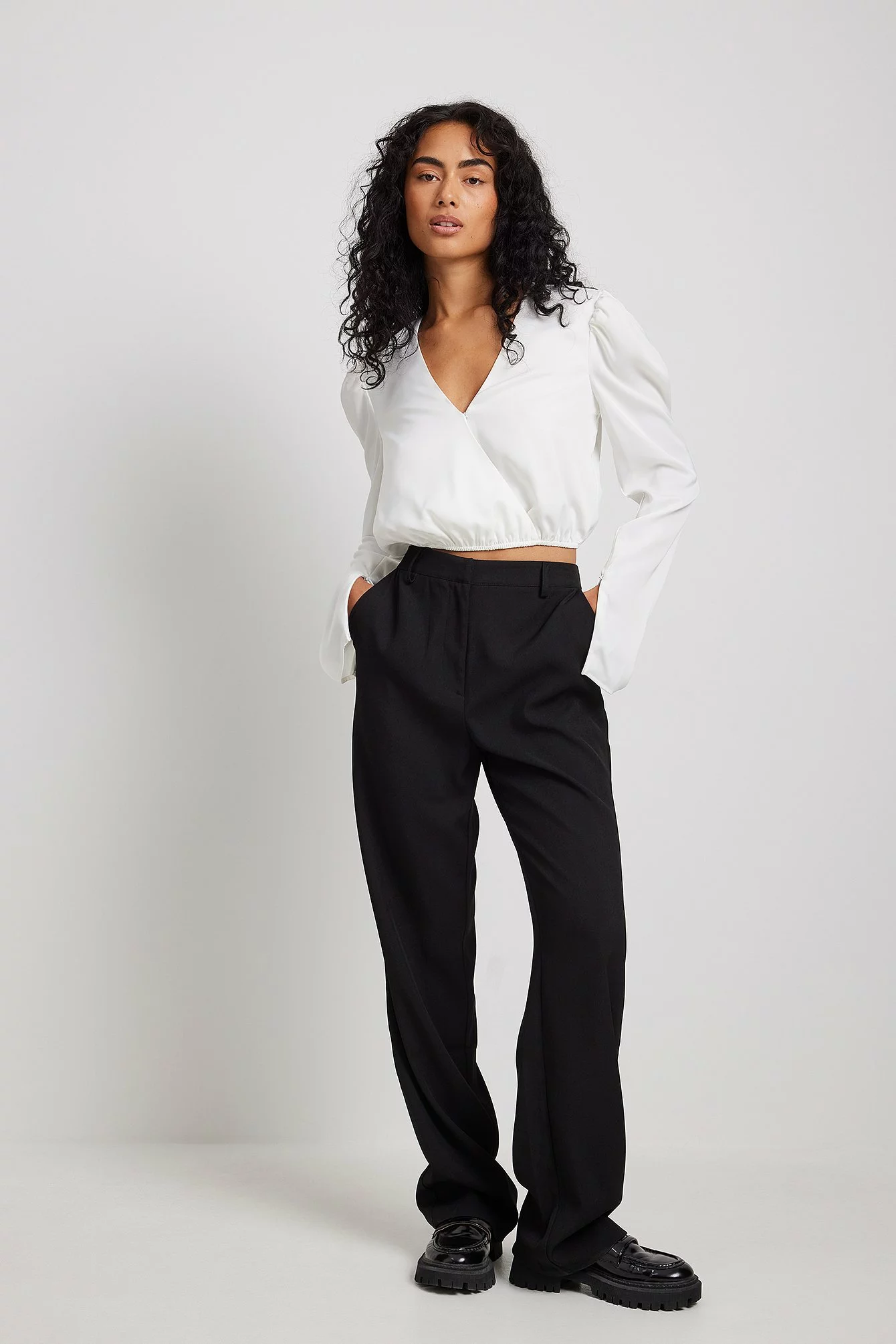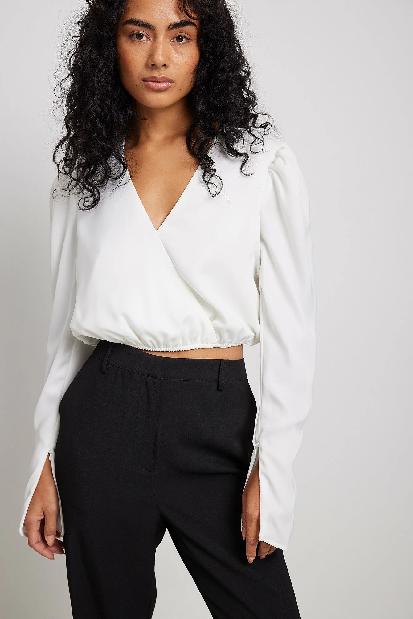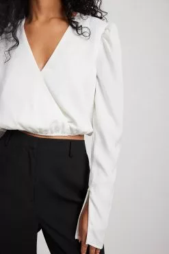 This blouse features an overlap design with a v neckline. It has a long sleeve with a side zipper and an elasticized waistband.