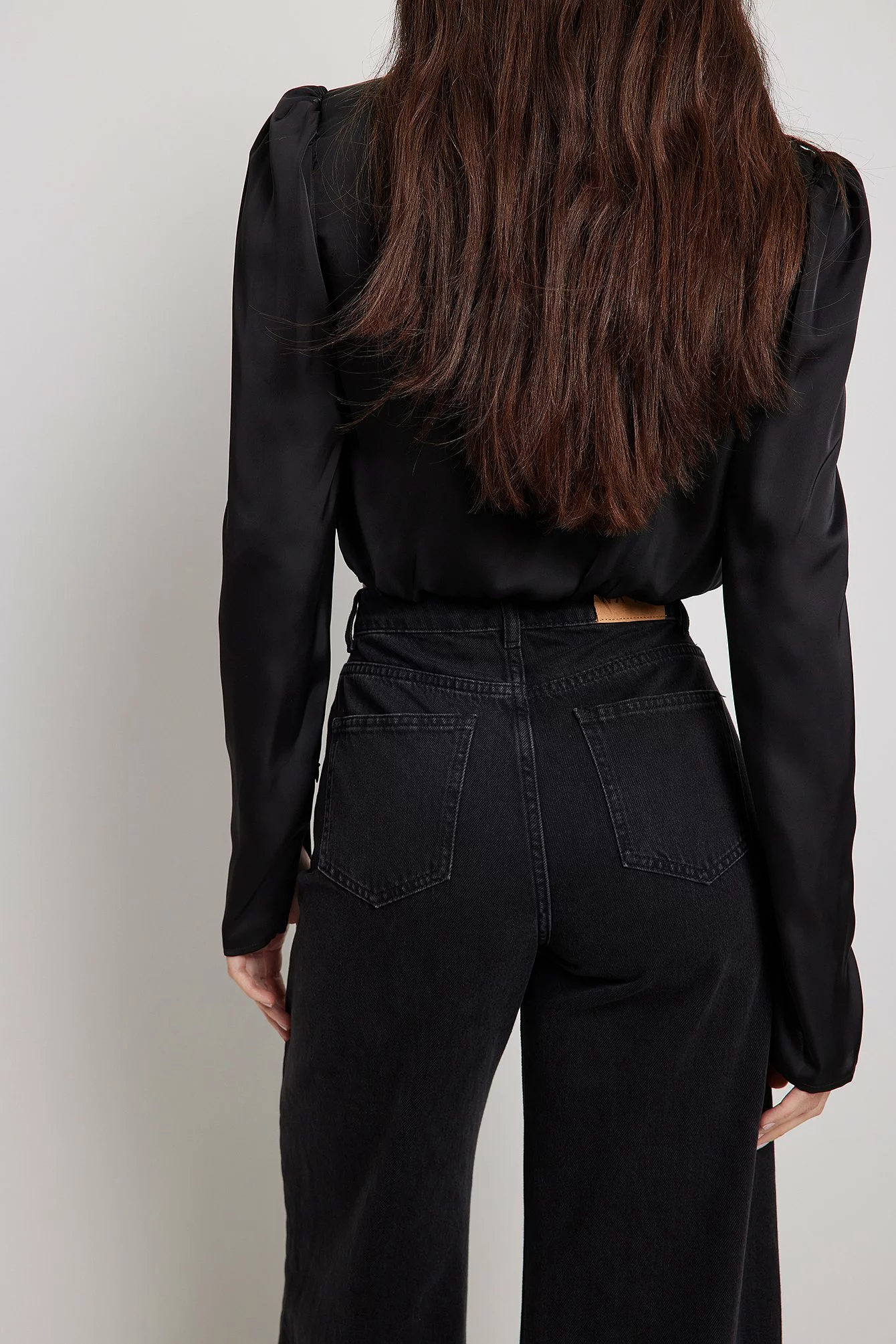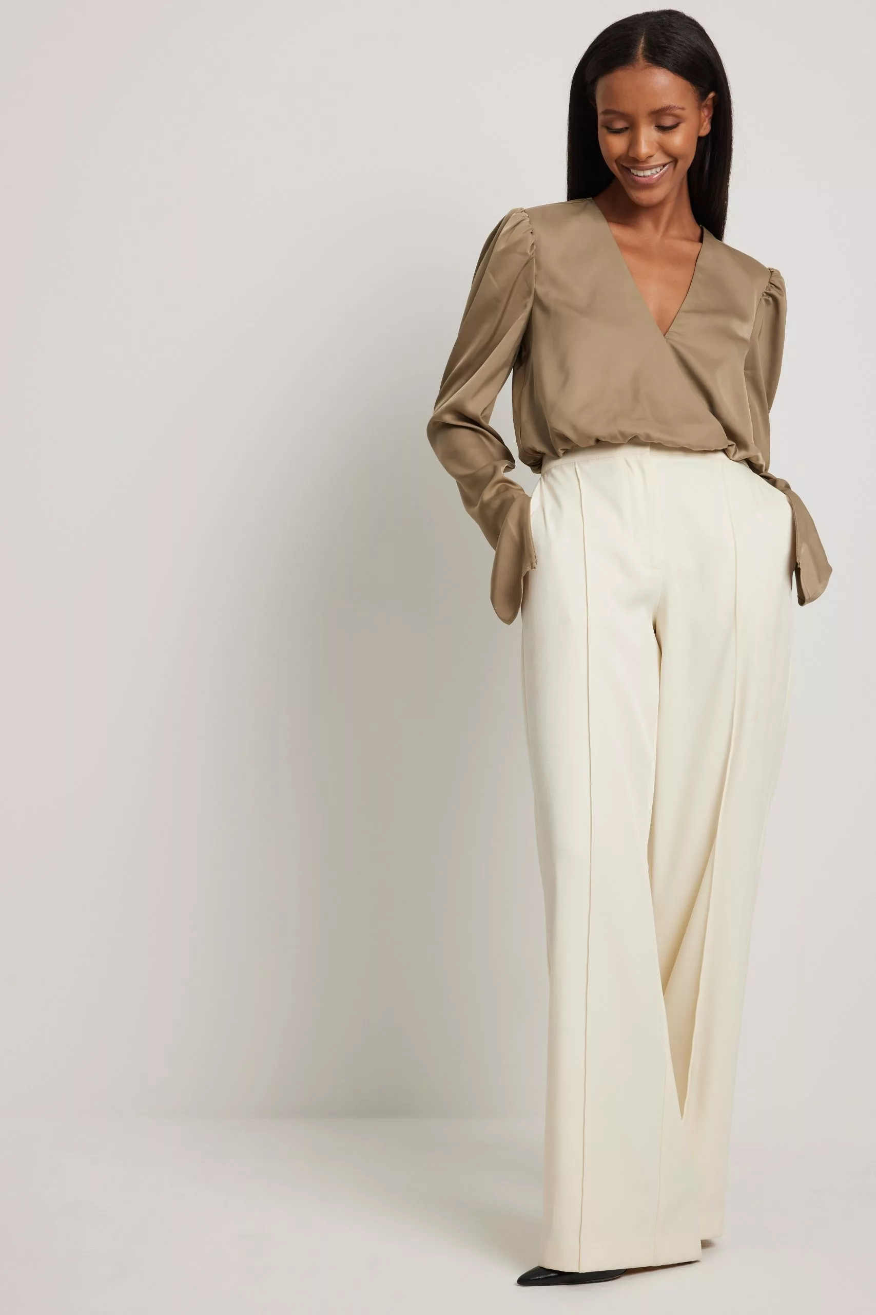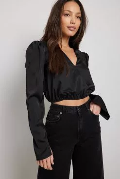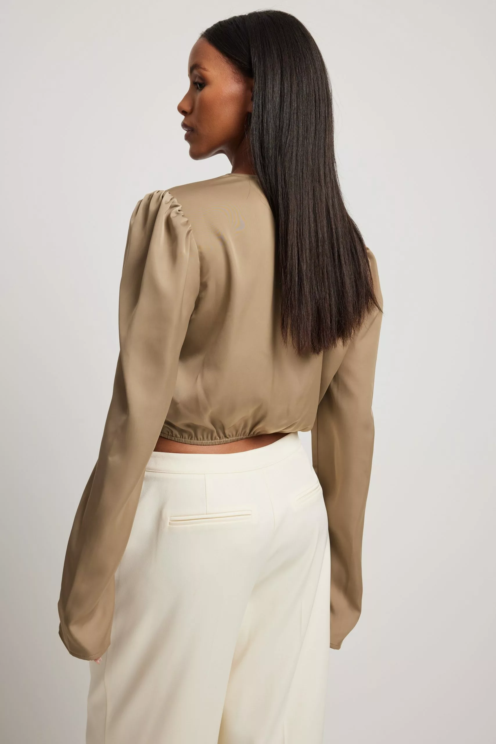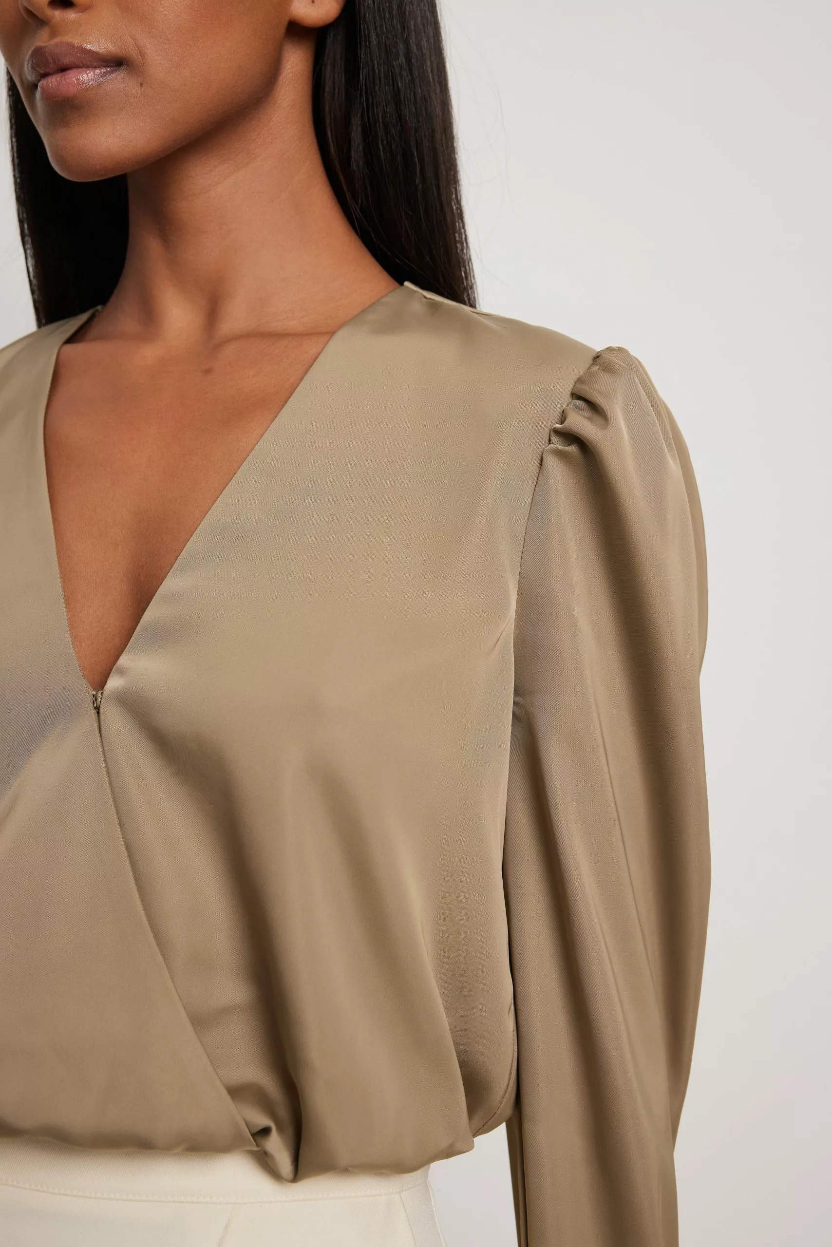 This blouse features an overlap design with a v neckline. It has a long sleeve with a side zipper and an elasticized waistband.