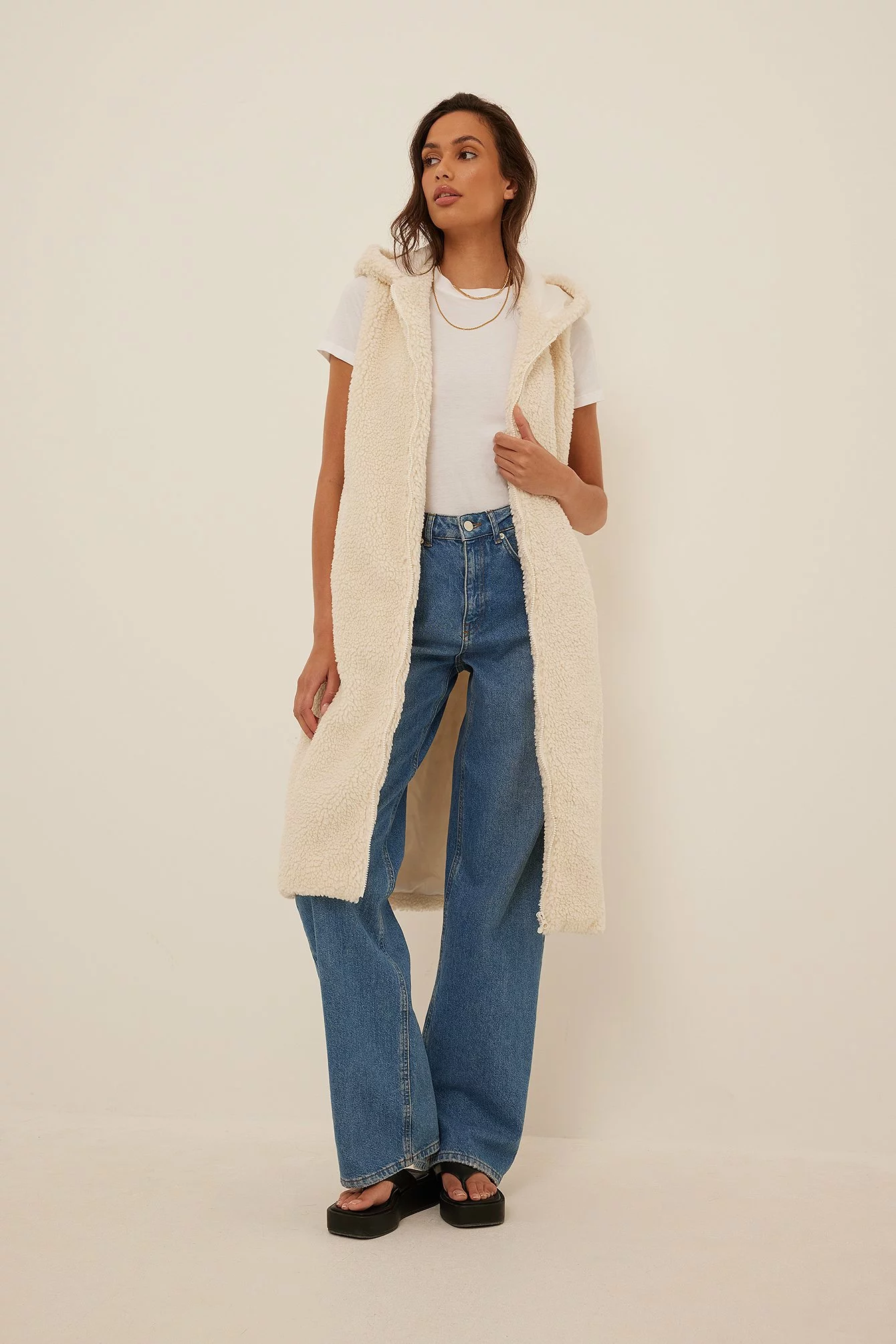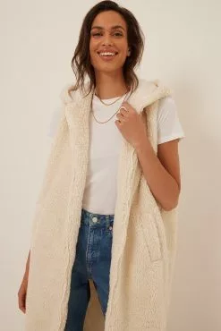 This vest features a teddy material with a cozy hood and a zipper closure down the front and a slightly longer design.
