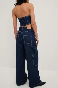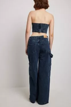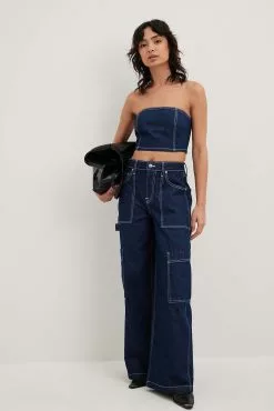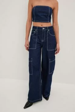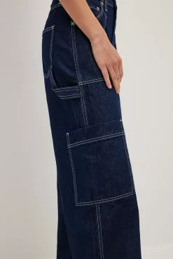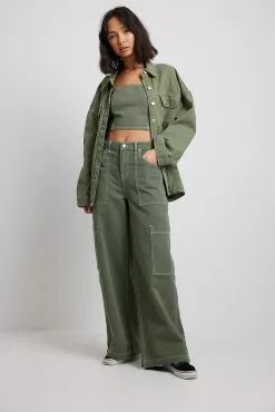 These cargo pants feature a mid waist. They have loose wide legs and big front pockets. These cargo pants feature big side pockets and back pockets.