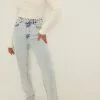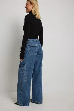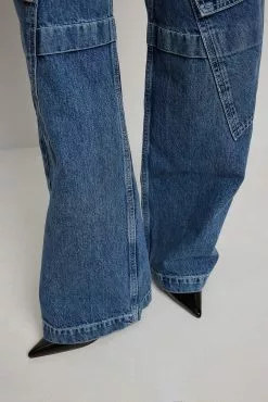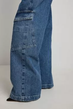 These jeans feature a cargo design. They have a low waist and wide legs. These jeans feature side pockets and back pockets.