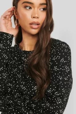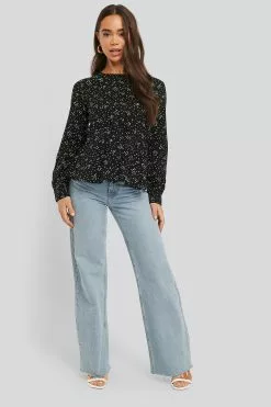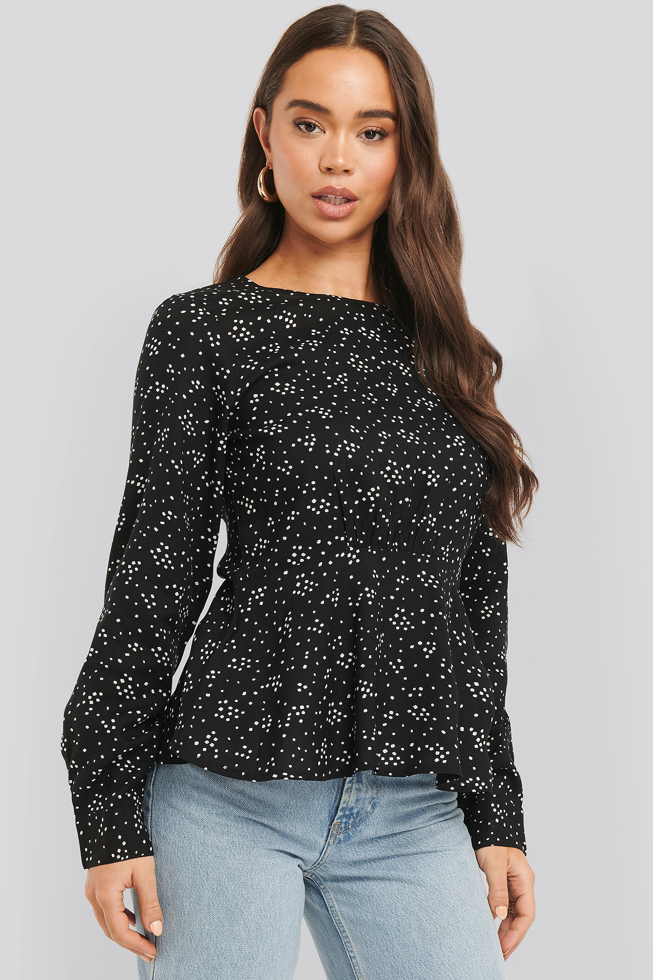 This blouse features a rounded neckline, a button closure behind the neck and at the cuffs, long sleeves and a marked waist.
