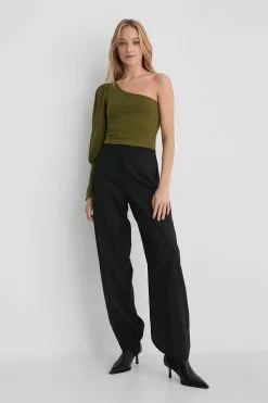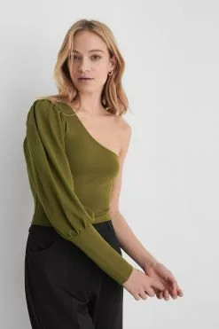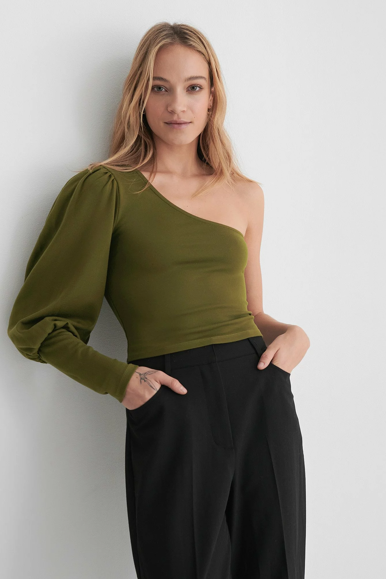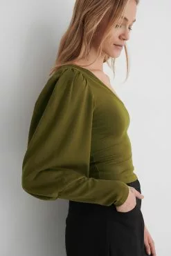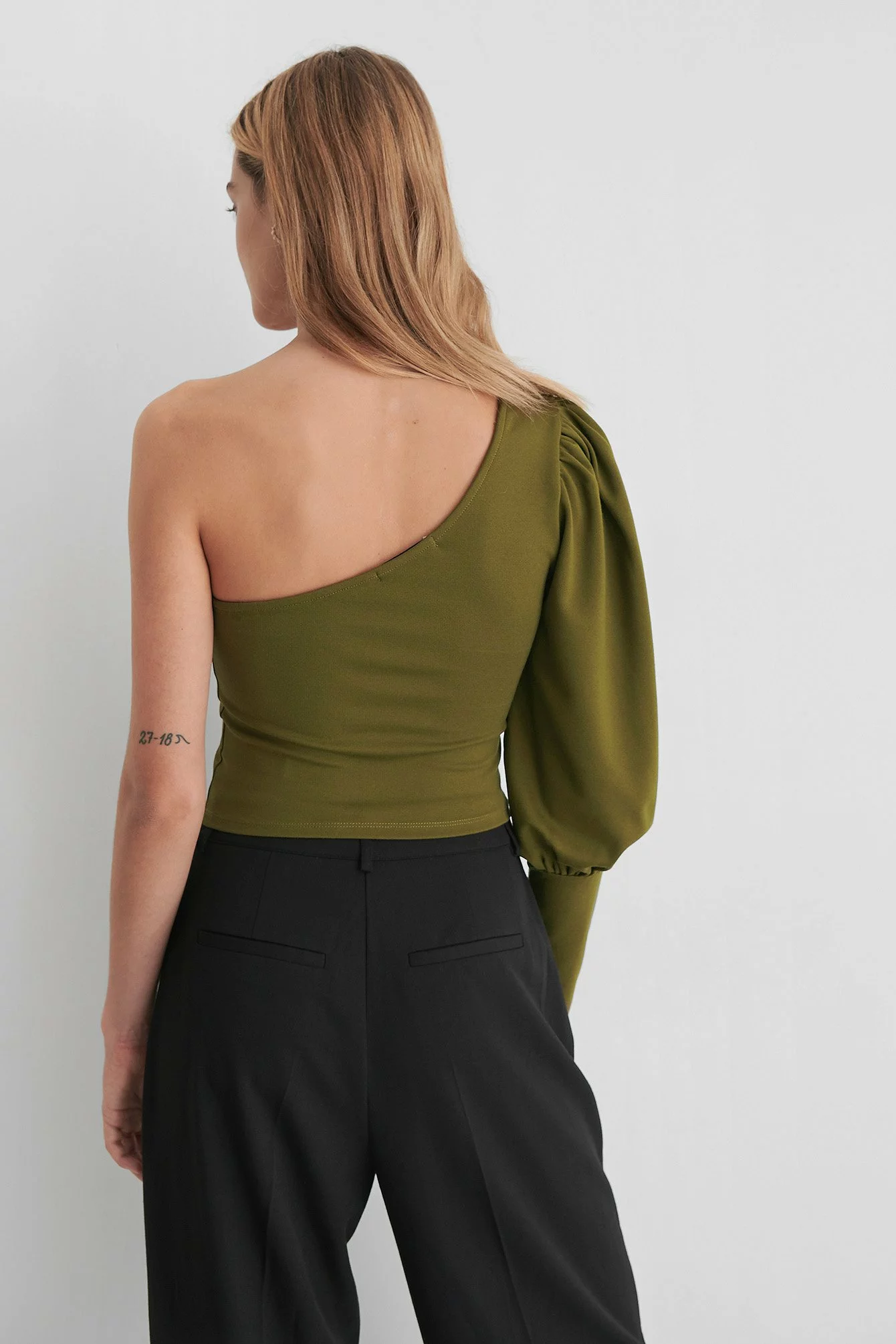 This top is cropped and features one balloon sleeve with a puffy shoulder and a tight cuff.