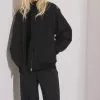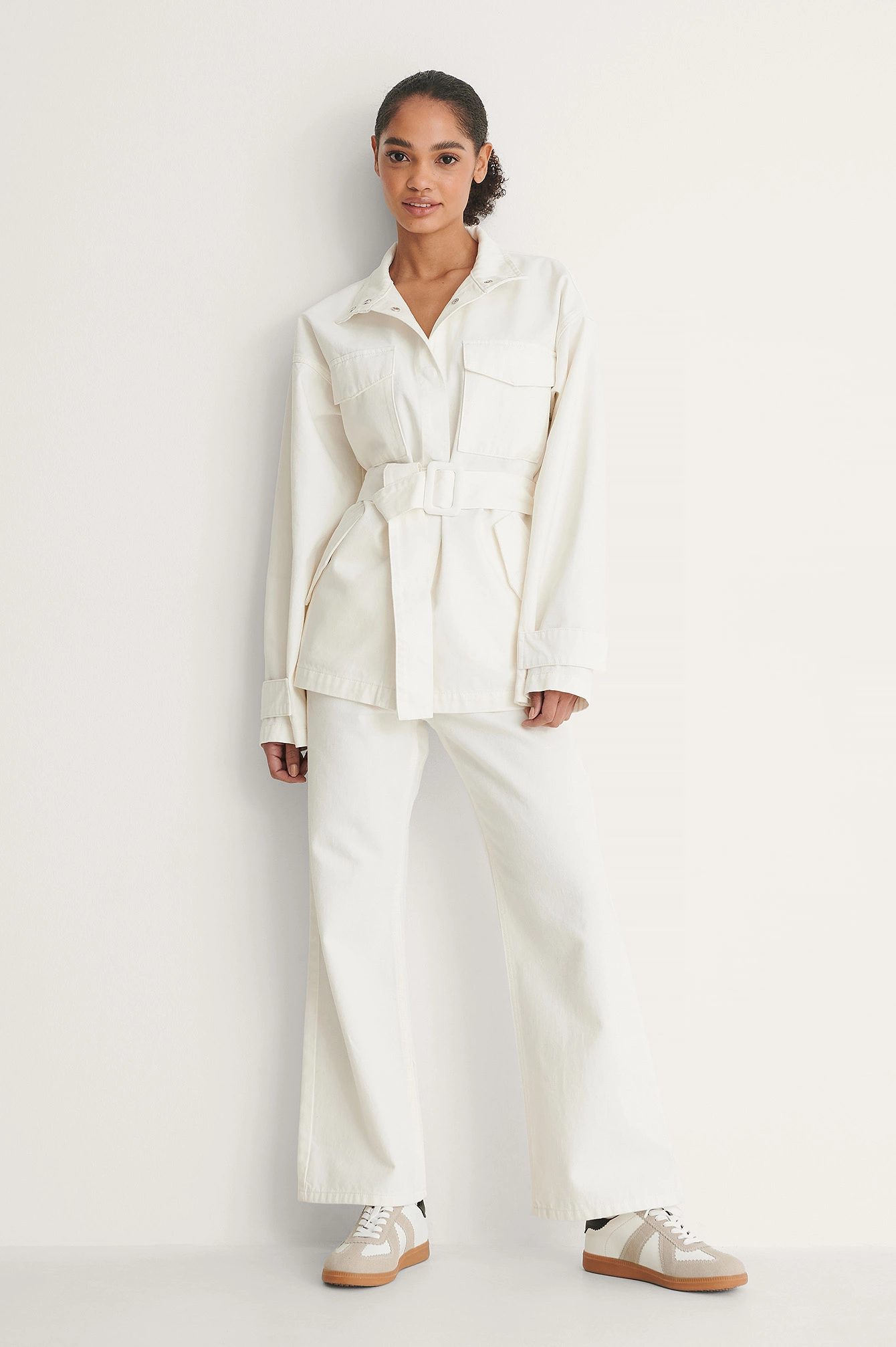 This jacket features a collar with a straight design. It has hidden snap button closures along the front and two snap button flap pockets on the chest. This jacket features two pockets on each side with a snap button closure, straight long sleeves with two snap button closures at the end, a removable waist belt and an oversized fit.