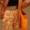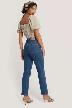 These jeans feature a high waist. They have a zipper and button closure and a five-pocket design. These jeans feature a twist detail on each leg, a tapered fit and a slightly stretchy material.
