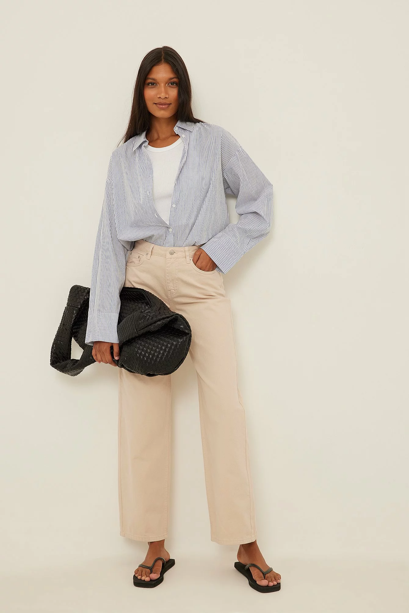 These jeans feature a mid waist. They have a wide leg and embellished pockets at the front. These jeans feature regular back pockets.
