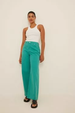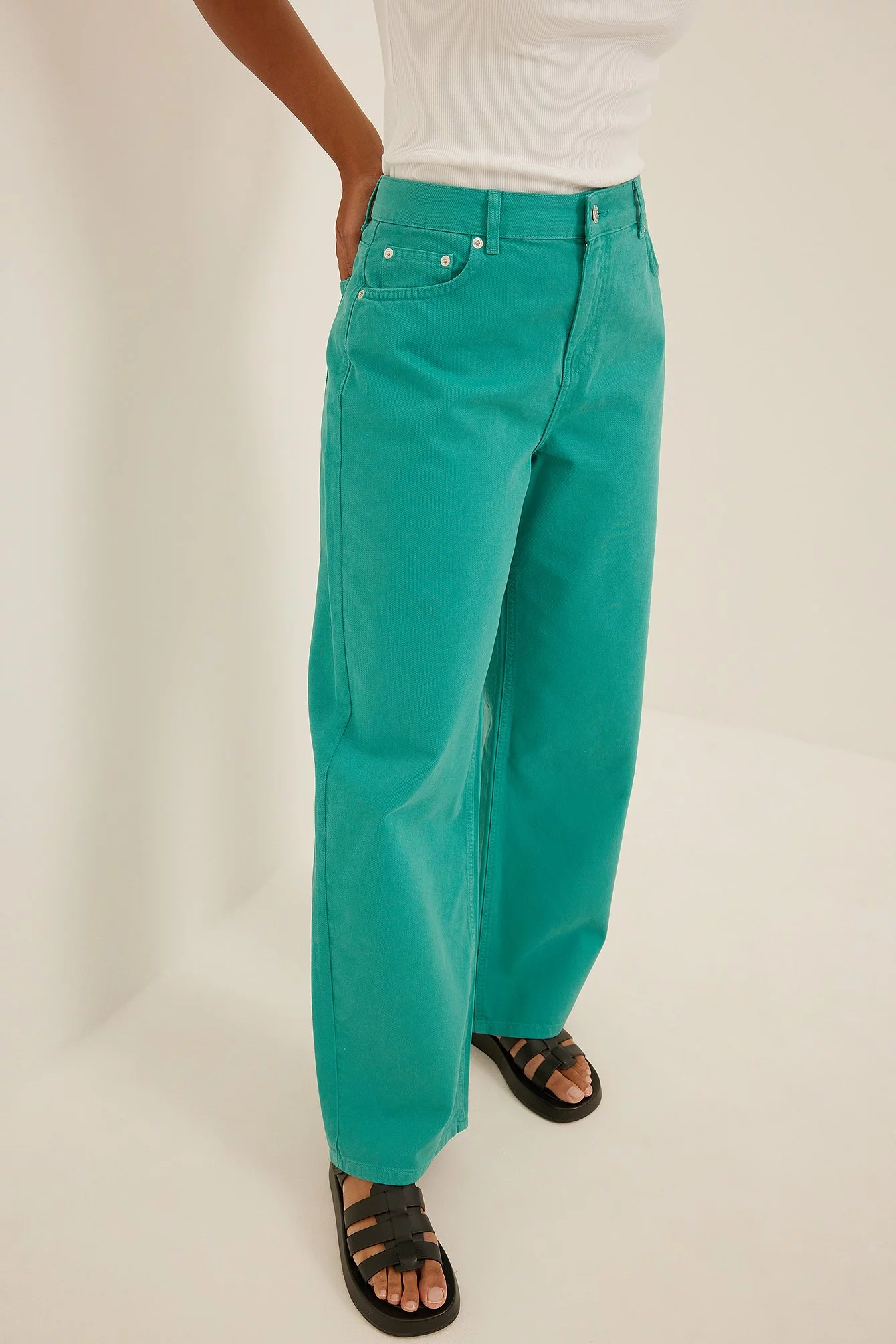 These jeans feature a mid waist. They have a wide leg and embellished pockets at the front. These jeans feature regular back pockets.