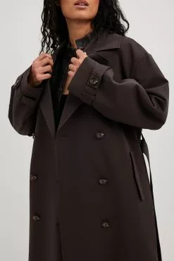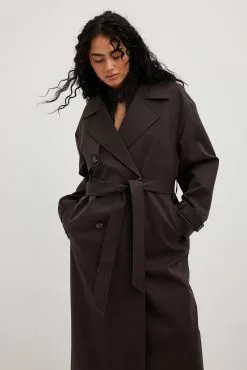 This trenchcoat is belted and features a long sleeve with a buckle detail. It has a lapel design and a double-breasted button design. This trenchcoat features side pockets with a flap detail.