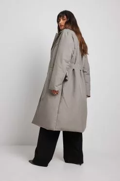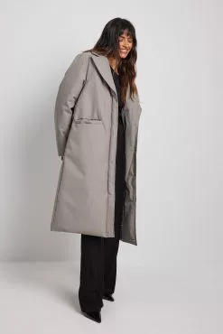 This coat is belted and features a blazer design, front pockets and a hidden button closure.