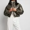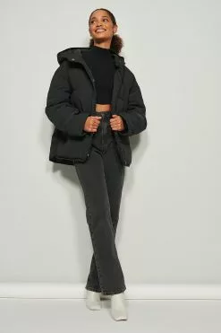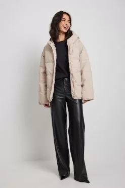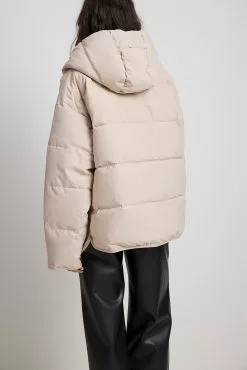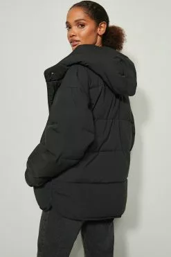 This jacket is padded and features a hood, 2 side pockets, a zipper closure with snap buttons and small side slits.