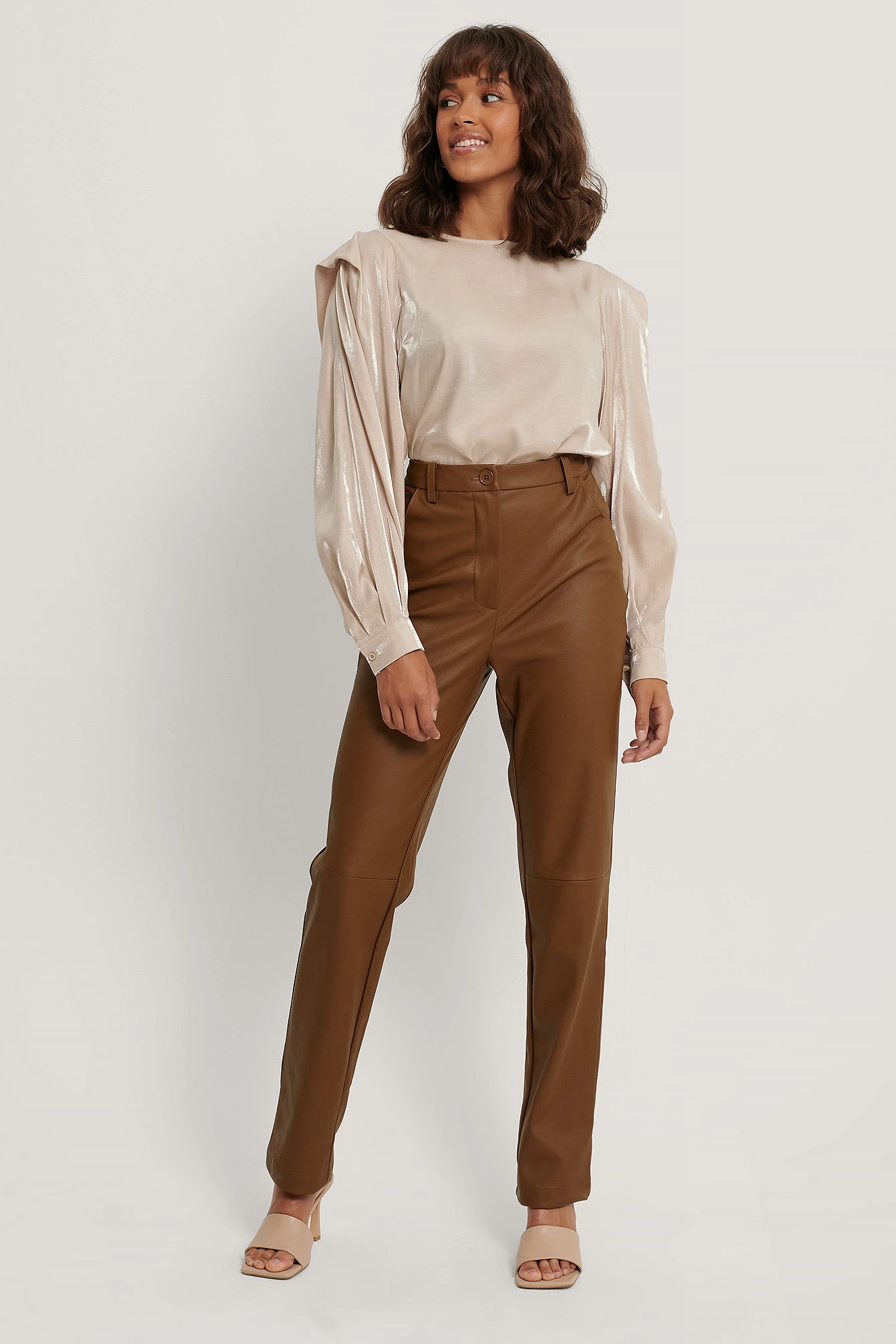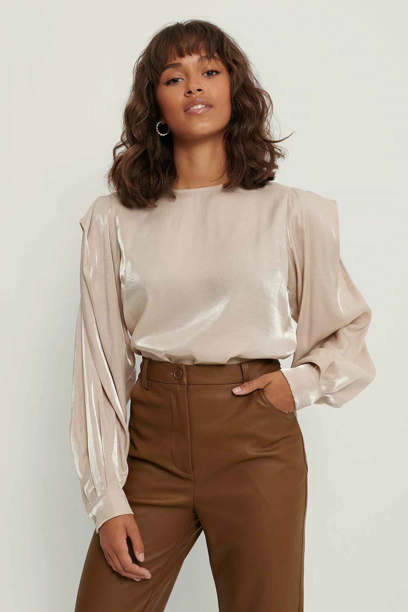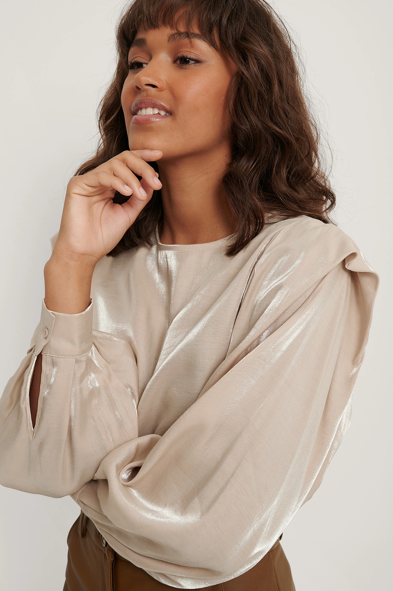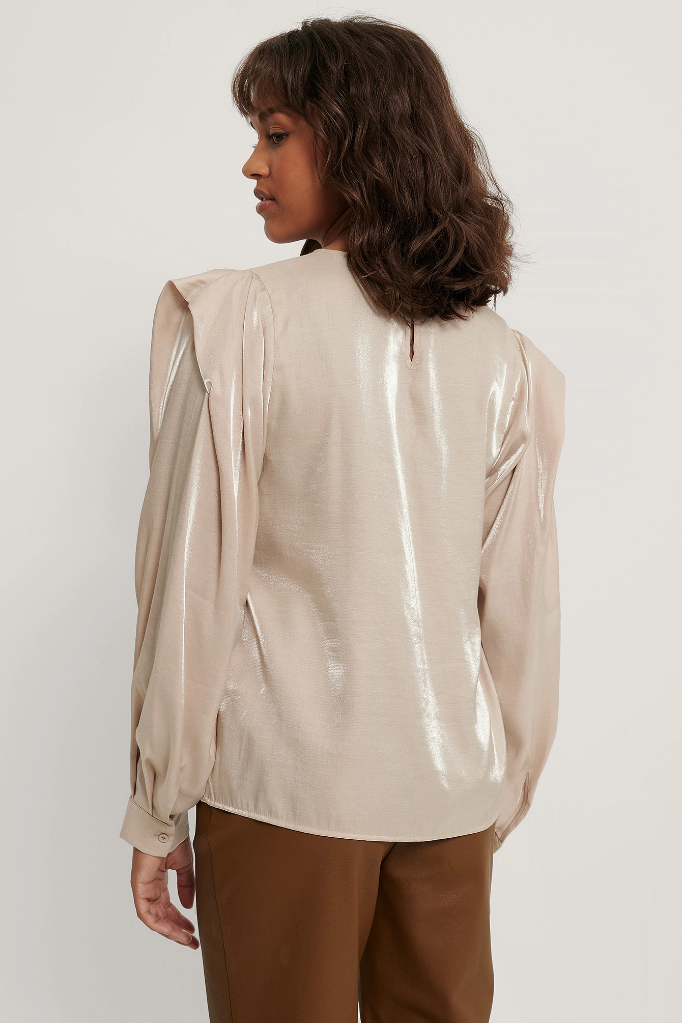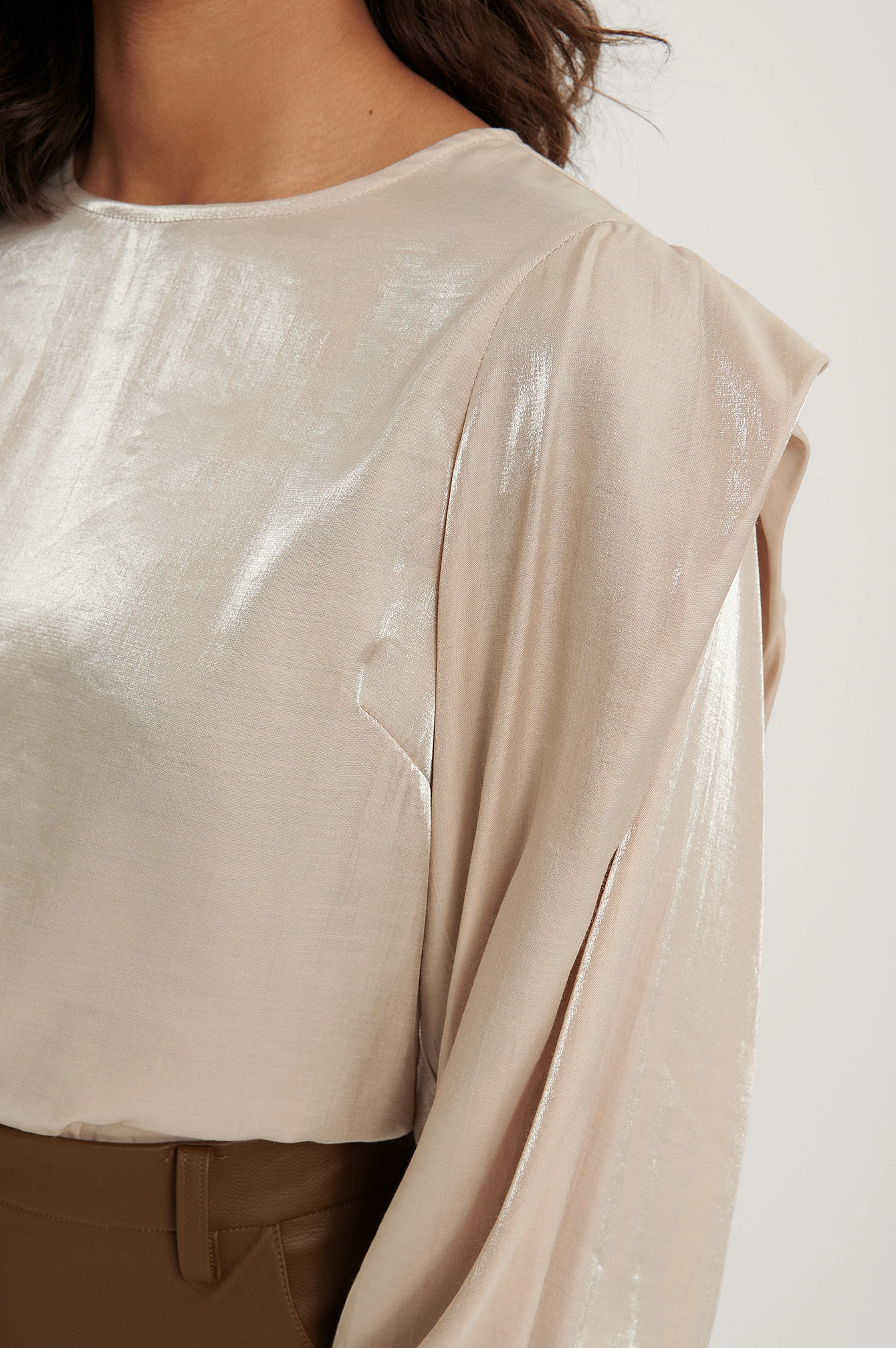 This blouse features a rounded neckline, a button closure at the back of the neck, puffy long sleeves with single button cuffs, details at the shoulders, gathered seam details on the sleeves and a shiny, soft material.