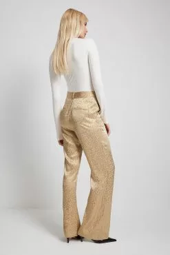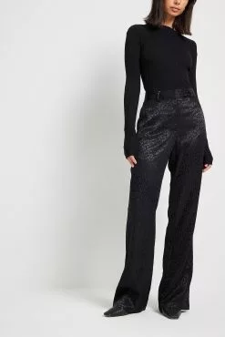These suit pants are jacquard patterned and made of satin and feature a high waist. They have side pockets and back mock pockets. These suit pants feature slightly flared legs. Inseam length in size 36: 81 cm / 31.88 in.