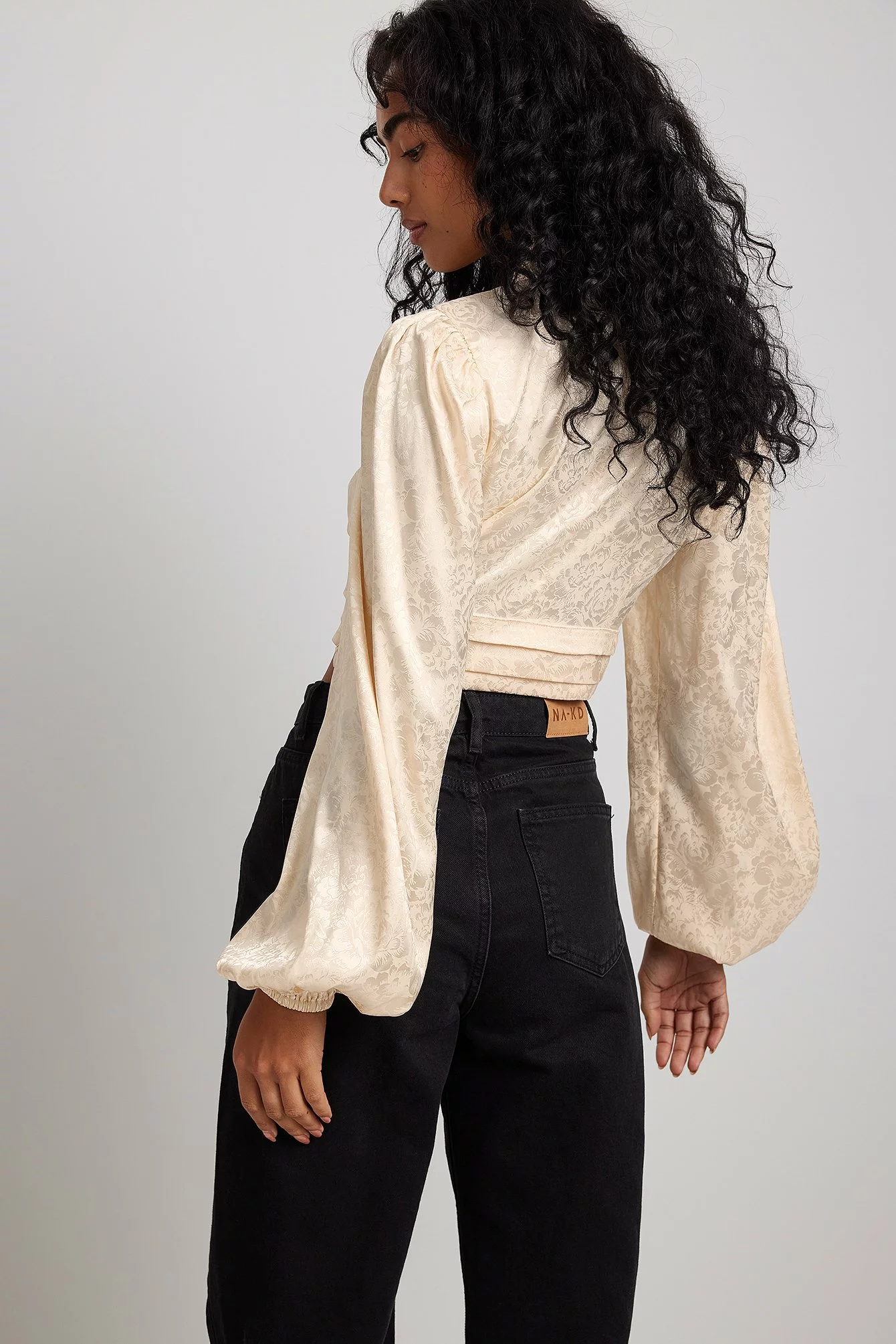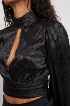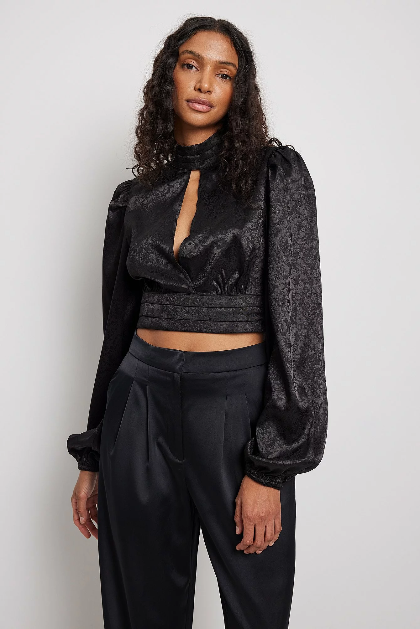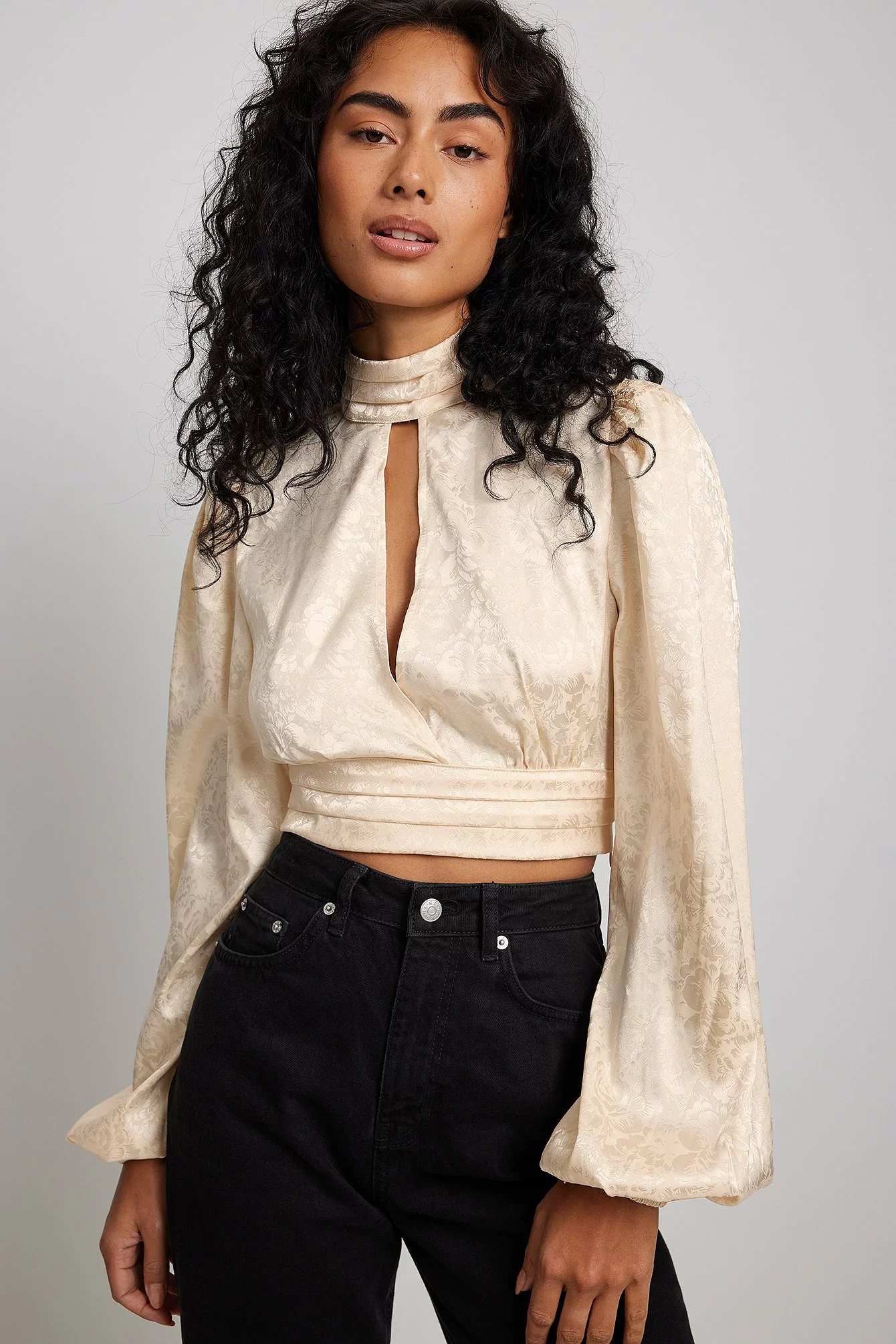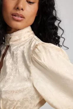 This blouse is patterned and features long sleeves with a balloon sleeve, a high neckline with a button closure, a gathered marked waist and a side zipper closure.