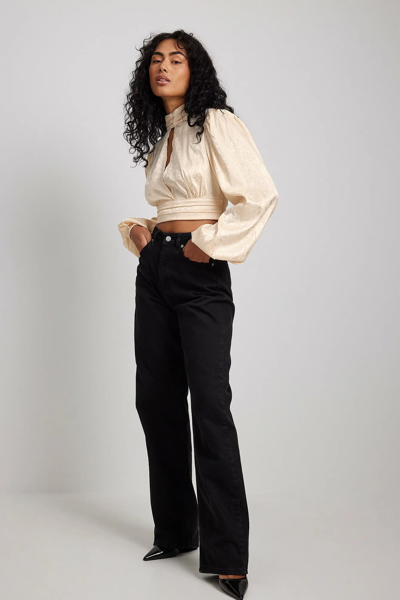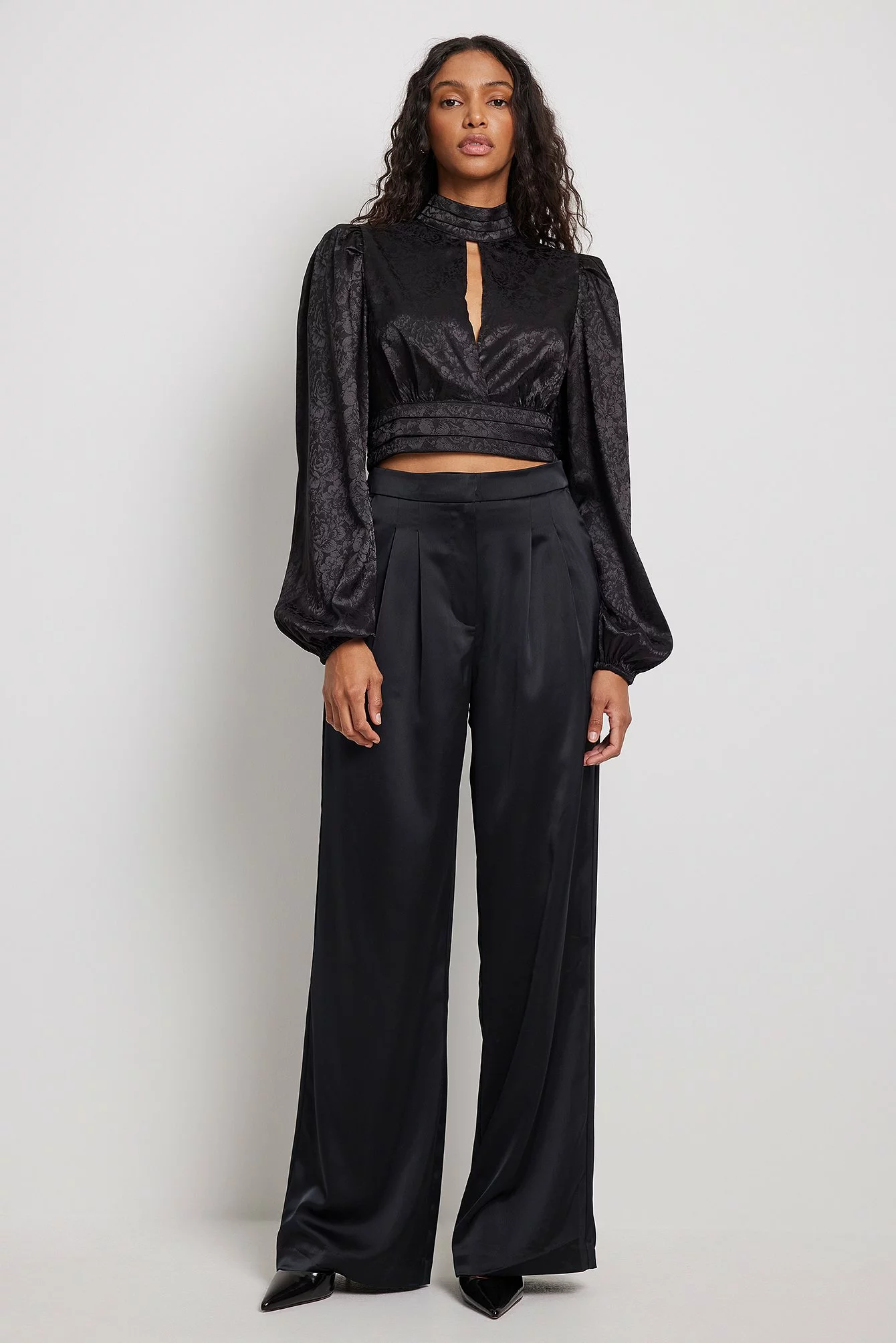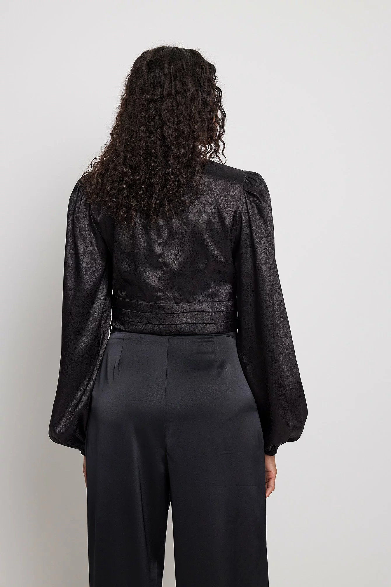This blouse is patterned and features long sleeves with a balloon sleeve, a high neckline with a button closure, a gathered marked waist and a side zipper closure.