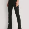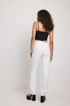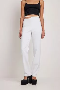 These trousers feature a cut out detail at the waist with an embellished buckle. They have a zipper on the side and gently tapered legs. Inseam length in size 36: 80 cm / 31.49 in.